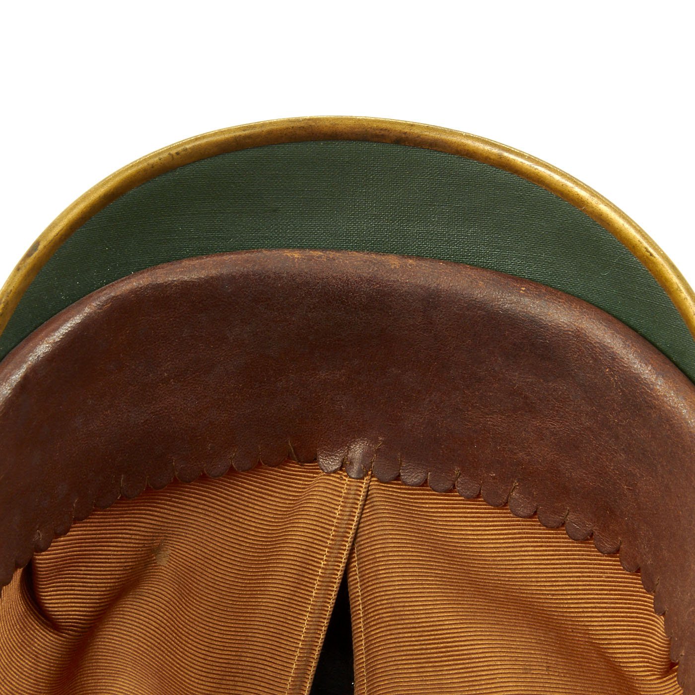 The top spike is very nice, with no dents, and has some nice side vents. It has all four of the gilt brass star retaining screws, and also the top half screws off for mounting of a parade plume. The helmet's interior reveals no depot marks on the back visor. It is approximately a size 7 3/8 US (59cm). There is definitely some age to the exterior finish, however it is just the usual crazing, with no major chips or other issues.