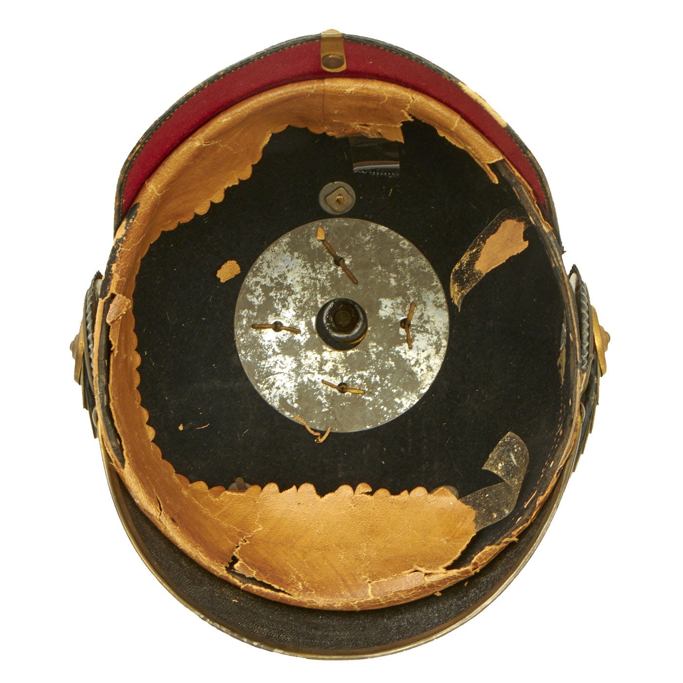Regardless of the unit, officer Pickelhaube share common features such as: the undersides of visors are lined, Officer Kokarden are carried, and the "egg & dart" Perlring was matched with star-pattern spike base brads, and chinscales were worn. The officer's Pickelhaube was basically unchanged from 1871 to 1899 when it had a more domed shape, and from 1899 to the end it had more of a skull shape. Otherwise, with the exception of the addition of the Reich's Kokarde in 1897, the officer's Haube was mostly the same from 1871 to 1918. While most pickelhauben are made from boiled leather, the main body of this example looks to be made of a felt lined "vulcanfibre" type material, which was lighter and less likely to deform.