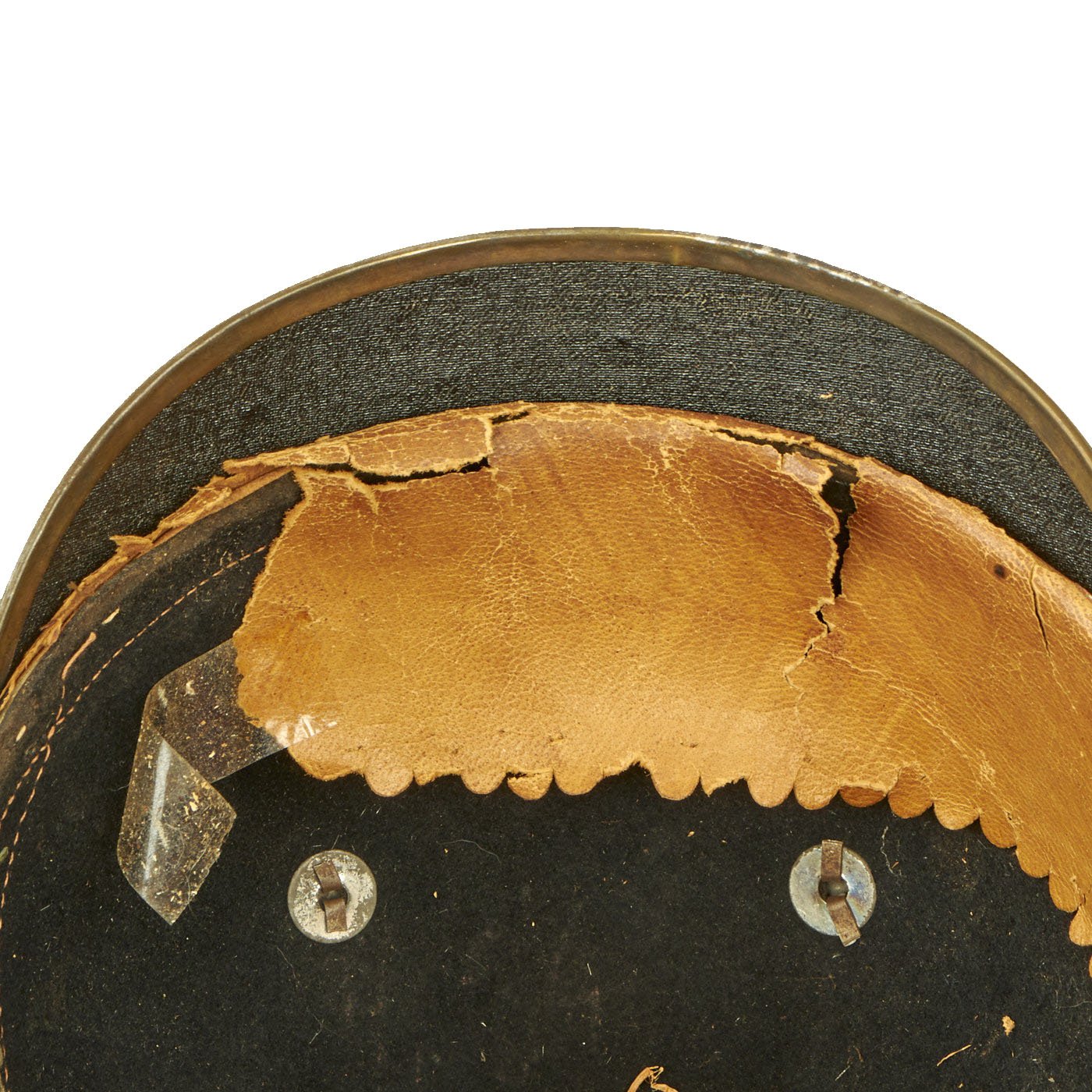 The helmet's interior reveals no depot marks on the back visor. The exterior is in great condition having no serious issues, just the usual light cracking. The shape of this pickelhaube is preserved excellently, with no sinking. The front and rear visor stitching looks to be fully intact, and hasn't rotted out as many do. The front still has its black lining, and the rear is lined in red.