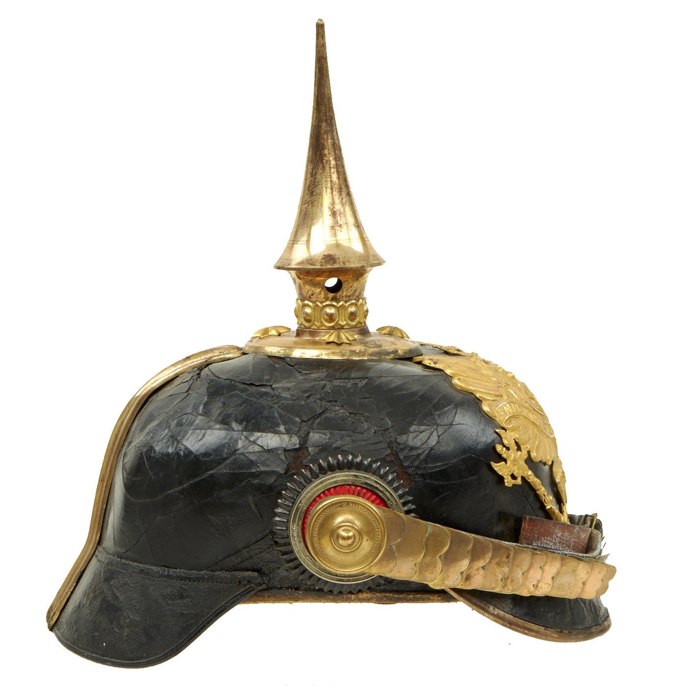 Original Item: Only One Available. This is a very nice high-end officer pickelhaube from a Prussian Infantry Regiment, which was ;most likely used during World War One. Unfortunately this example did not withstand the rigors of time very well. The fittings are all correct and in great shape, but the leather shell itself is degraded, and looks to possibly have been crushed. The black finish has flaked off in places, and the underlying leather is visible. It also may have a repaired tear, but we are not able to verify this without risking further damage.