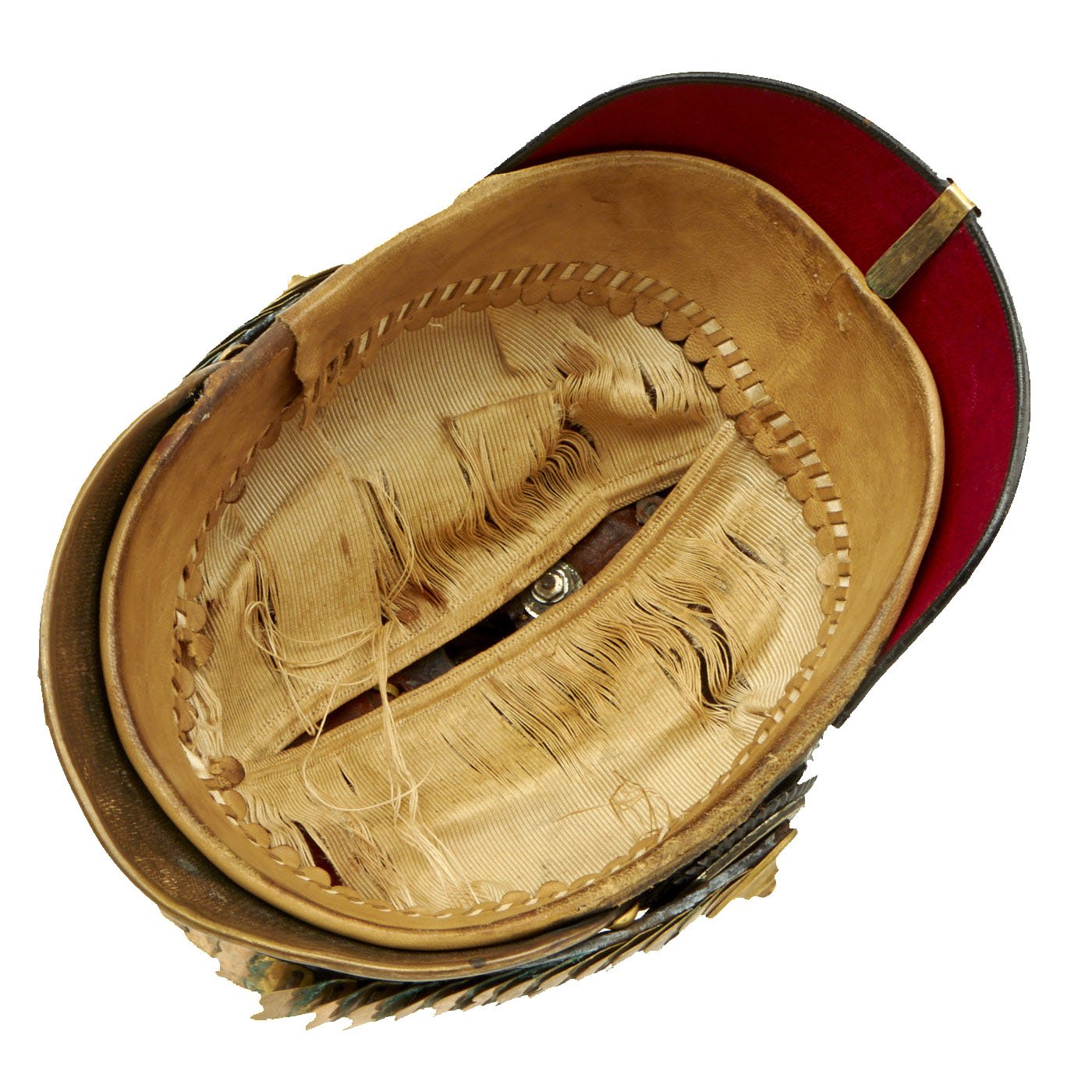 The overall condition of this officer's pickelhaube is very good, aside from the shell damage. Most of the helmet's furniture is highly-detailed gilt brass alloy, which now has a lovely aged patina. The Prussian wappen (coat of arms) features a large eagle with the King's motto, MIT GOTT FÜR KOENIG UND VATERLAND (With God for King and Country, i.e. Prussia). The Wappen is held in place by the correct officer style square nuts and washers. The chin scales are in great shape, with complete leather backing and front buckle and clasp.