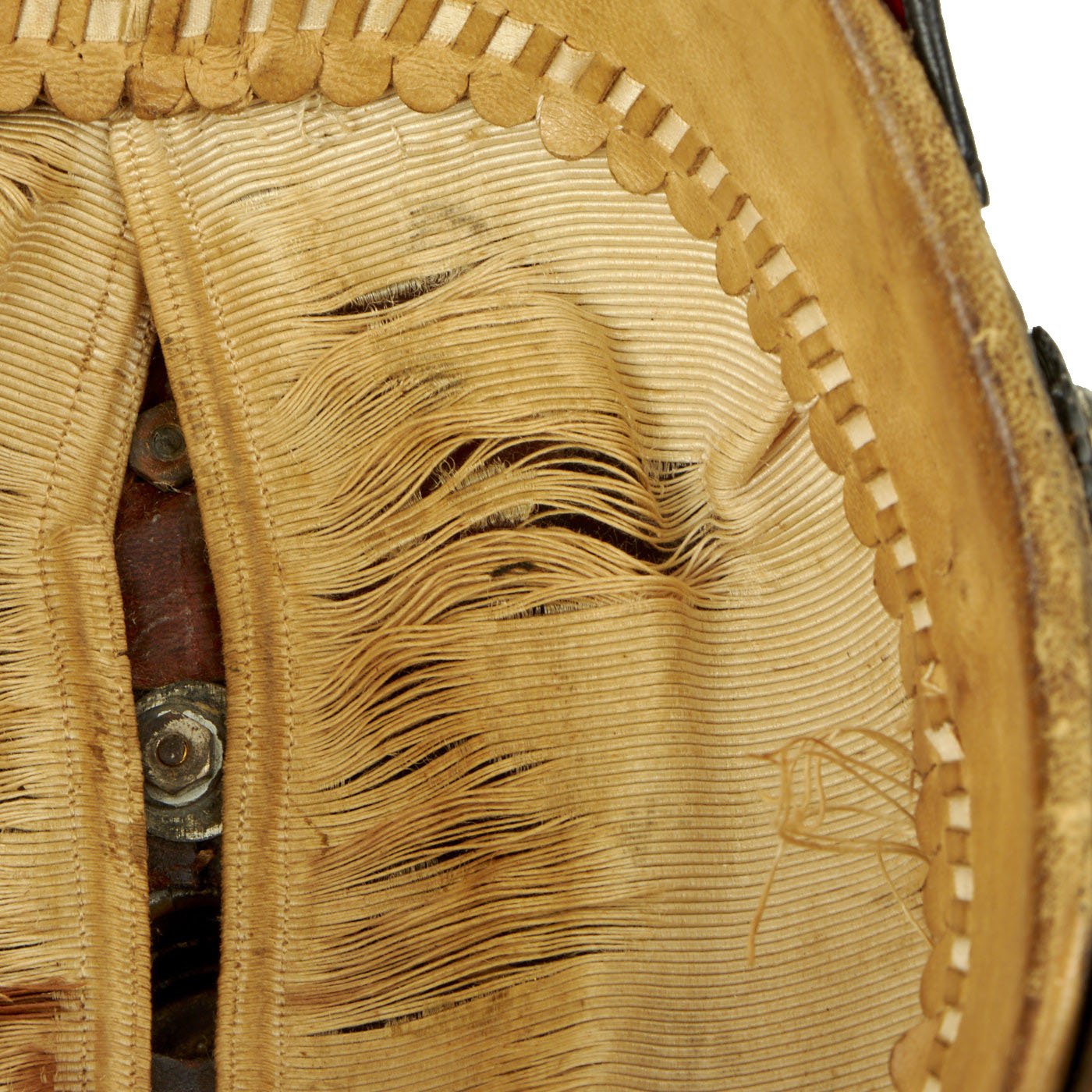 The inside liner is still present, complete with the original silk skull cap, though there is definitely deterioration from age and use. The sweatband is the correct doe skin leather, and is retained very well, though the silk has detached from the age in areas. The silk is split in places, though still looks good, with a nice cream white color.