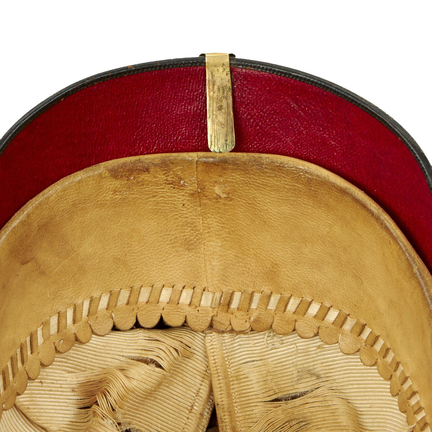The tall officer spike atop the helmet is intricately decorated at the base with "egg & dart" Perlring. The base cup still has all four 8 pointed stars, with some gilding still intact. The spike itself unscrews in the middle, which would allow the attachment of a fancy officer's plume for parades. The helmet has high end lined front and rear visors, with green in the front and read in the back, and no depot markings, as expected on an officer helmet. We were unable to see any markings on the inside under the liner. The front and rear visor stitching looks to be fully intact, and hasn't rotted out as many do.