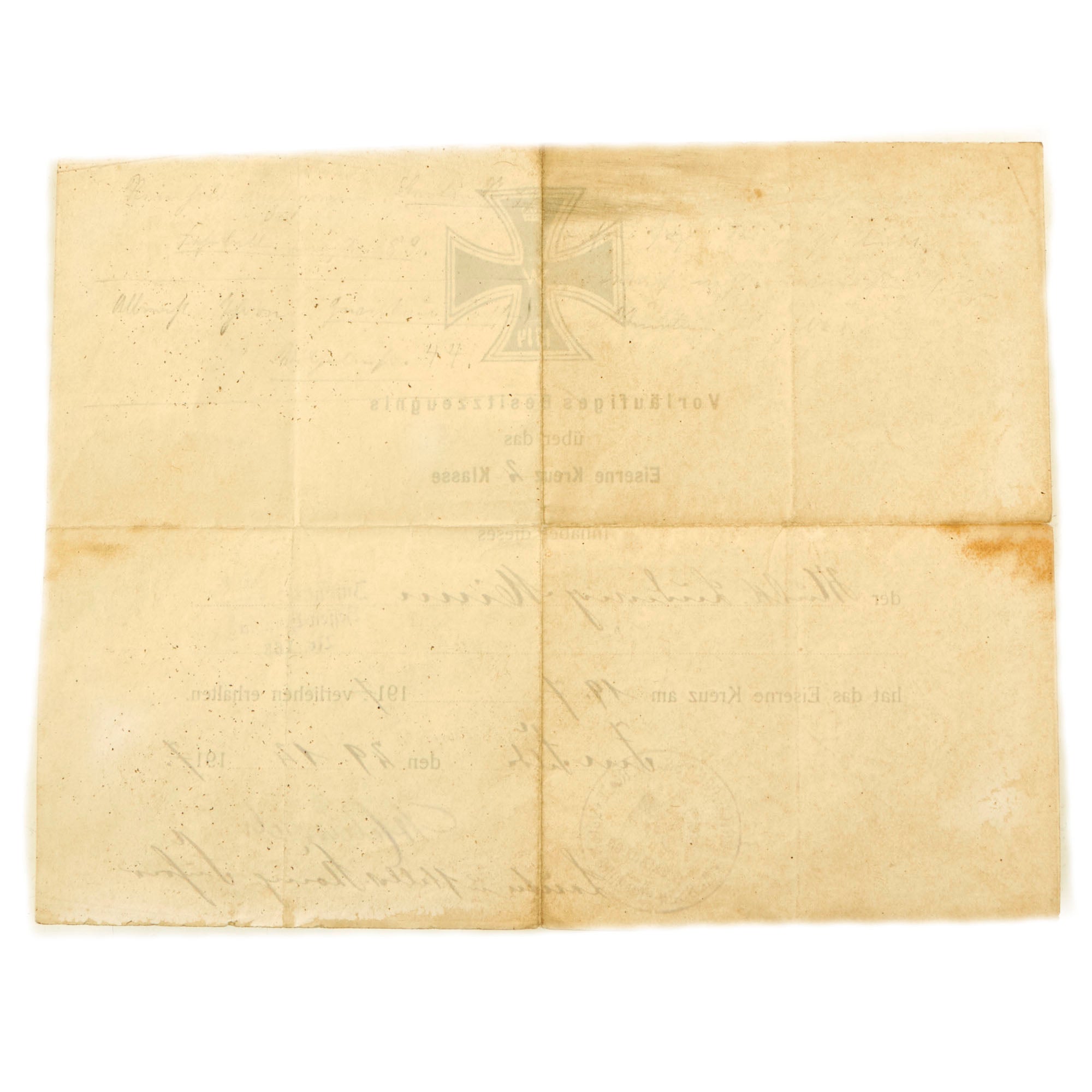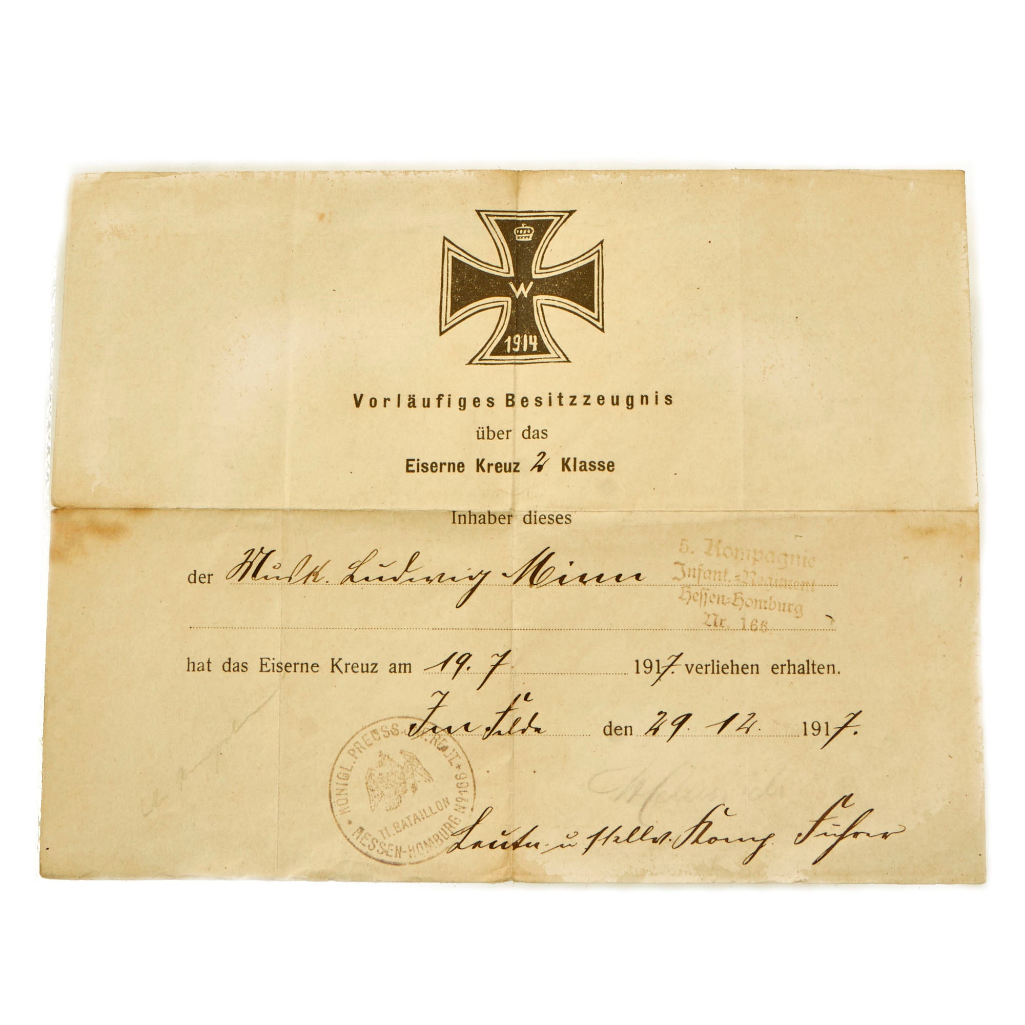 Unlike almost all other examples of WWI awards we have, this actually came to us with the original Vorläufiges Besitzzeugnis (Provisional Certificate of Ownership)! We are unfortunately not able to accurately read the name, but we can see that they were a member of the 5. Kompagnie Infant.-Regiment Hessen=Homburg Nr. 166 (5th Company 166th (Hessen-Homburg) Infantry Regiment), and were given the award on 19. 7. 1917.. The document has all the correct stamps and signatures, and could make an excellent research project!