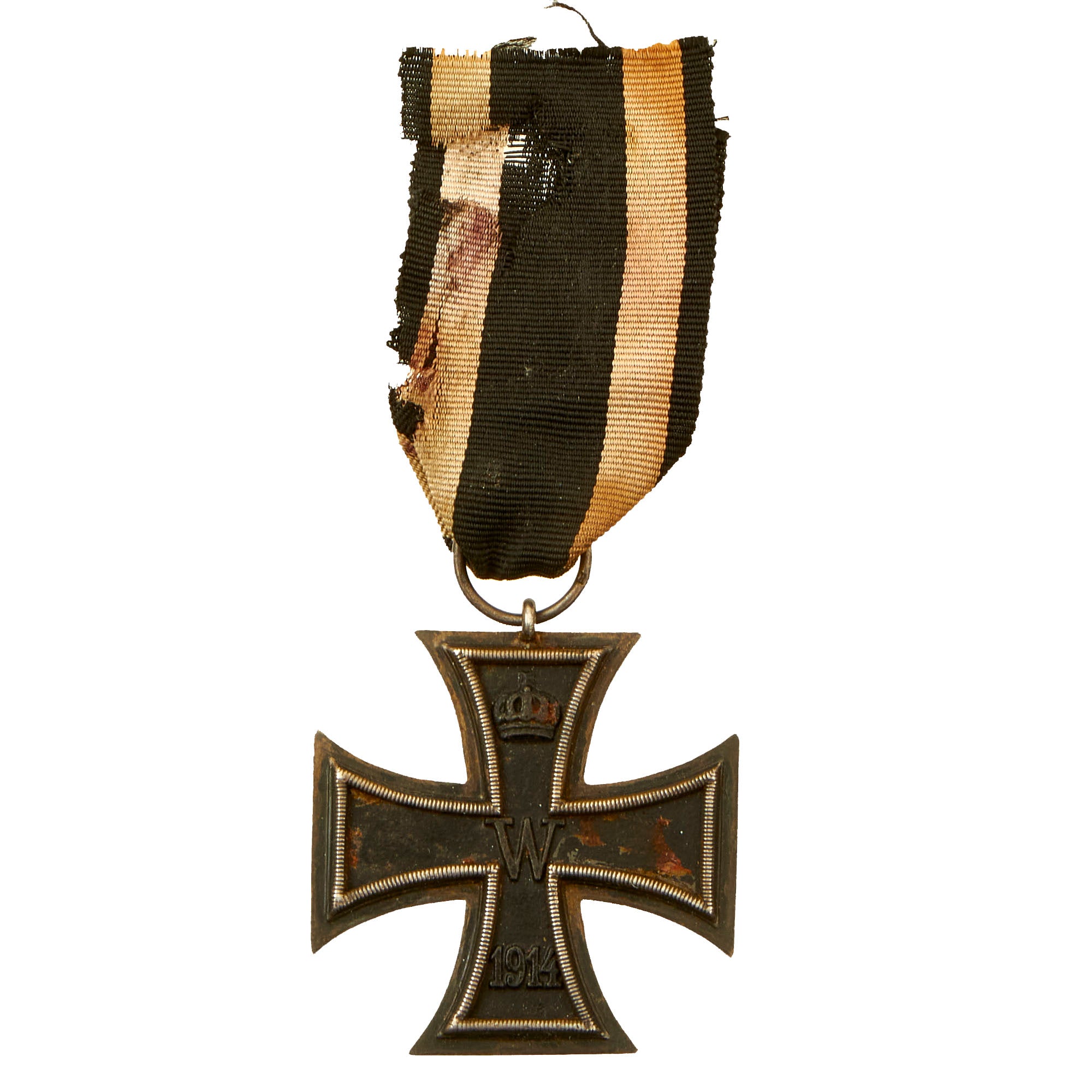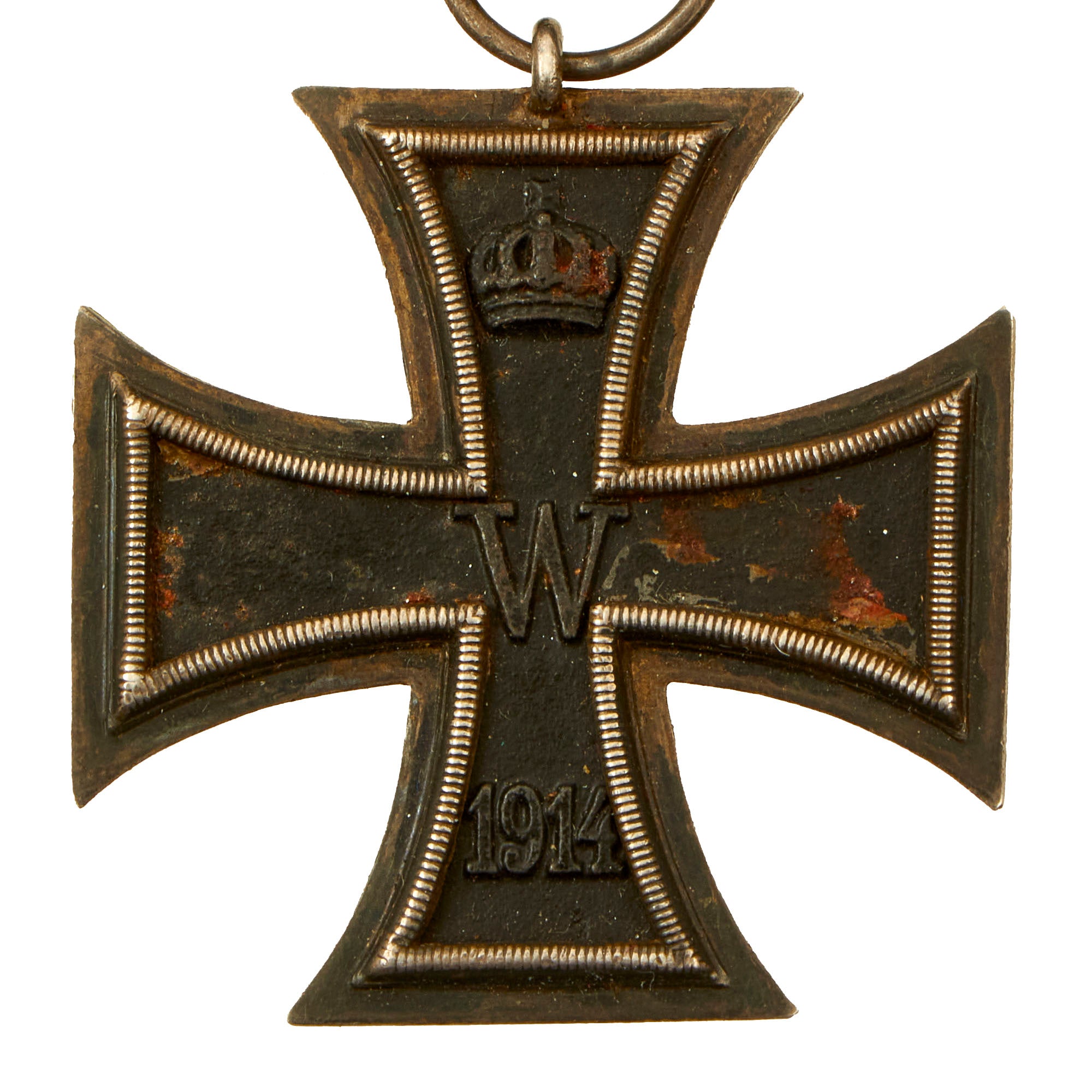 The basic design of the WW1 crosses is a central Tatzenkreuz (cross pattée) struck from iron and mounted in a silver frame which has a raised crenulated decorative border. The obverse of the cross bears the date 1914 under the crowned W monogram of Kaiser Wilhelm II. The reverse has the correct crowned FW monogram for Prussian King Friedrich Wilhelm III, over a sprig of Oak Leaves, with 1813 at the bottom. The top of the cross has a hanger ring to attach to the ribbon. This differs from the first class award, which has an unmarked back with an attachment pin.
