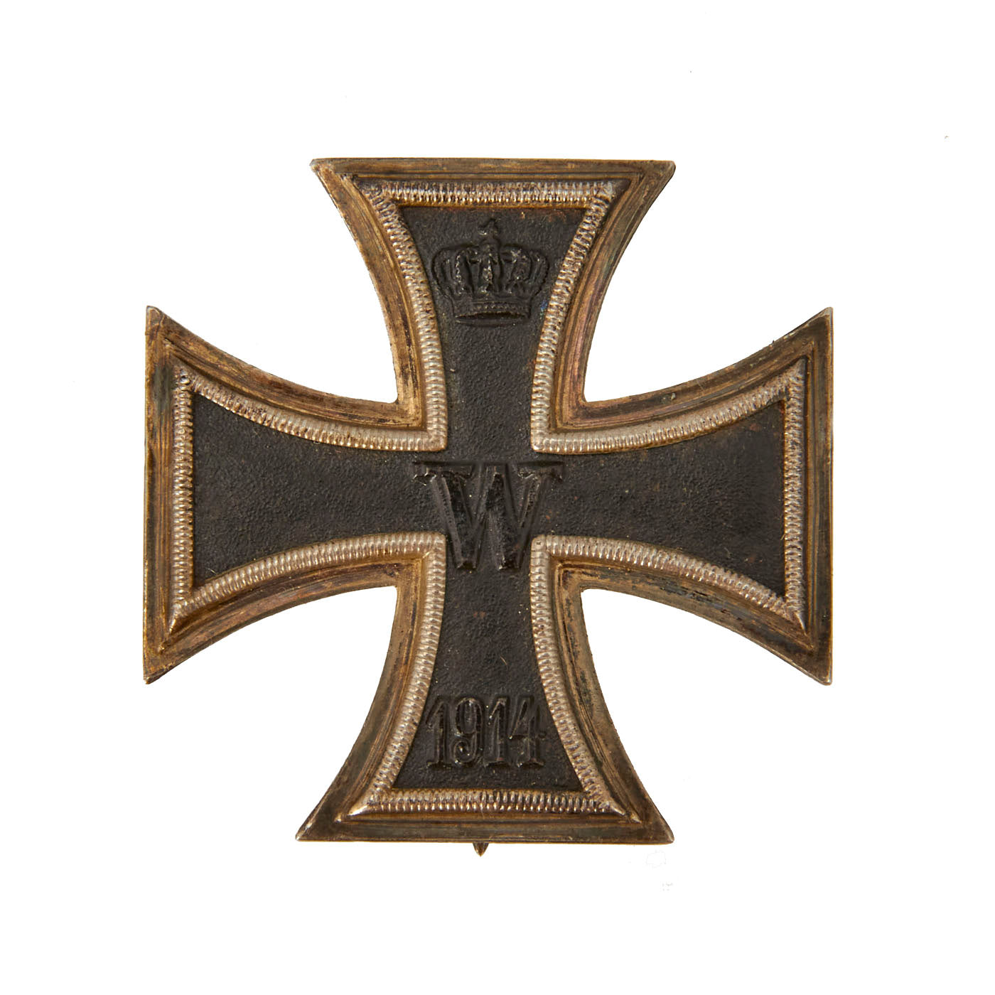 The basic design of the WW1 crosses is a central cross patee struck from iron and mounted in a silver frame which has a raised crenulated decorative border. The obverse of the cross bears the date 1914 under a crowned 'W' monogram. Second class crosses would have a ring at the top where a ring was attached, and had more markings on the back. The first class award however was meant to attach directly to the front of the uniform, and this example has a double barrel hinge, a soldered catch, and a securing pin. This pin is quite long, extended to the end of the cross.