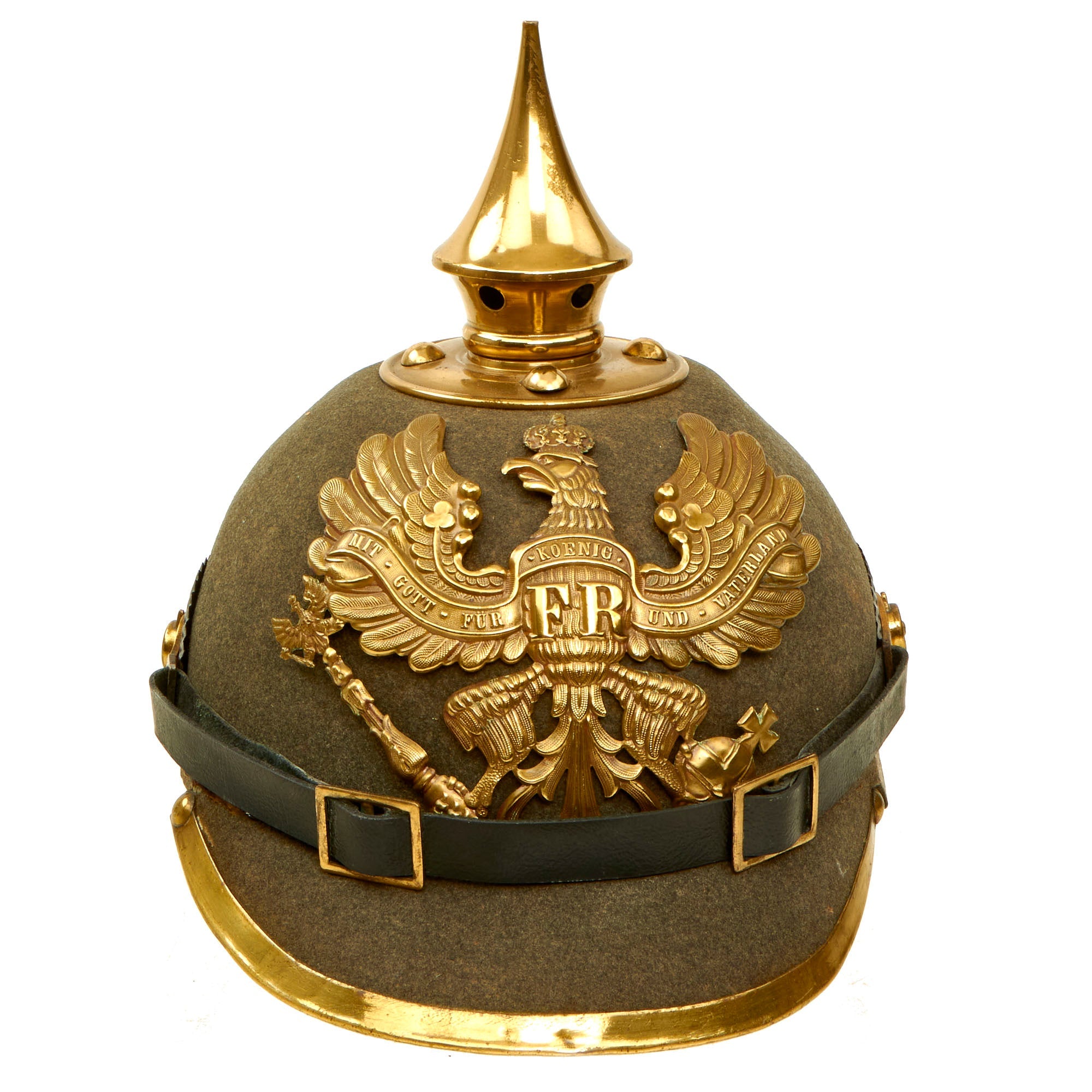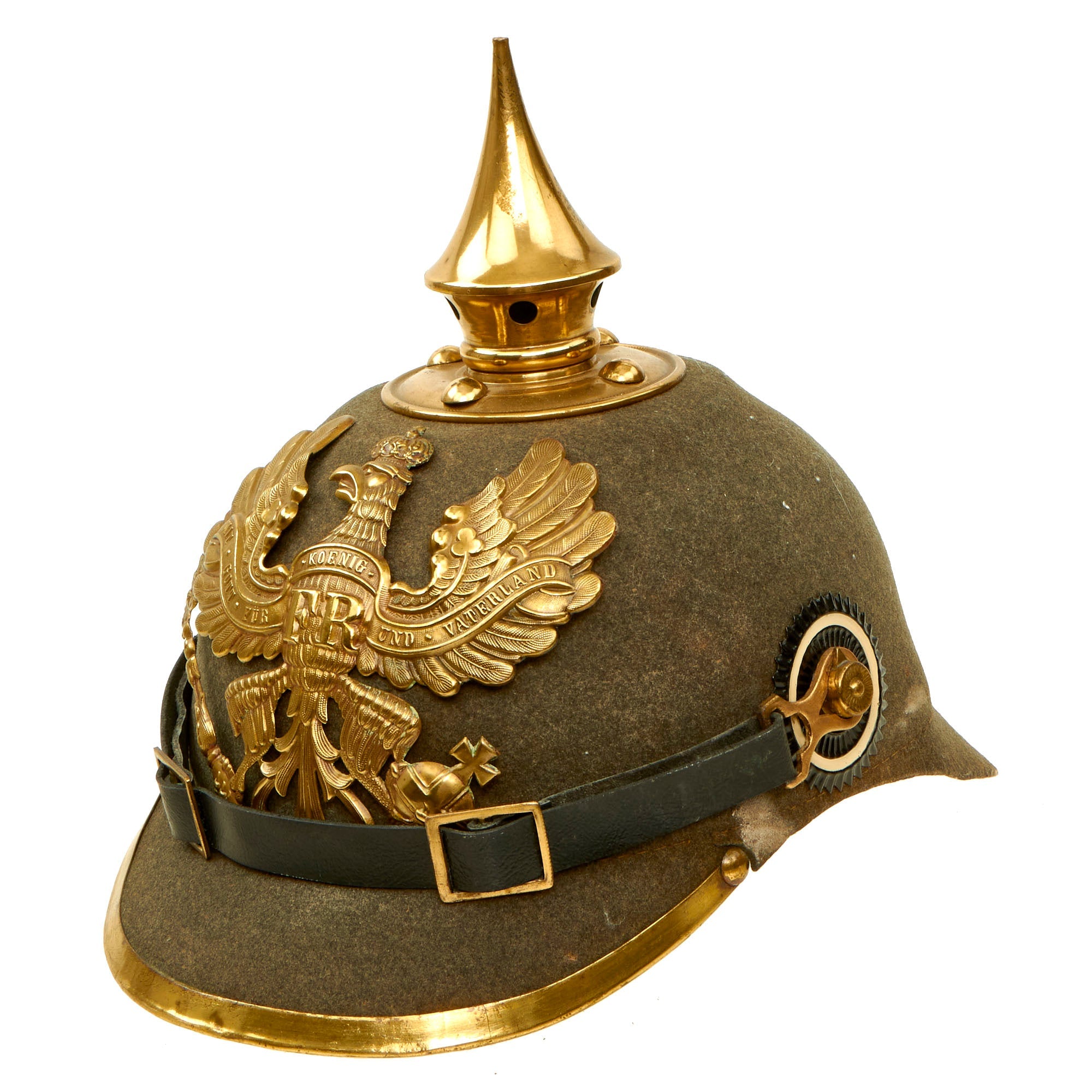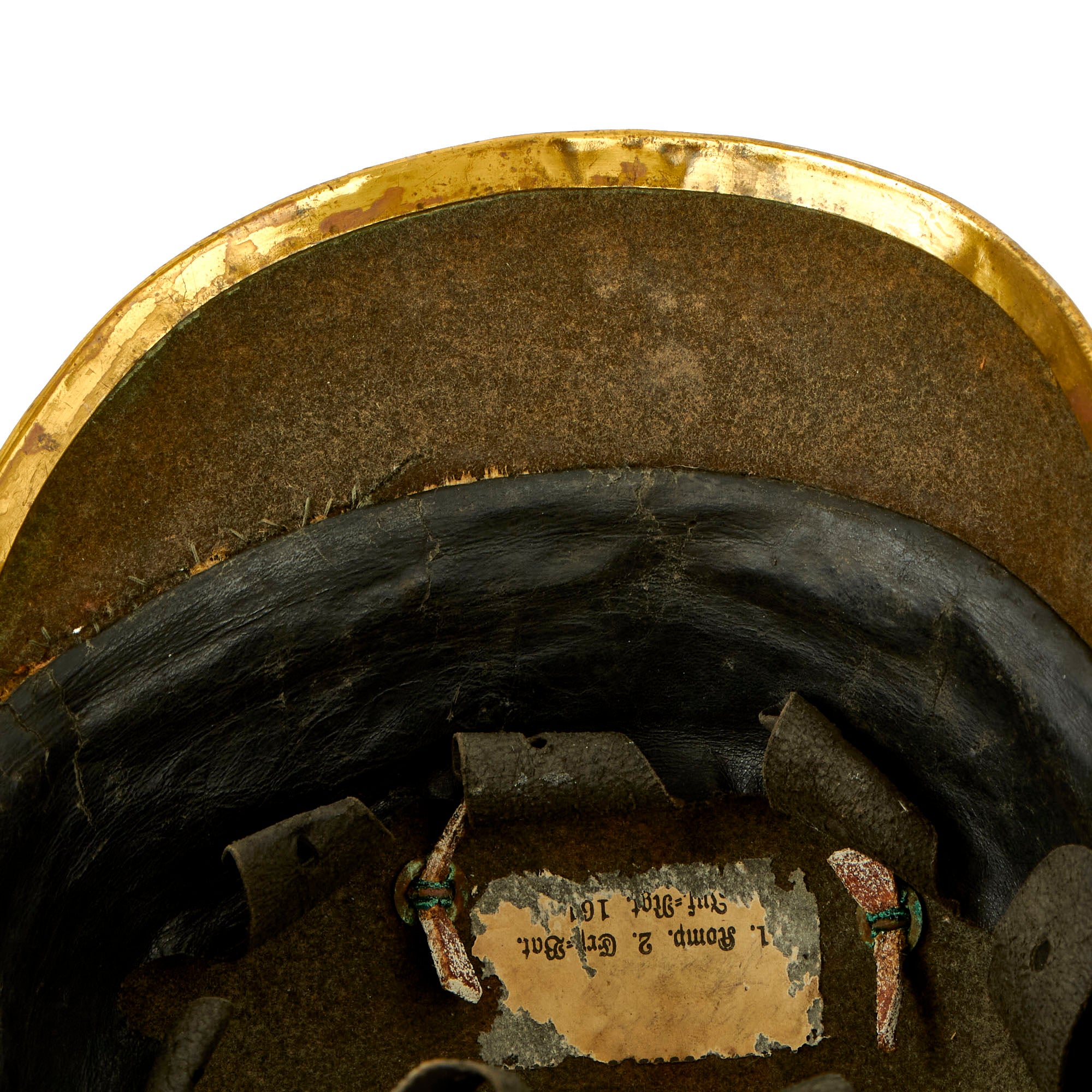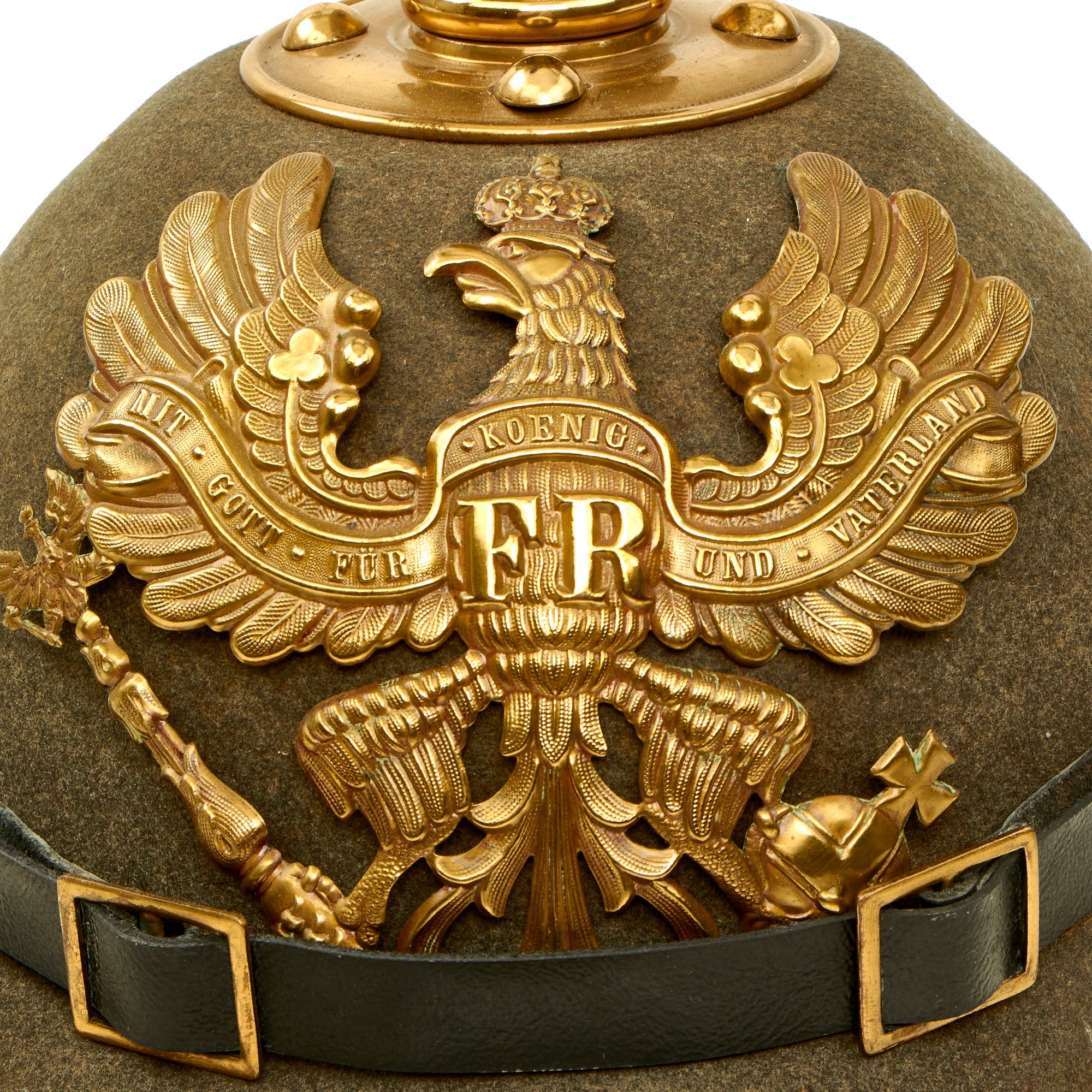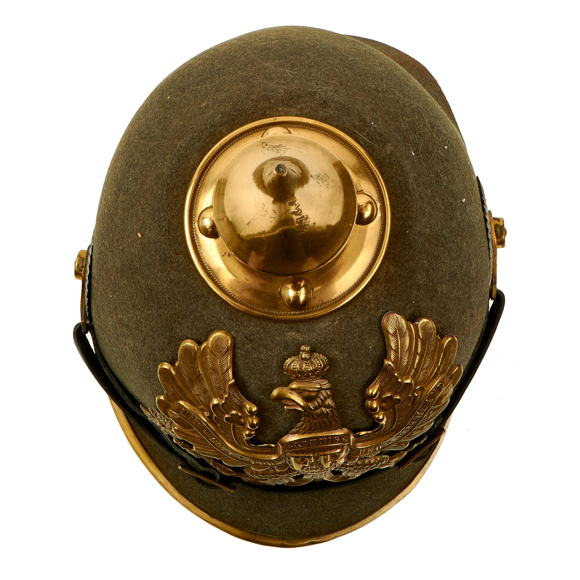 This helmet features a lovely gold-colored alloy frontplate (wappen) with the Prussian state eagle clutching a scepter and crown, over the King's motto, MIT GOTT FÜR KOENIG UND VATERLAND (With God for King and Country, i.e. Prussia). The Preußen issued Wappen in 1895 were intended to be made out of Tombak (an alloy made from a combination of copper and zinc) but it seems that the copper-color was unpopular and they were soon replaced with Aluminiumbronze which has a very bright brass appearance.