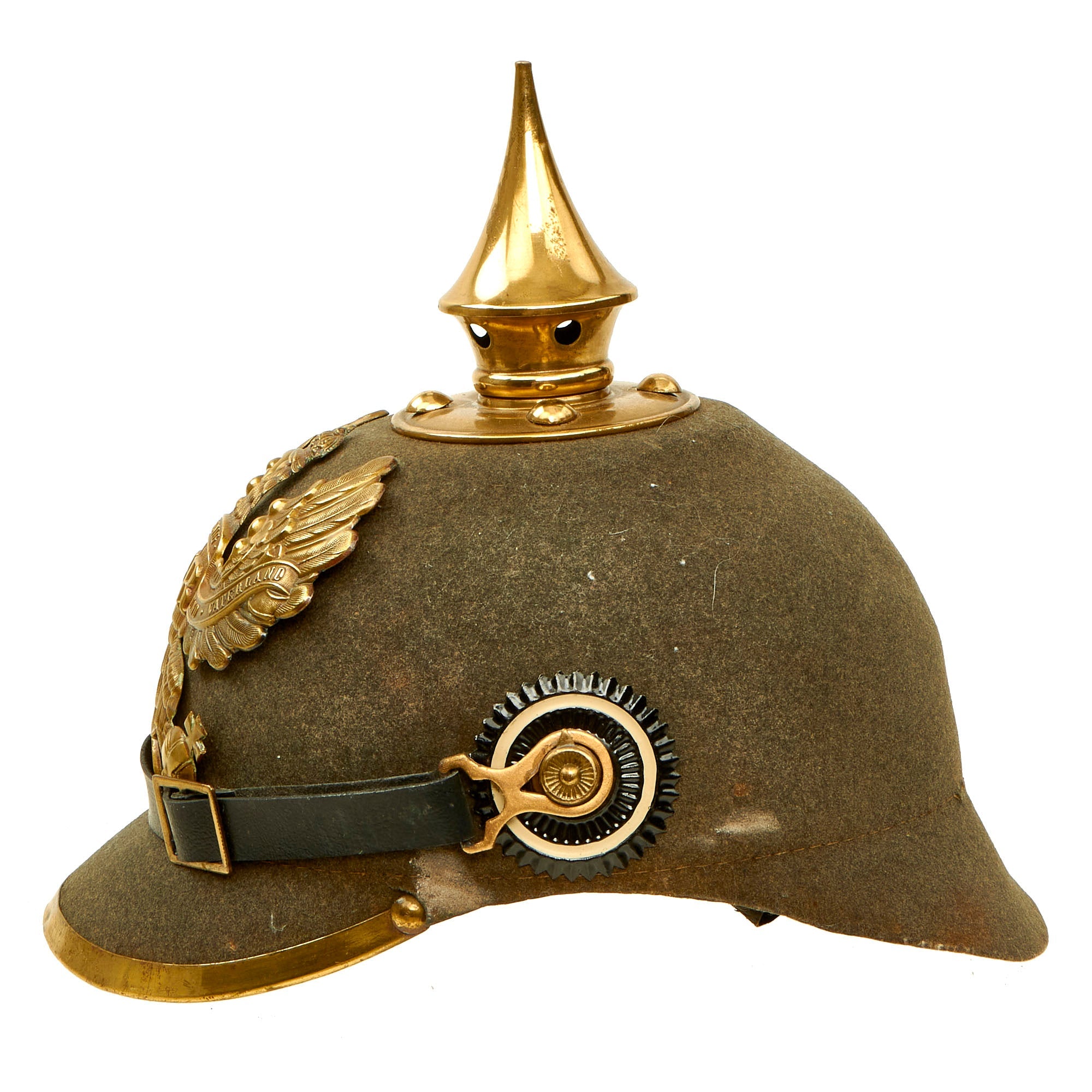 As the felt hat manufacturing industry was well established in Germany for hundreds of years, the hat industry stepped in to fill the void by producing Pickelhaube out of pressed and blocked felt, manufactured from rabbit fur or shredded wool. One advantage to the Filzhelme (felt helmets) was that they were normally pressed from one-piece of felt which significantly reduced production time. There were various variations produced, depending on when they were made and what materials for fittings were available at the time. First the brass M1895 fittings were used up, and then in 1915 the Filzhelm switched to the oxide coated steel. There are many examples of Ersatz helmet with both brass and steel fittings.