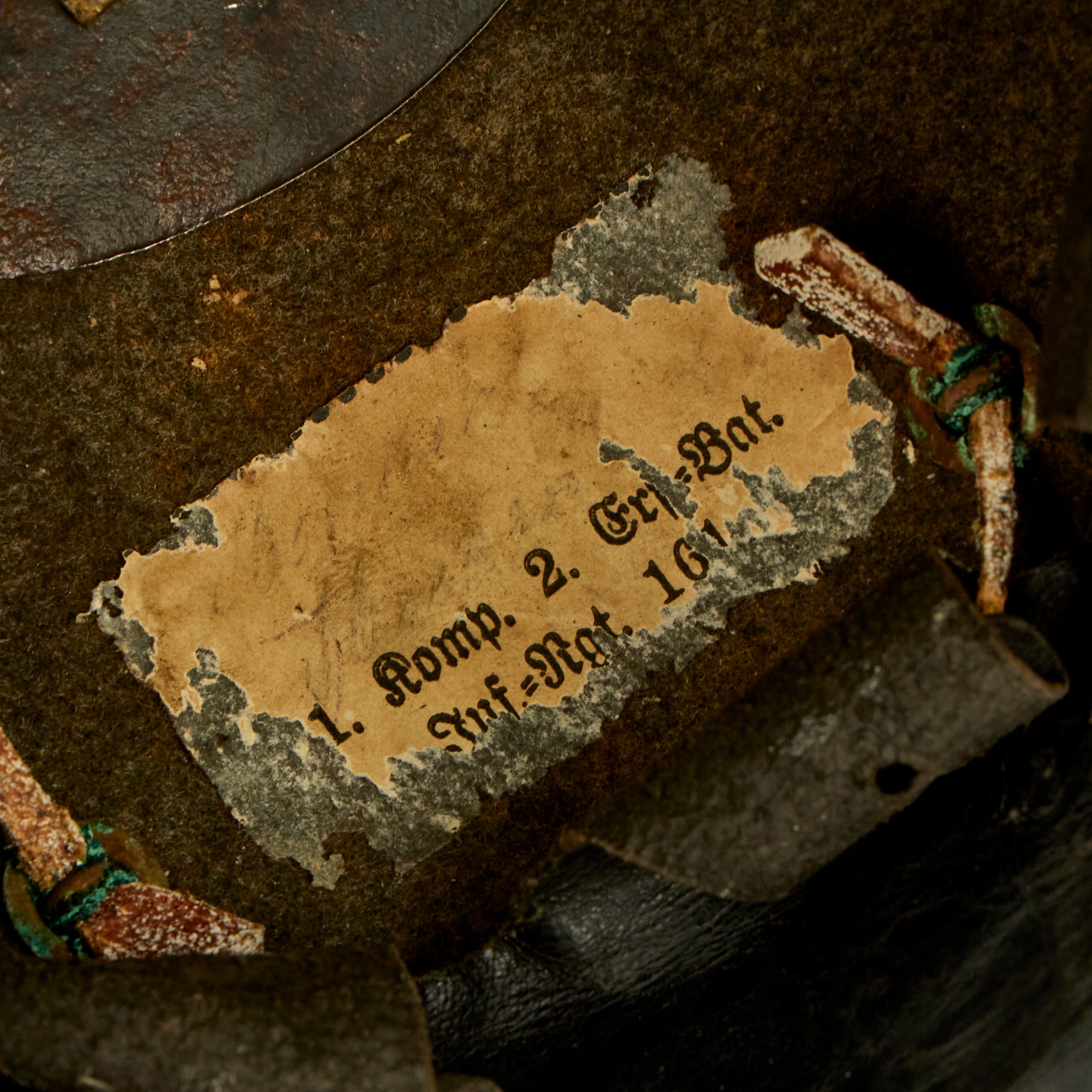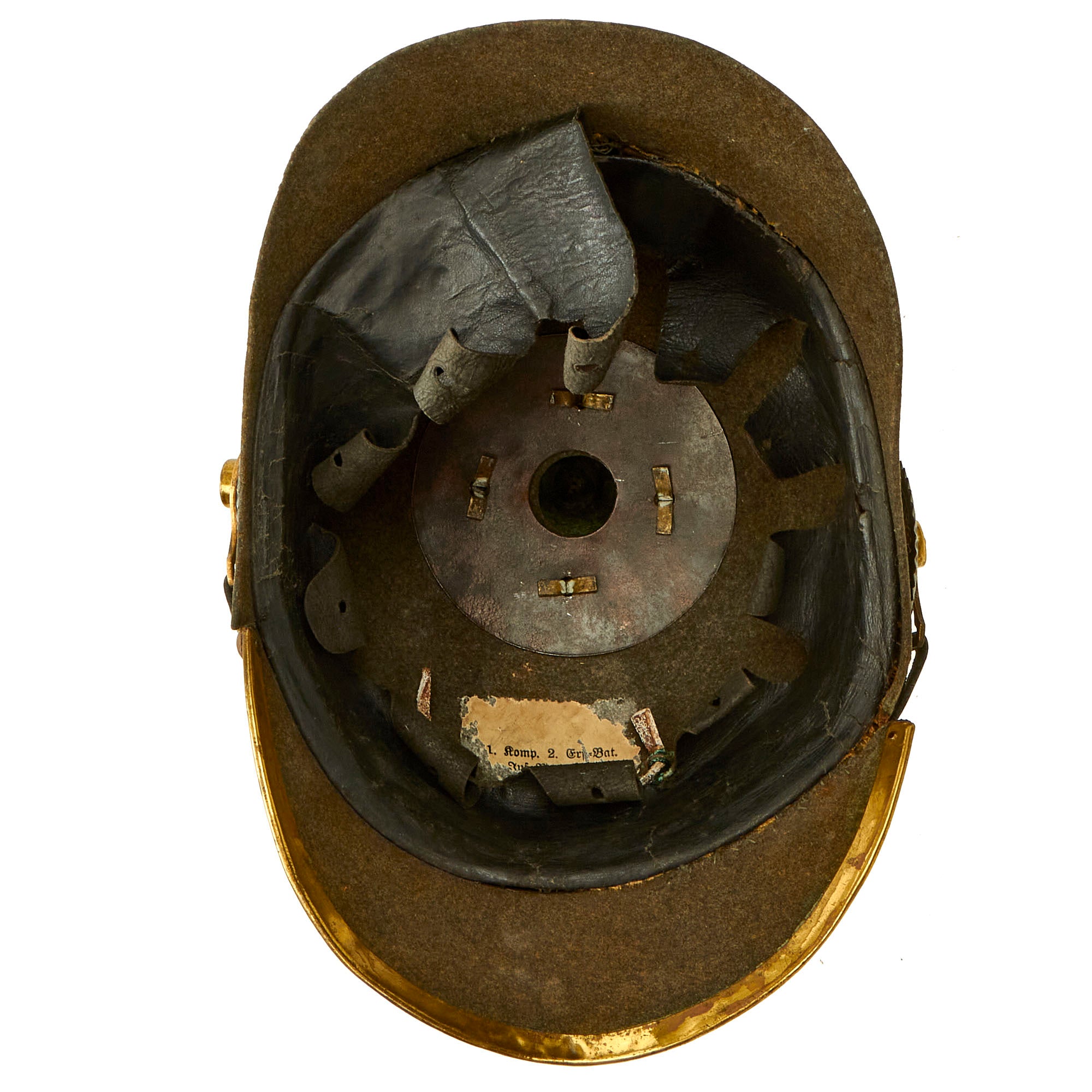 The soldered bolt and nut system used to secure the front Wappen onto the helmet was changed to a system for retaining Wappen on the front of helmets that had been used as far back as 1845 for Bayern (Bavarian) helmets and 1867 for Sachsen (Saxon) helmets. A soldered loop was affixed to the back of the Wappen which passed through corresponding grommeted holes on the front of the helmet. A leather wedge was then passed through the loop on the interior to keep the Wappen in place. Both Leather wedges are still present, and are original.