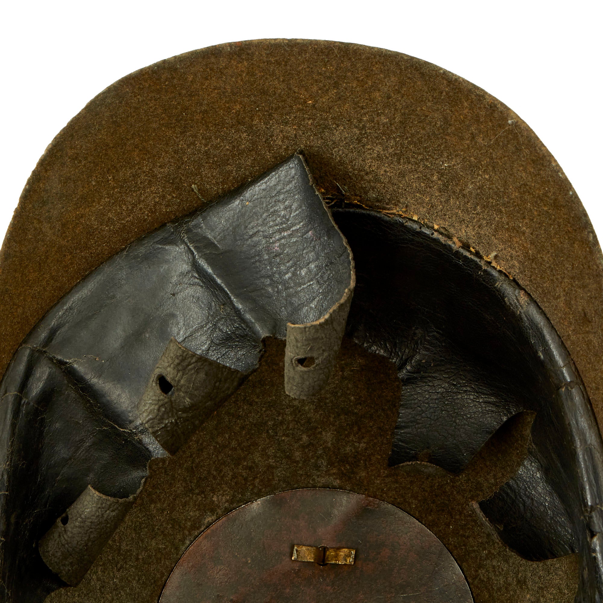 The exterior of the helmet is in good condition. The rear visor appears to have separated at one time, and was glued back together. A minor detraction, which is barely noticeable when the displayed. There is dirt in areas as well as some stains, as expected from a helmet over 100 years in age. This example has front vizor brass trim in very good condition, with just a bit of rippling. Later versions of the Felt Helmets would have rolled over edges.
