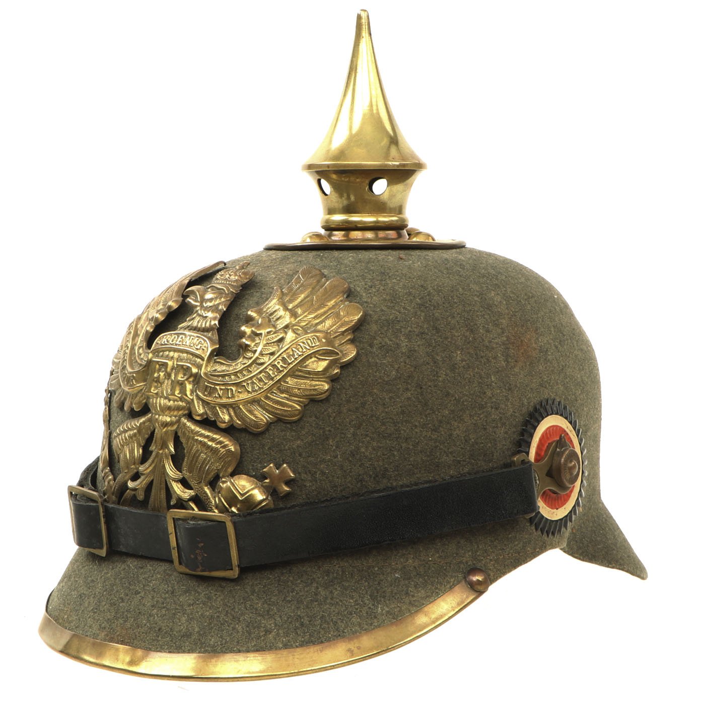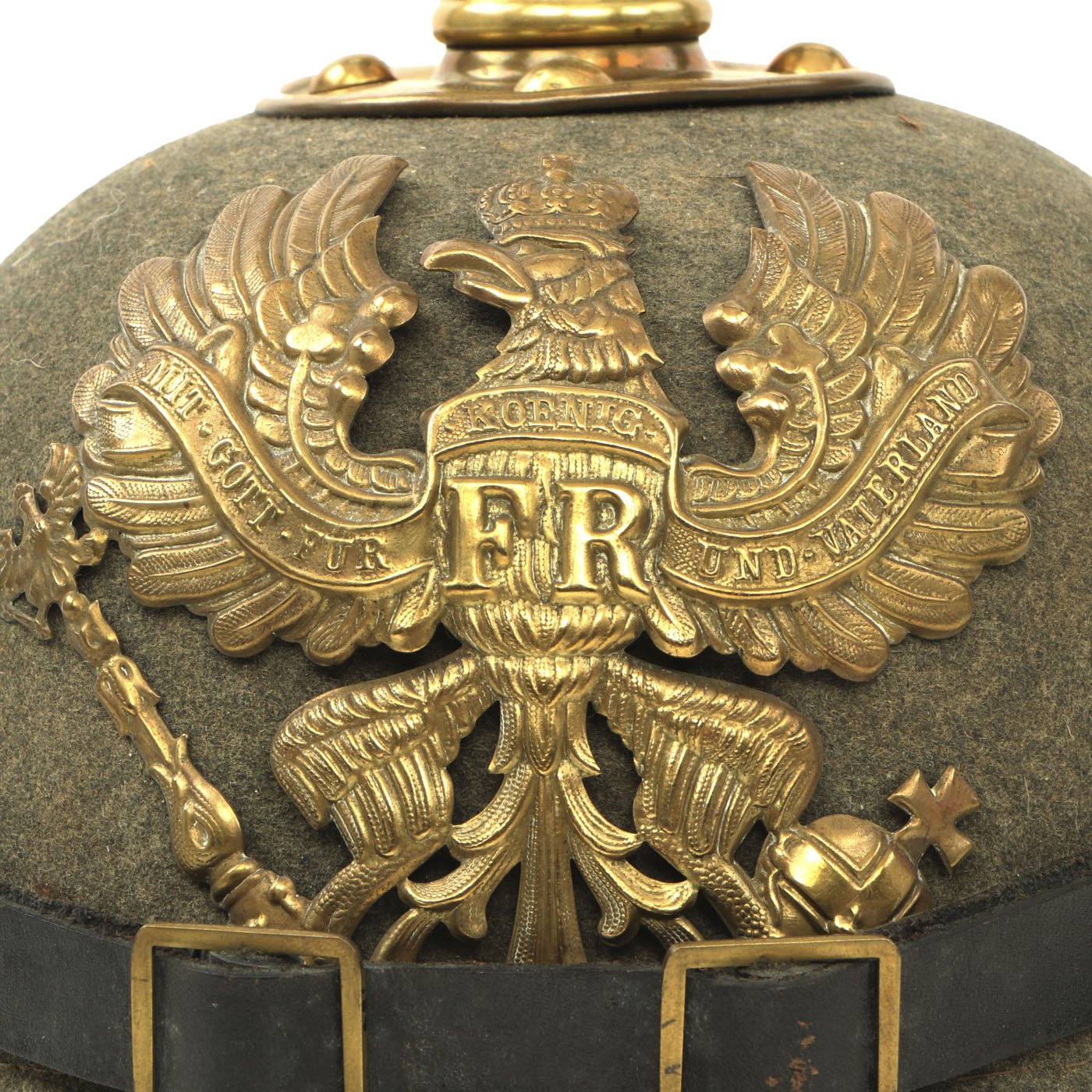 This helmet features a lovely gold-colored alloy frontplate (wappen) with the Prussian state eagle clutching a scepter and crown, over the King's motto, MIT GOTT FÜR KOENIG UND VATERLAND (With God for King and Country, i.e. Prussia). The Preußen issued Wappen in 1895 were intended to be made out of Tombak (an alloy made from a combination of copper and zinc) but it seems that the copper-color was unpopular and they were soon replaced with Aluminiumbronze which has a very bright brass appearance.