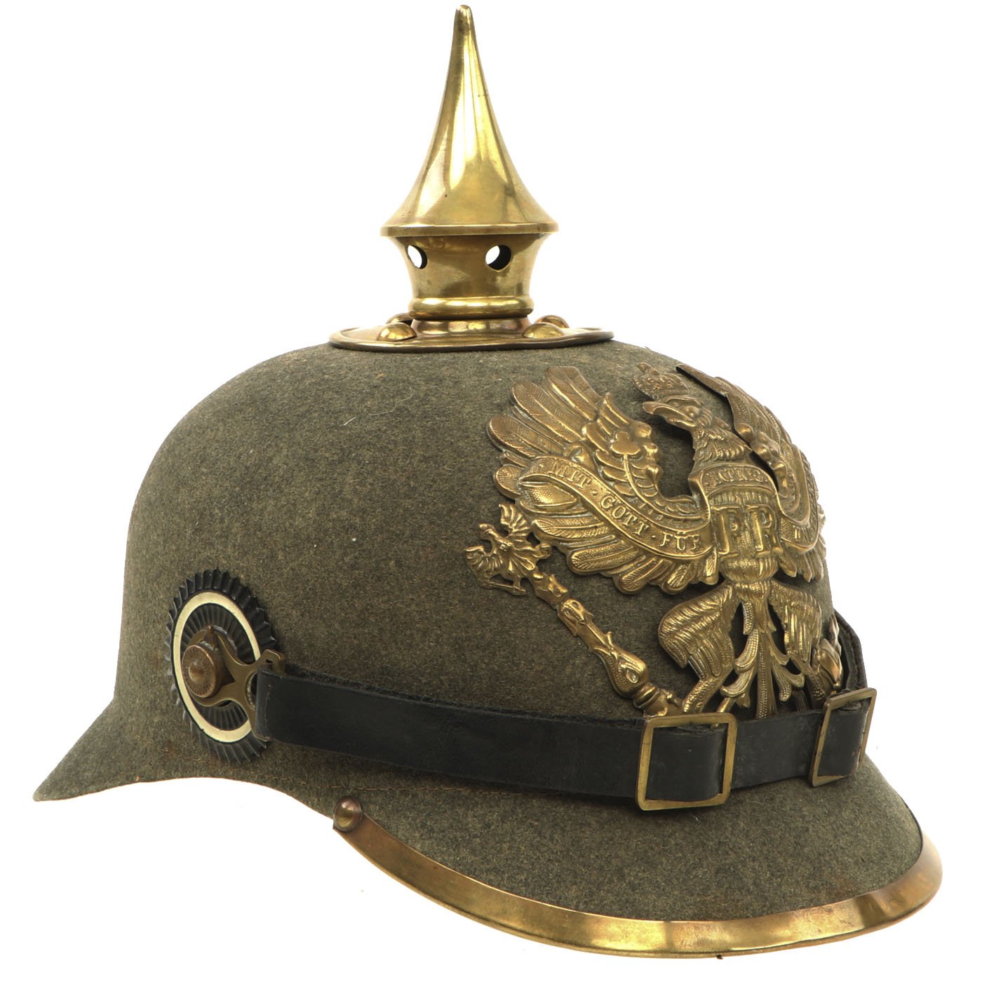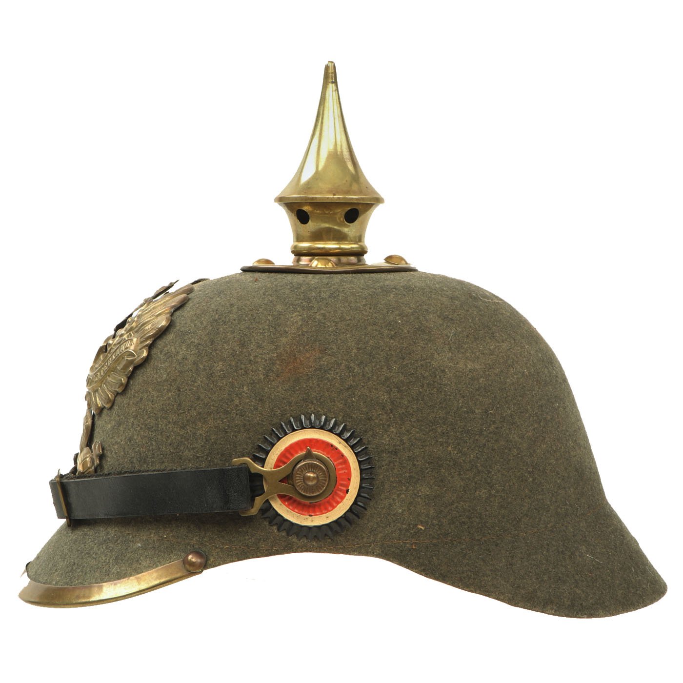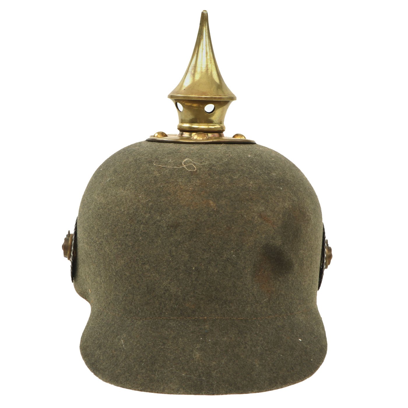 As the felt hat manufacturing industry was well established in Germany for hundreds of years, the hat industry stepped in to fill the void by producing Pickelhaube out of pressed and blocked felt, manufactured from rabbit fur or shredded wool. One advantage to the Filzhelme (felt helmets) was that they were normally pressed from one-piece of felt which significantly reduced production time. There were various variations produced, depending on when they were made and what materials for fittings were available at the time. First the brass M1895 fittings were used up, and then in 1915 the Filzhelm switched to the oxide coated steel. There are many examples of Ersatz helmet with both brass and steel fittings.