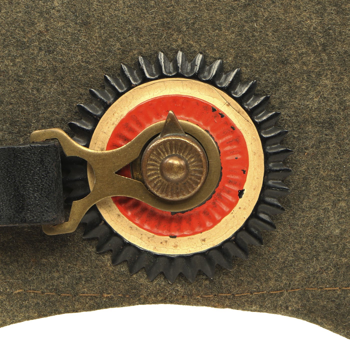 The soldered bolt and nut system used to secure the front Wappen onto the helmet was changed to a system for retaining Wappen on the front of helmets that had been used as far back as 1845 for Bayern (Bavarian) helmets and 1867 for Sachsen (Saxon) helmets. A soldered loop was affixed to the back of the Wappen which passed through corresponding grommeted holes on the front of the helmet. A leather wedge was then passed through the loop on the interior to keep the Wappen in place. Both Leather wedges are still present, and look to be original.