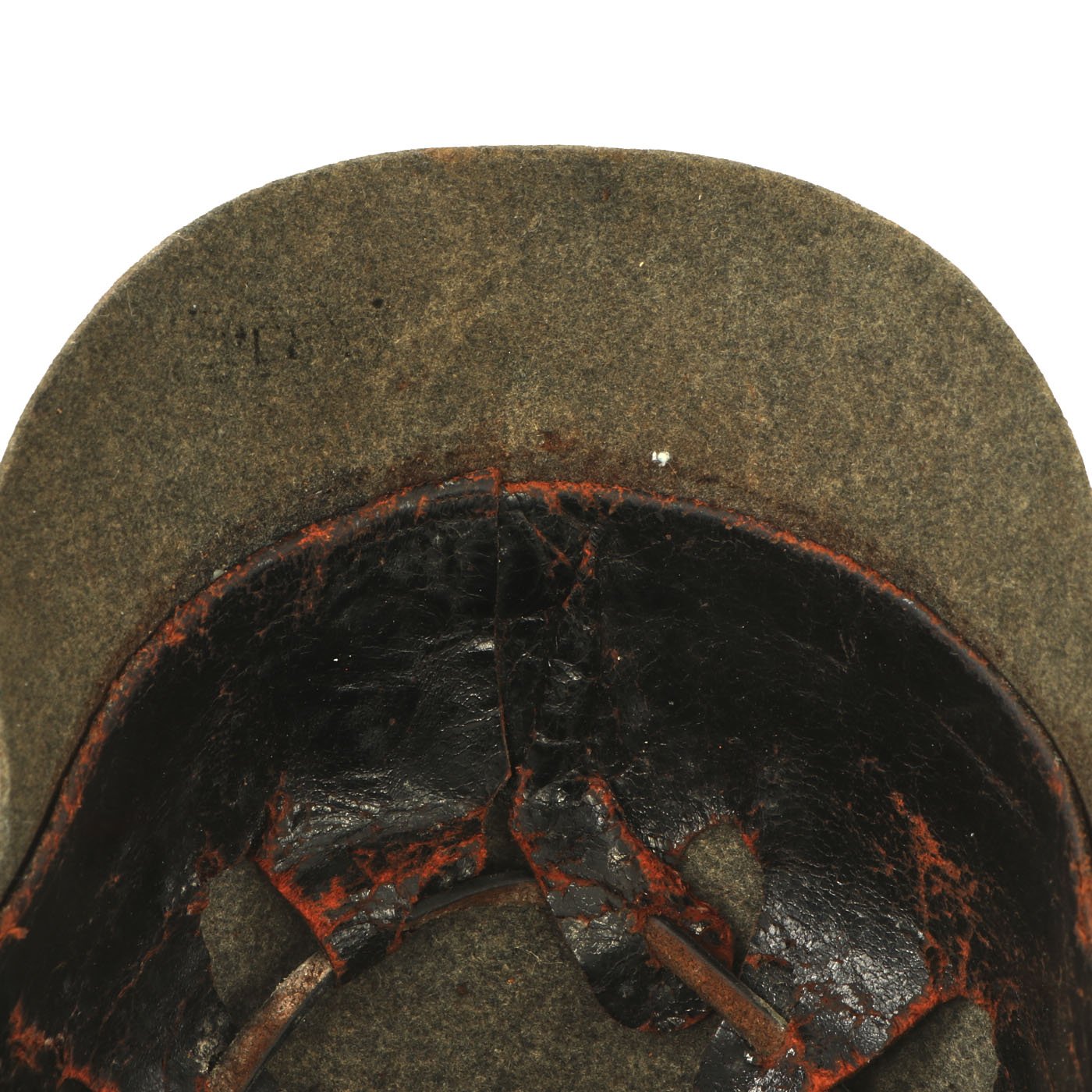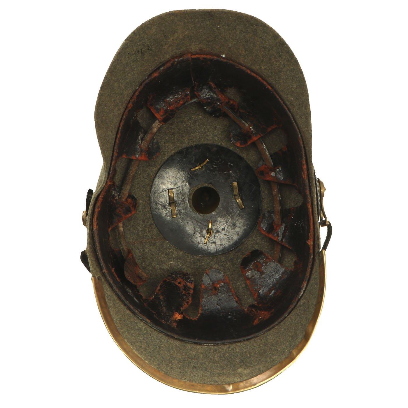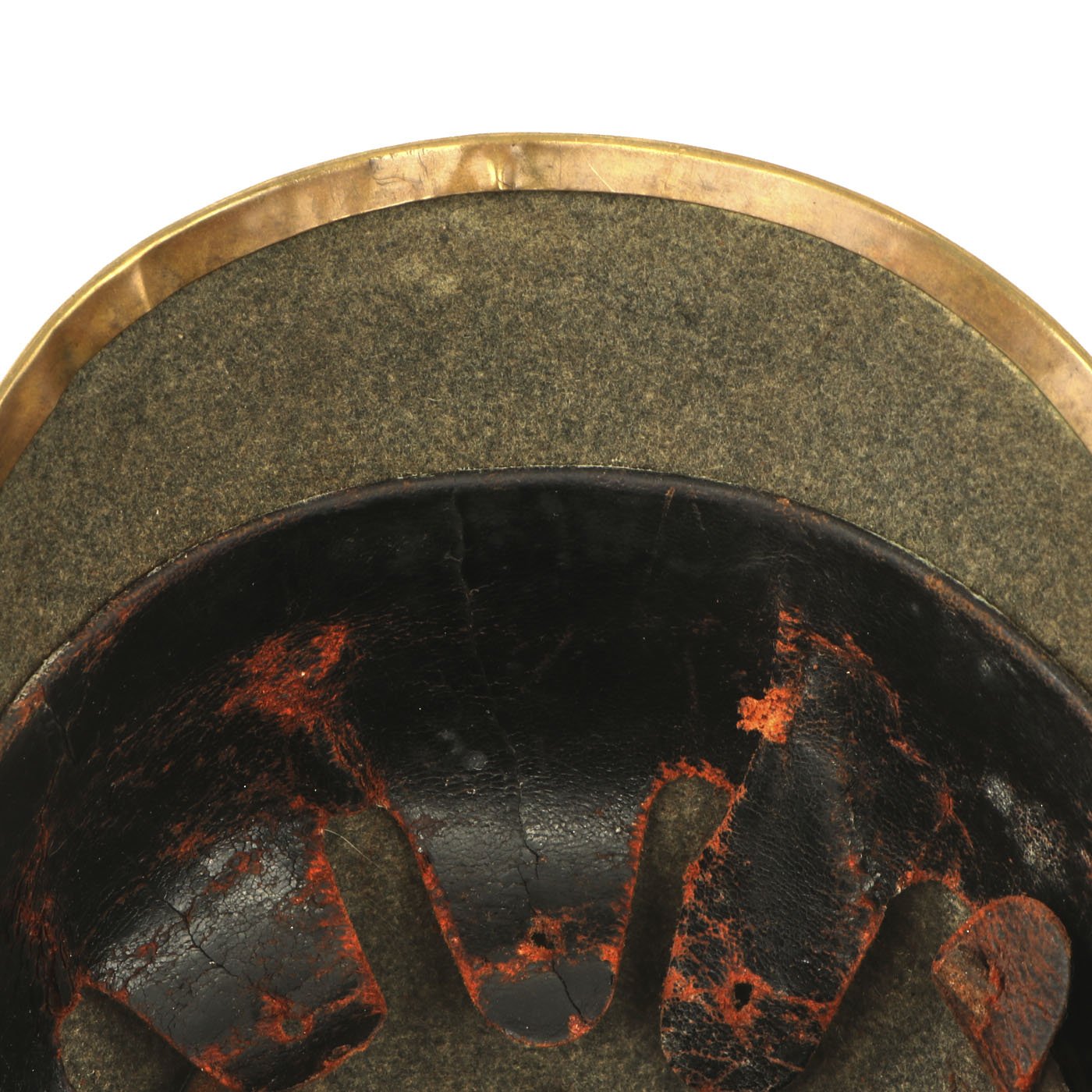 The exterior of the helmet is in very good condition, with no major moth damage or other issues. There is dirt in areas as well as some stains, as expected from a helmet over 100 years in age. This example has front vizor brass trim in very good condition, with just a bit of rippling. Later versions of the Felt Helmets would have rolled over edges. The internal liner is in good condition, with a partially intact top strap. It does show wear, but overall the helmet is relatively large, probably a 58-59 size.