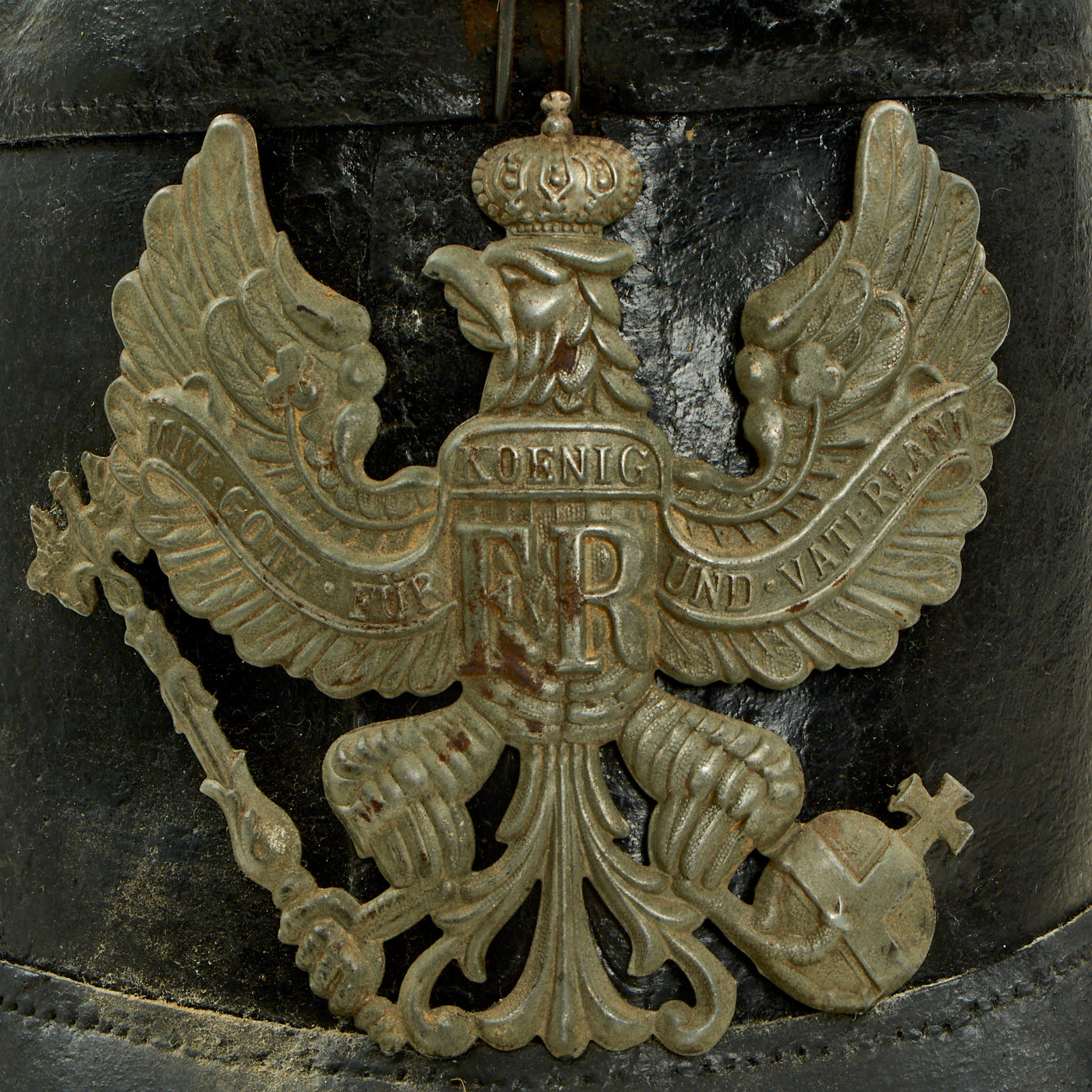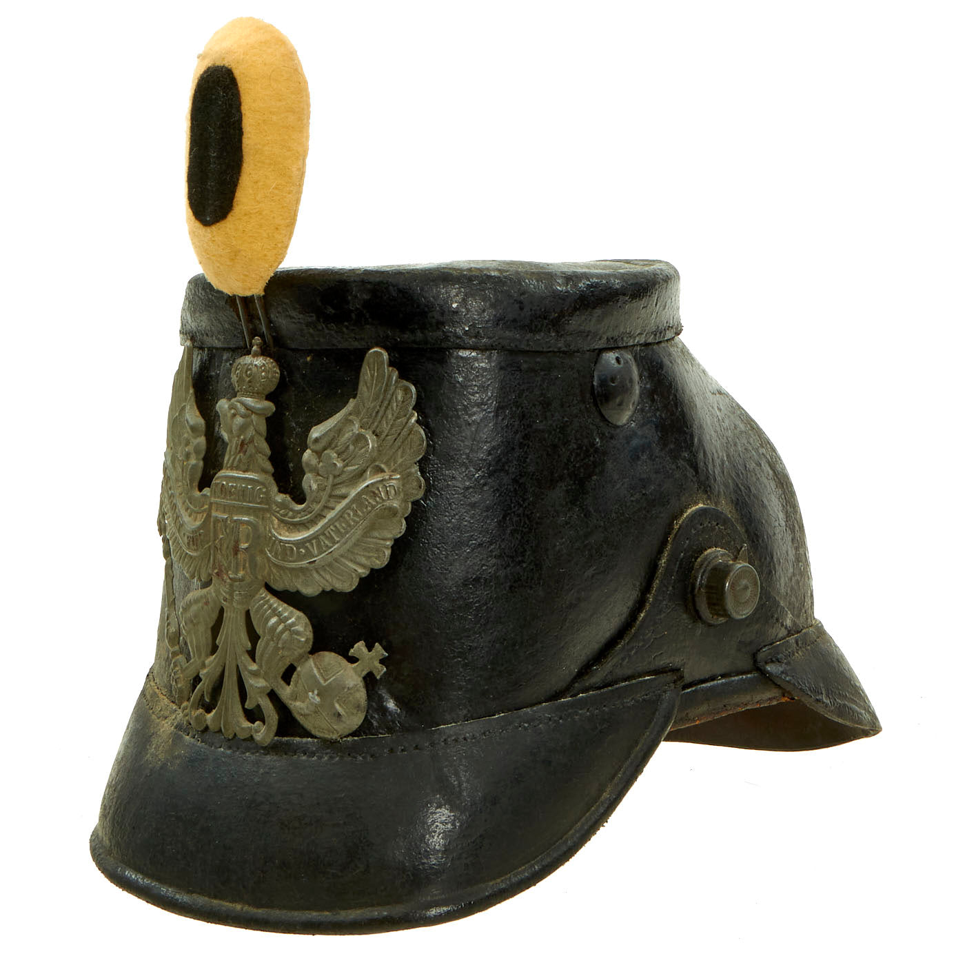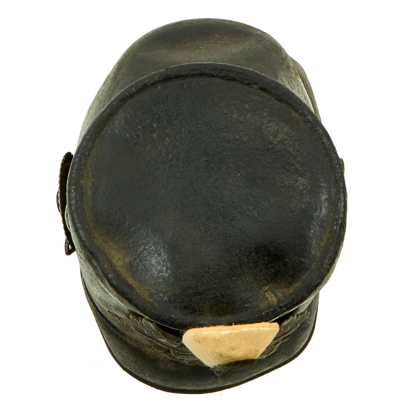 This is an excellent textbook example, and features an oxide finished Prussian wappen (front plate), which features the state eagle clutching a scepter and crown, over the King's motto, MIT GOTT FÜR KOENIG UND VATERLAND (With God for King and Country, i.e. Prussia). It is held in place by the standard leather wedges on the inside of the shell.