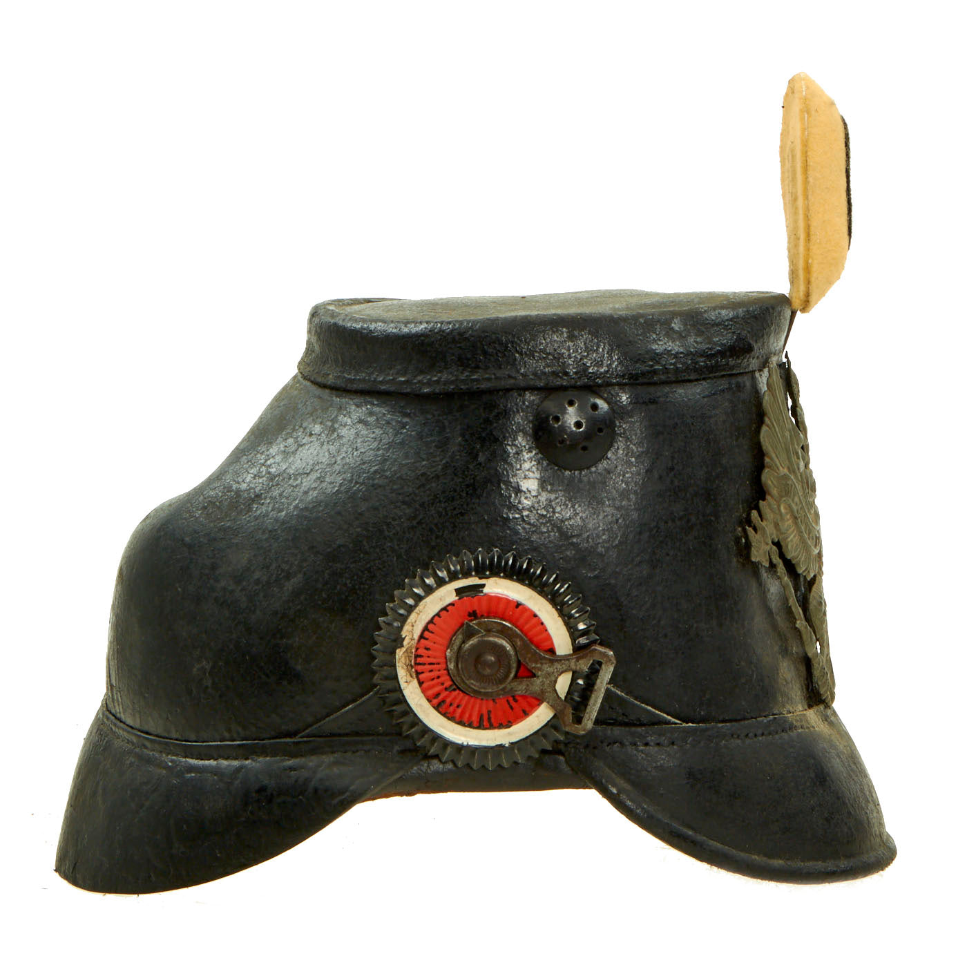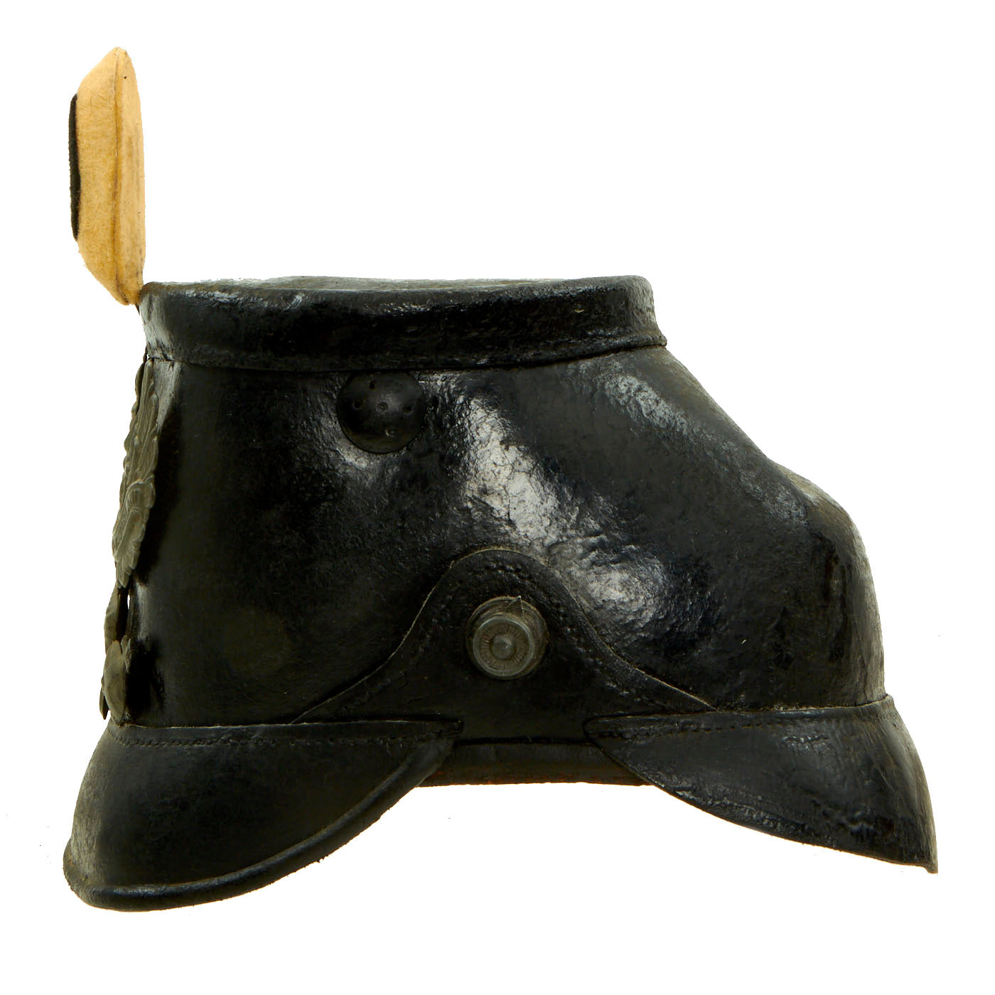 In 1897 the new Reichs-Kokarde in Red-White-Black was introduced for all ranks to commemorate the 100th anniversary of the birth of Kaiser Wilhelm 1st. The Reichs-Kokarde was to be worn on the right side of the helmet. As Tschako helmets feature a front cockade, there is no cockade on the left chin strap lug. This helmet still has its correct Prussian (Black & White) removable felt covered cockade at top front.