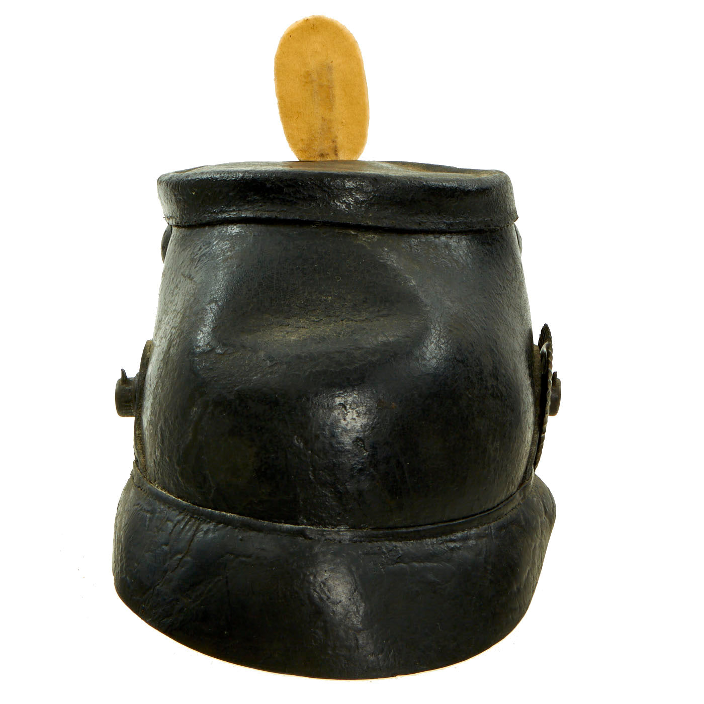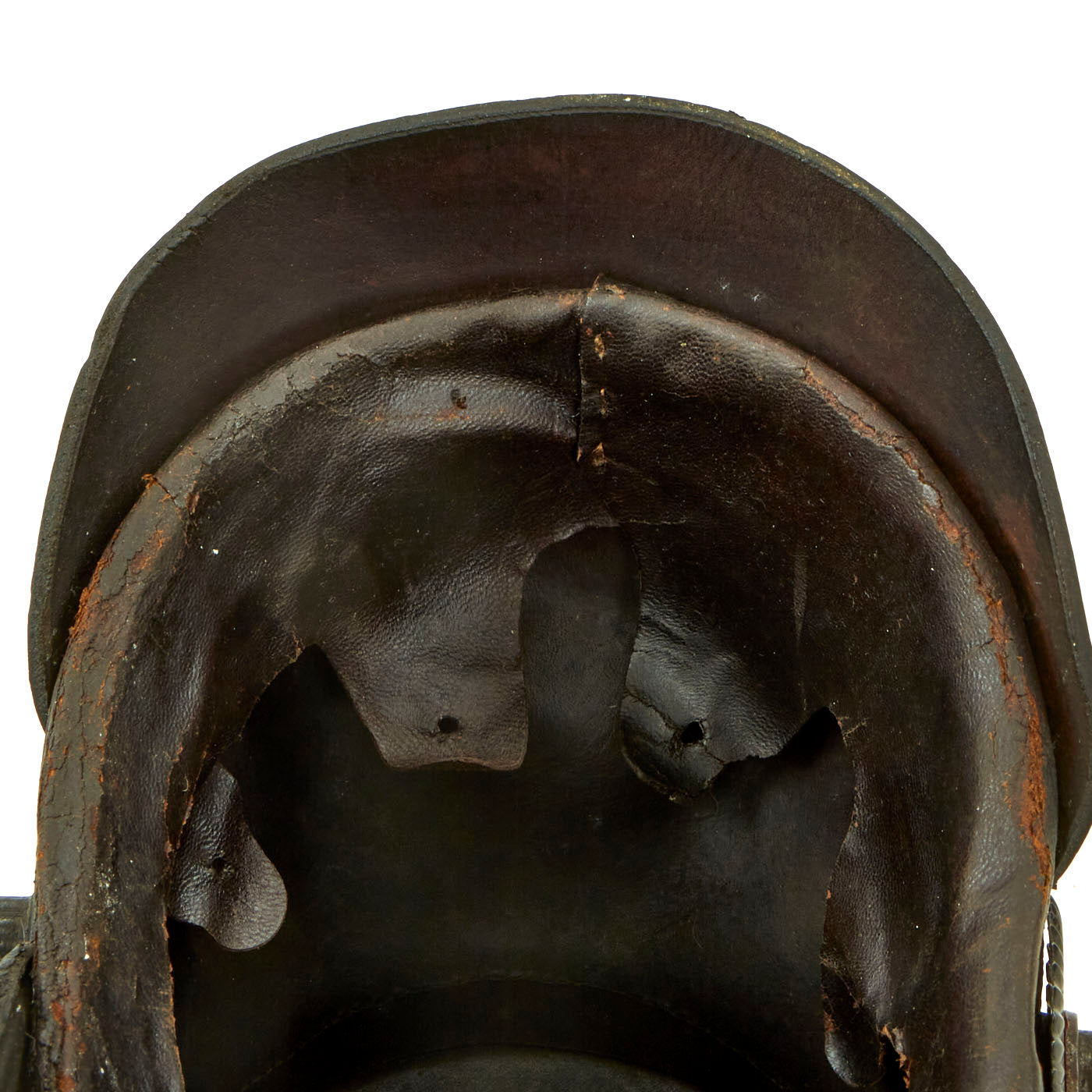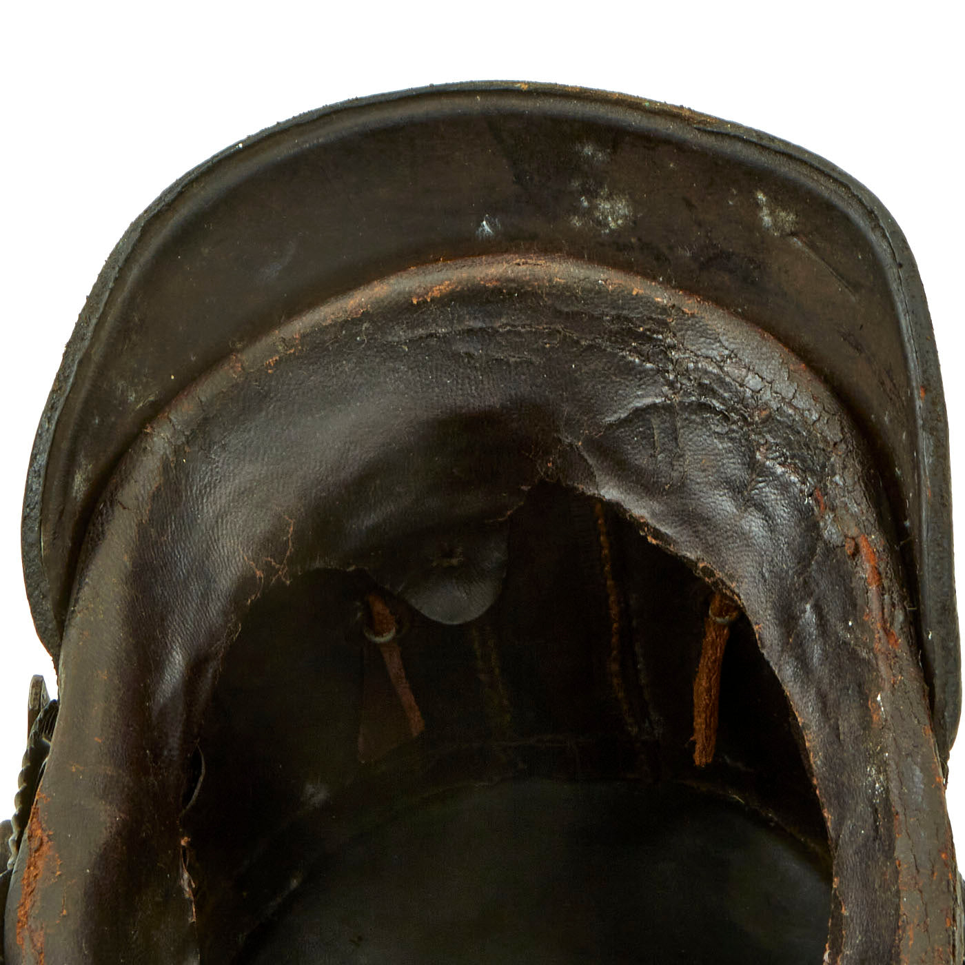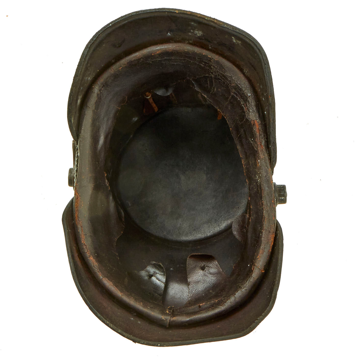 The exterior of the helmet shell is in good condition. Showing some signs of shrinkage (likely from languishing in a hot attic for decades) with lovely age checking/cracking, but no real damage of flaking. The front and rear visors are still attached with intact stitching, another rarity, though they are a bit loose as the leather has shrunk. The Tschako also has the correct 7 hole metal ventilation fittings on each side.