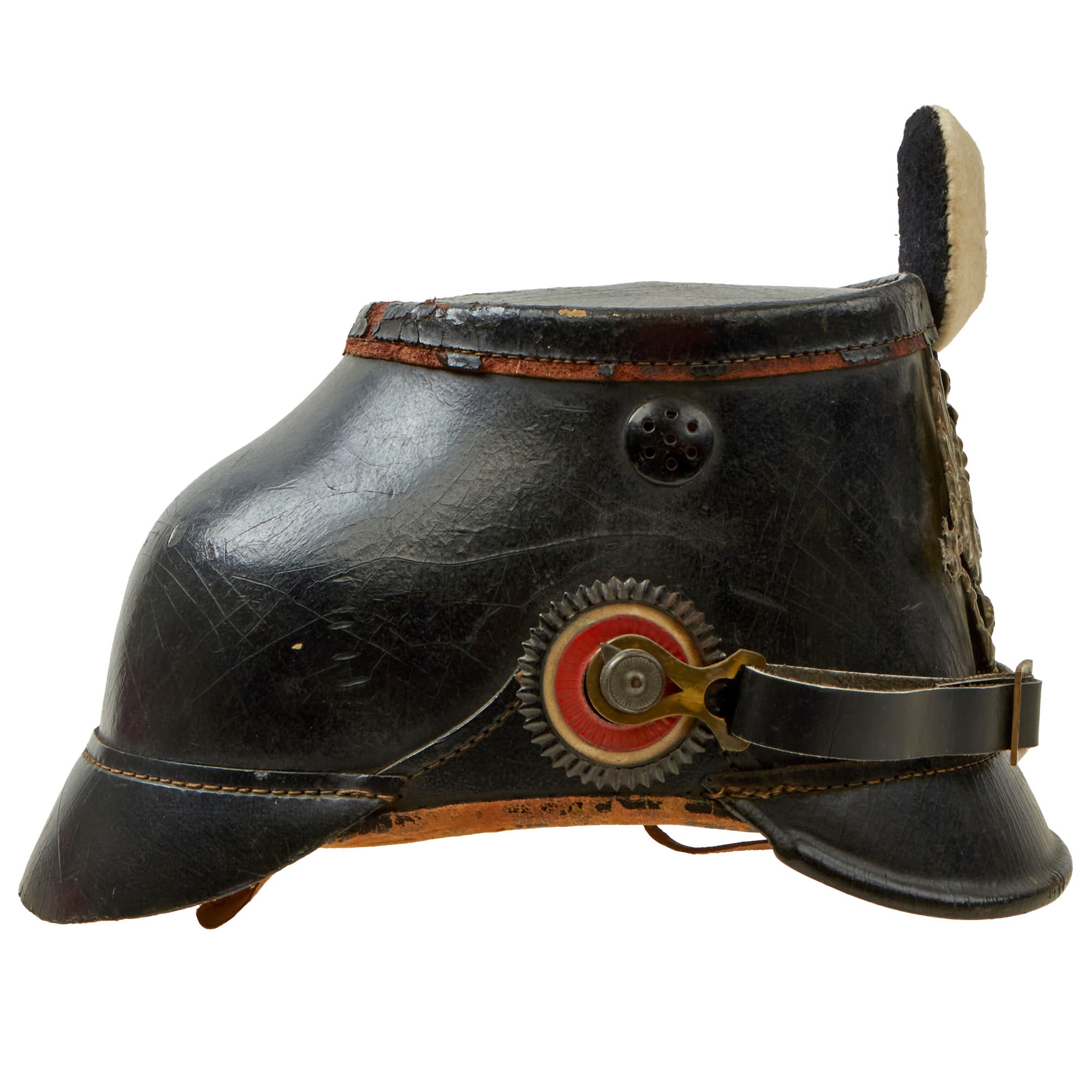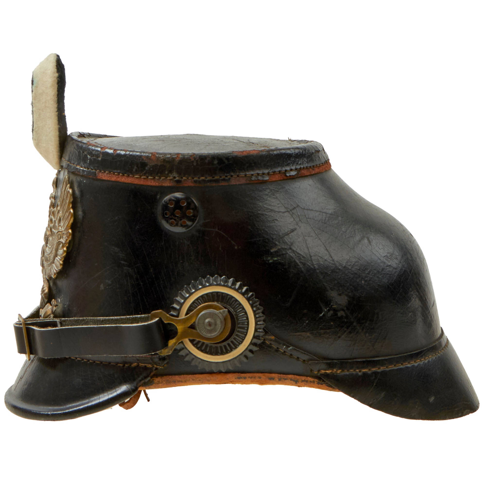 In 1897 the new Reichs-Kokarde in Red-White-Black was introduced for all ranks to commemorate the 100th anniversary of the birth of Kaiser Wilhelm 1st. The Reichs-Kokarde was to be worn on the right side of the helmet. As Tschako helmets feature a front cockade, there is no cockade on the left chin strap lug. This helmet still has its correct Prussian (Black & White) removable felt covered cockade at top front.