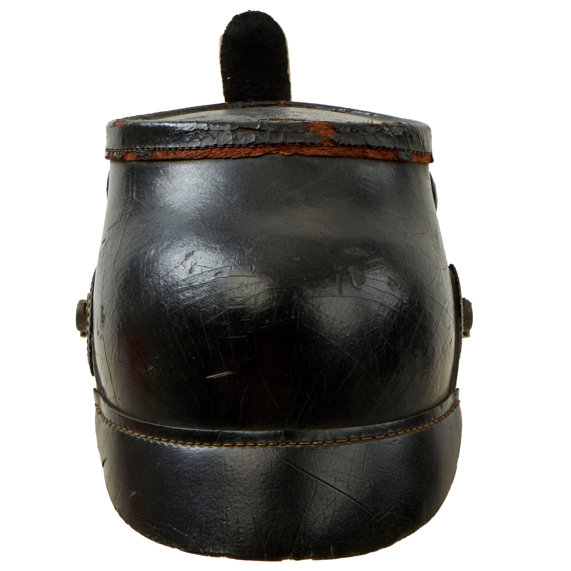 Original Item: Only One Available. This is an excellent original Imperial Prussian Jäger enlisted man's Mannschaften (other ranks or EM / NCO) Tschako (Shako). The M1915 was the last model of Tschako issued prior to the move to steel helmets, and replaced the earlier M1895 and M1897 patterns. In accordance with the 1915 regulations, these helmets would no longer use brass, silver, or Tombak as earlier versions did. All issued leather helmets would now use gray oxidized steel fittings for all Regiments. As with previous versions, the body was constructed from boiled leather, which was shaped and lacquered black.
