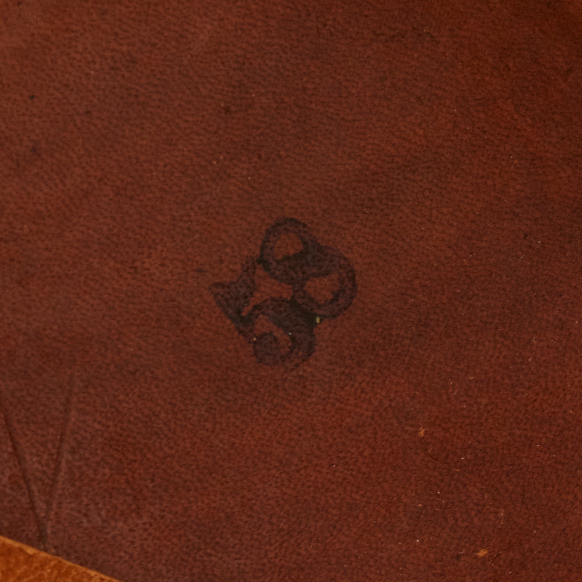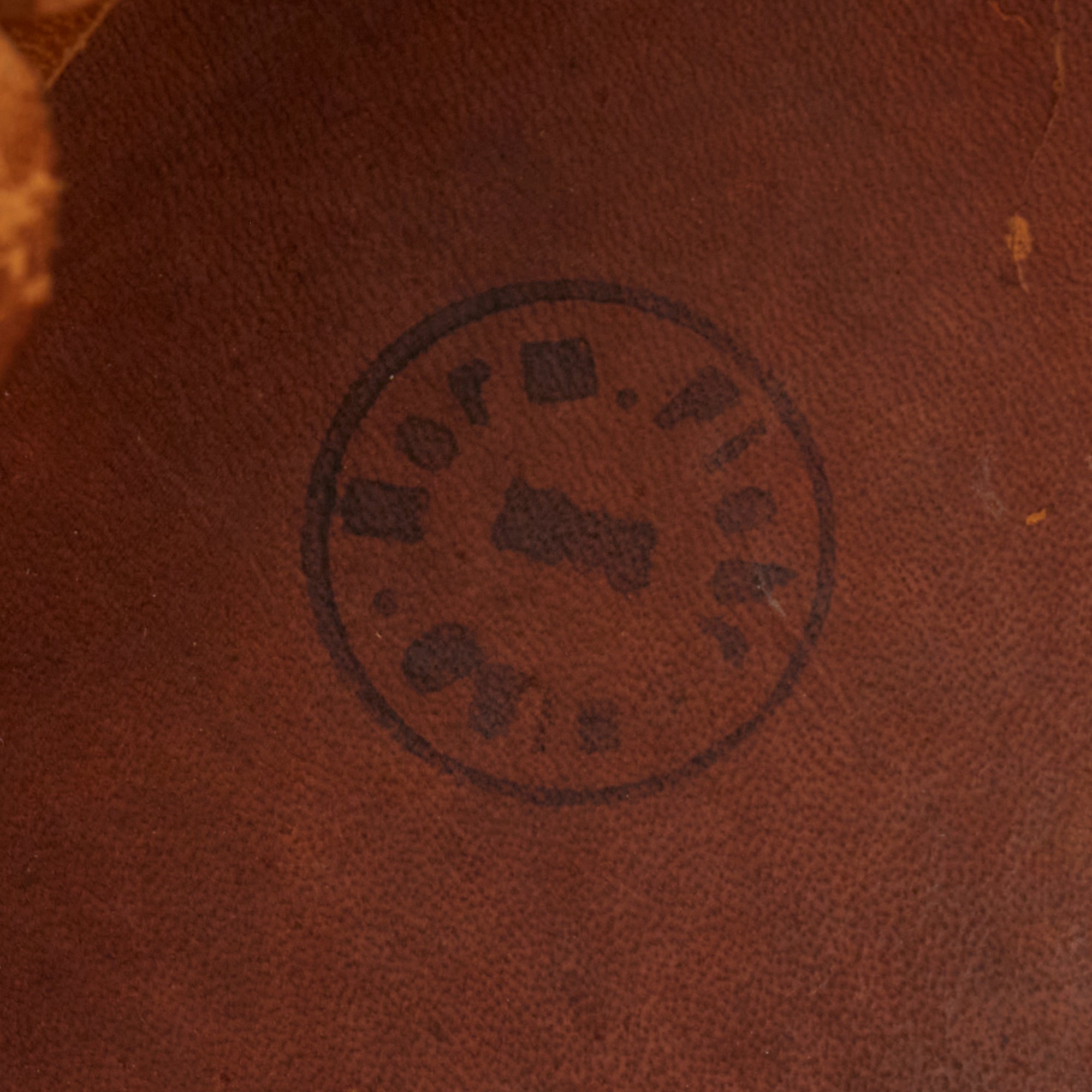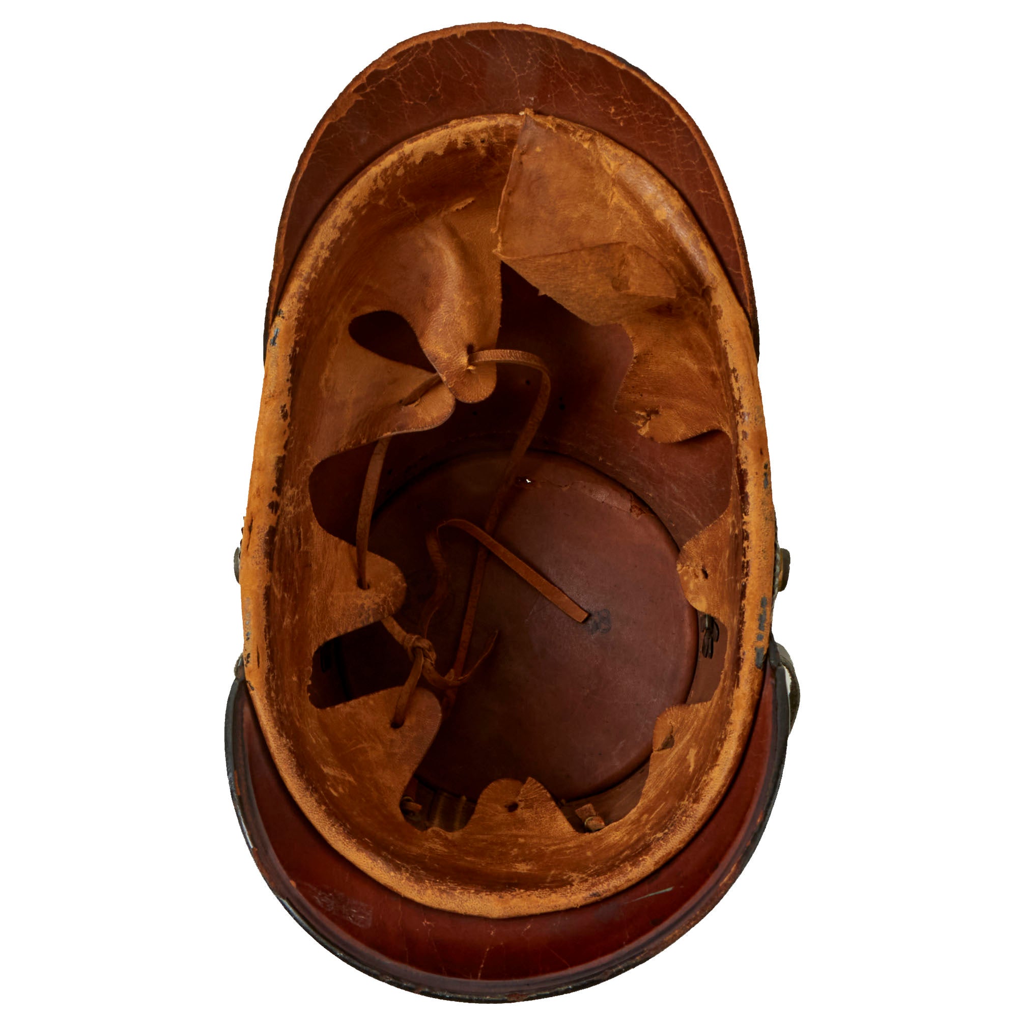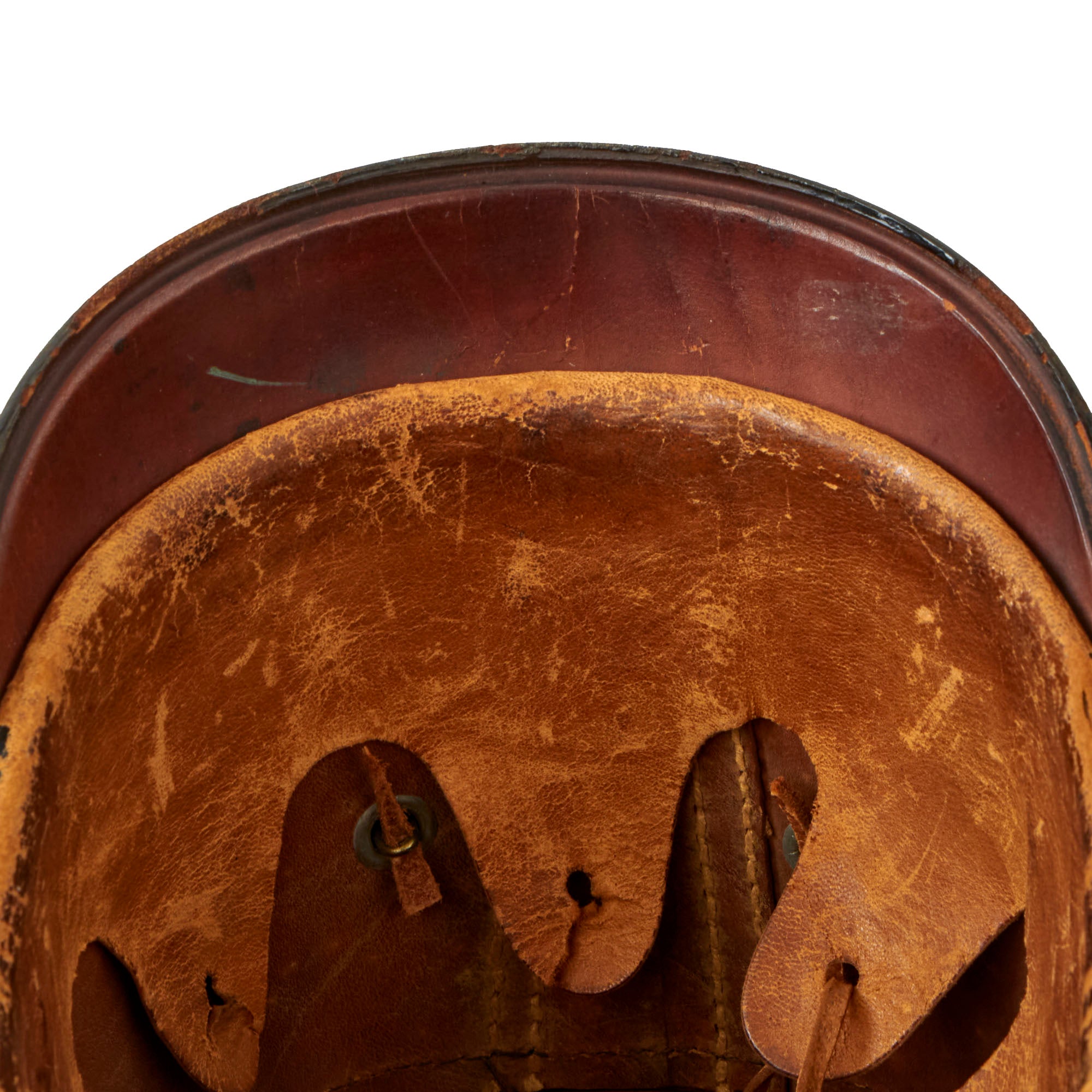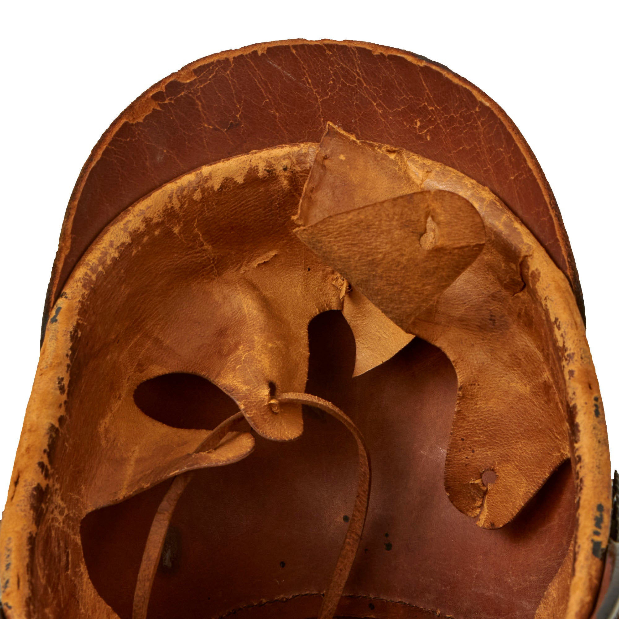 The interior features a nice original leather liner, which shows signs of original use, and age which accumulated over decades in storage. All fingers are intact, and still have a few intact securing strap holes while most are torn. There is a small stamped marking on the top crown but unfortunately it was a “bled” look and is no longer legible. There is also a clear 58 stamp indicating the size, but we do not know if it is still correct as the leather often shrinks over time.