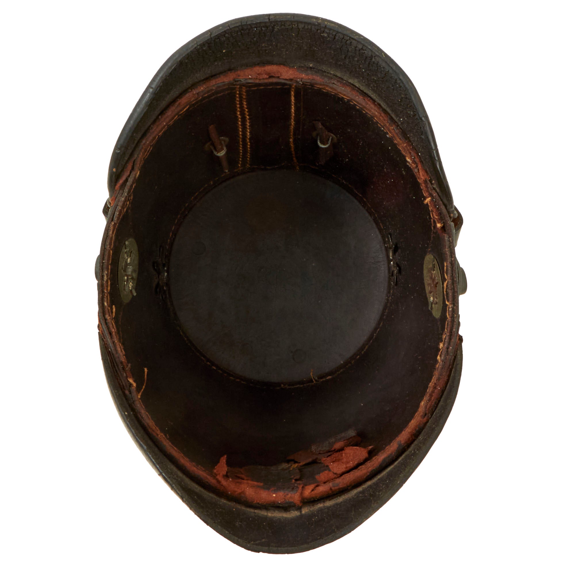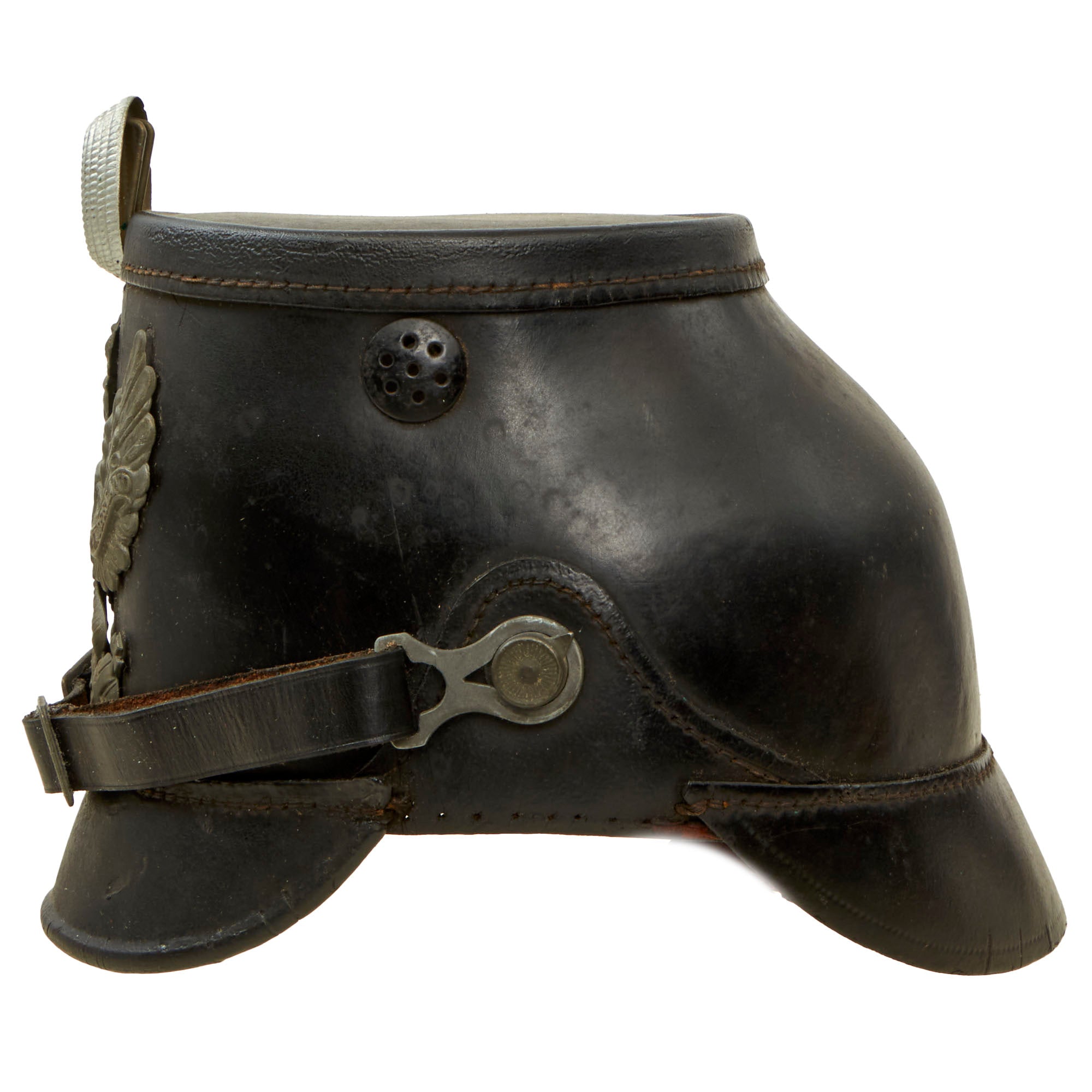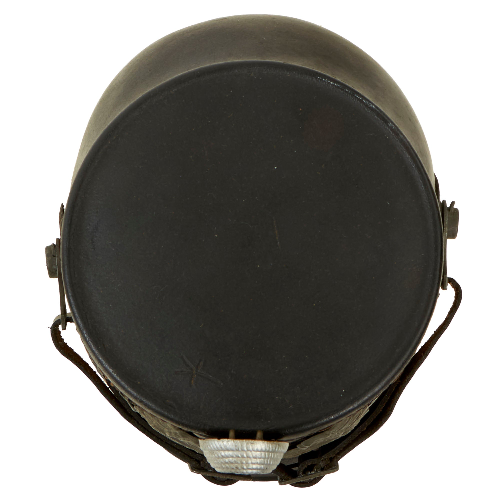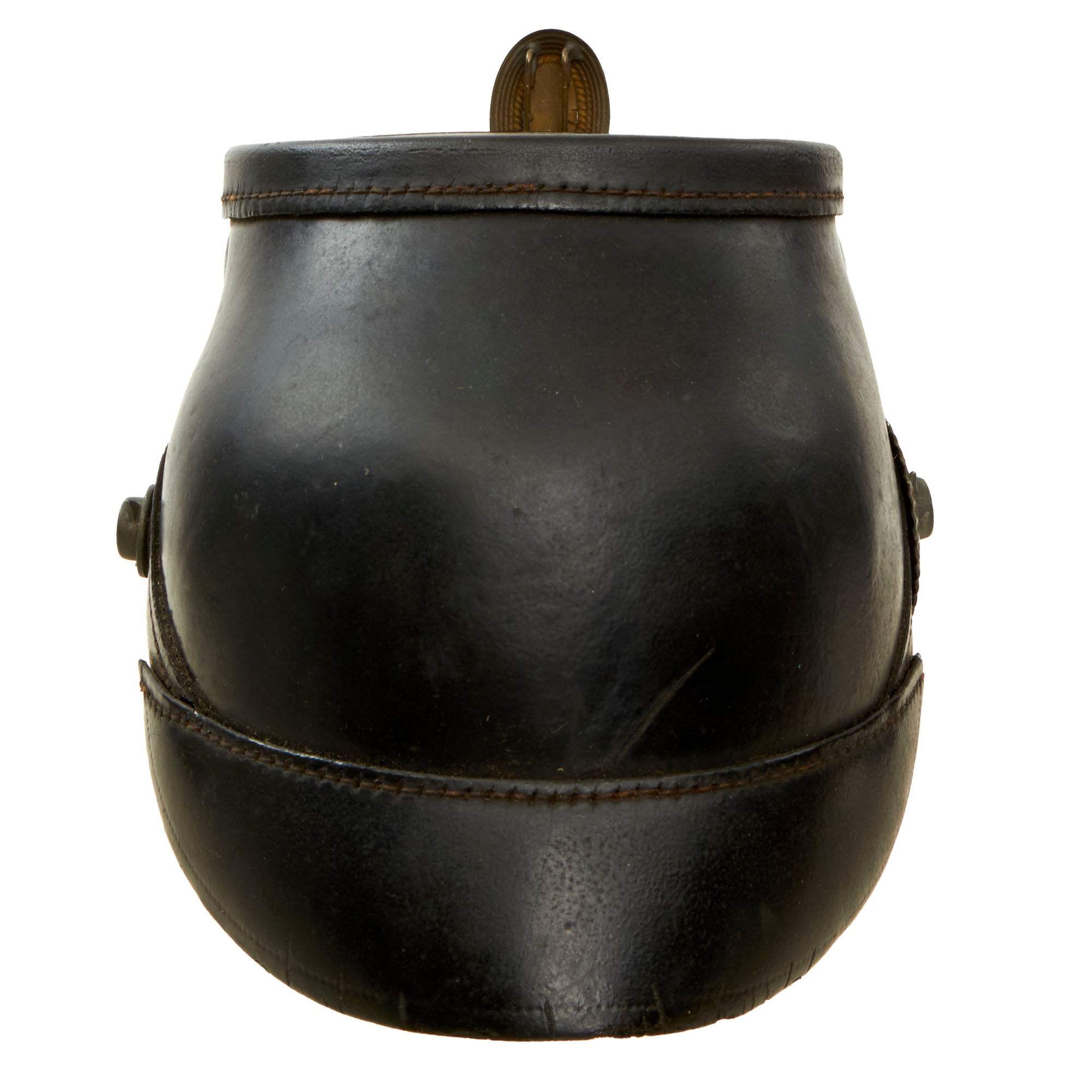 Original Item: Only One Available. This is a nice original Imperial Prussian Jäger enlisted man's Mannschaften (other ranks or EM / NCO) Tschako (Shako). The M1915 was the last model of Tschako issued prior to the move to steel helmets, and replaced the earlier M1895 and M1897 patterns. In accordance with the 1915 regulations, these helmets would no longer use brass, silver, or Tombak as earlier versions did. All issued leather helmets would now use gray oxidized steel fittings for all Regiments. As with previous versions, the body was constructed from boiled leather, which was shaped and lacquered black.
