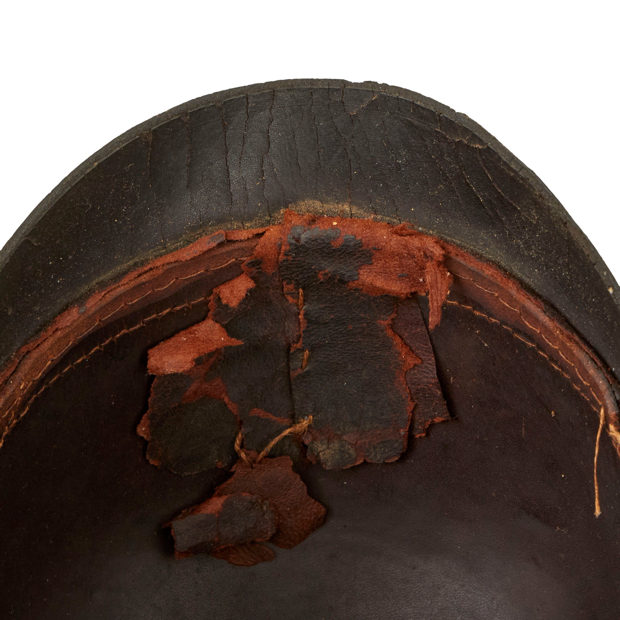 This is a very nice example, and features a steel brass color finished Prussian wappen (front plate), which features the state eagle clutching a scepter and crown, over the King's motto, MIT GOTT FÜR KOENIG UND VATERLAND (With God for King and Country, i.e. Prussia). It is held in place by the standard leather wedges on the inside of the shell. Both M1891 pattern side lugs are present, and the right side has a very nice German National Colors (red white and black) Kokarde (cockade) around the lug with a solid chinstrap still attached though it most certainly is a new made leather example.