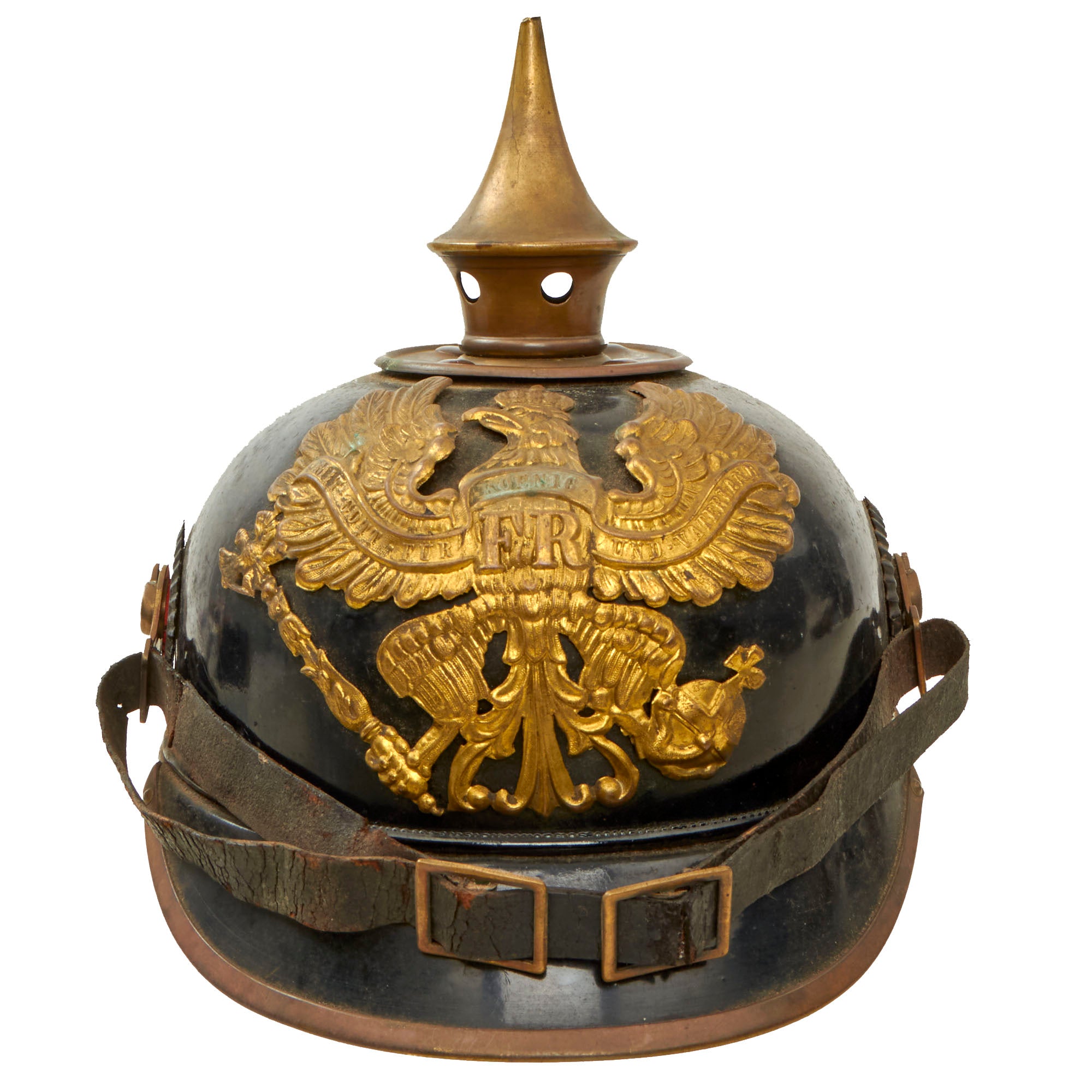 Original Item: Only One Available. This is a rare German first world war Prussian Mannschaften (Other Ranks) brass mounted tin plate (not leather) helmet known as a Pickelhaube, for the Foot-troops (Infantry).