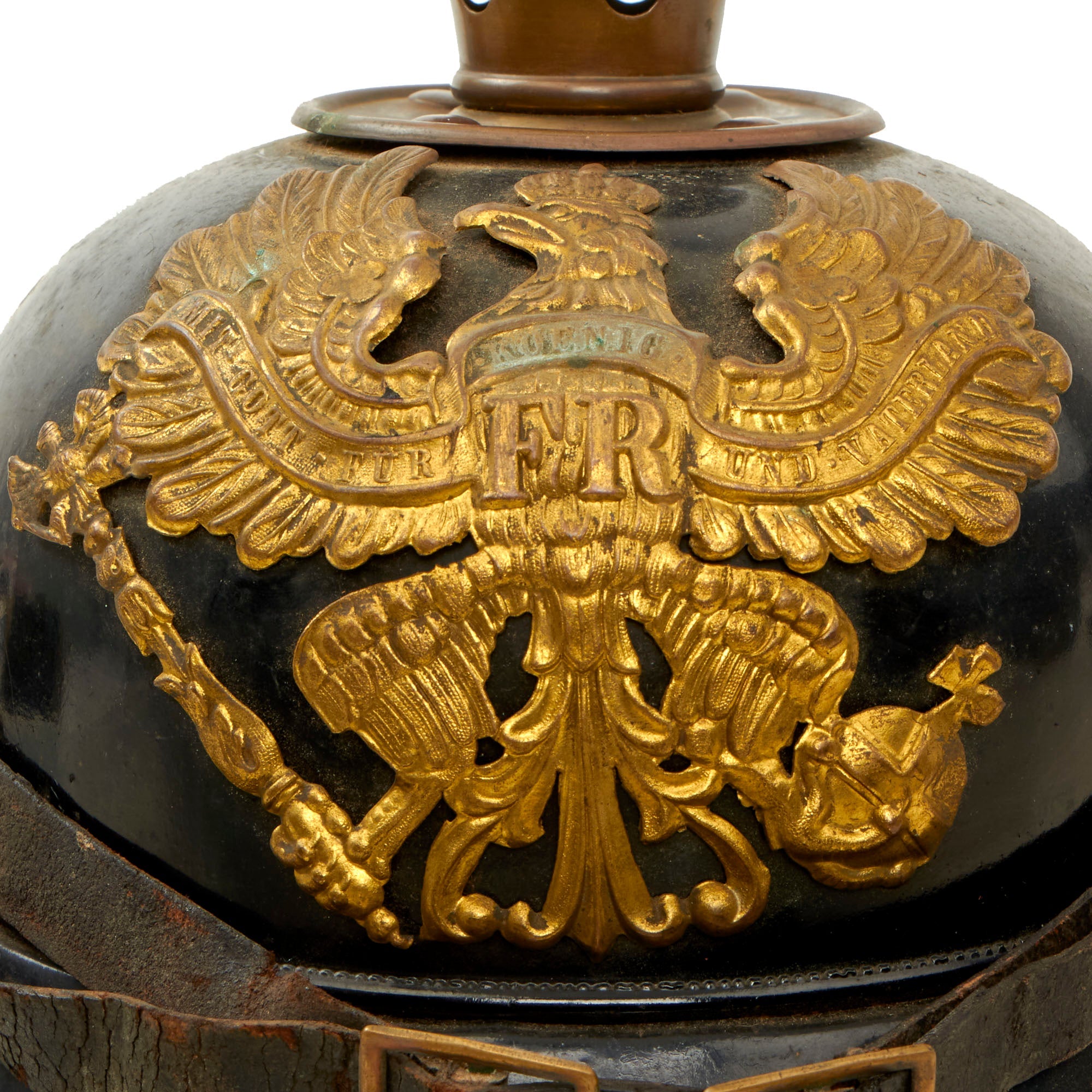 This helmet features a gilt brass infantry wappen (front plate) with the Prussian state eagle clutching a scepter and crown, over the King's motto, “MIT GOTT FÜR KOENIG UND VATERLAND” (With God for King and Country, i.e. Prussia). The Preußen issued Wappen in 1895 were intended to be made out of Tombak (an alloy made from a combination of copper and zinc) but it seems that the copper-color was unpopular and they were soon replaced with Aluminiumbronze which has a very bright brass appearance. The wappen is still held in place well.