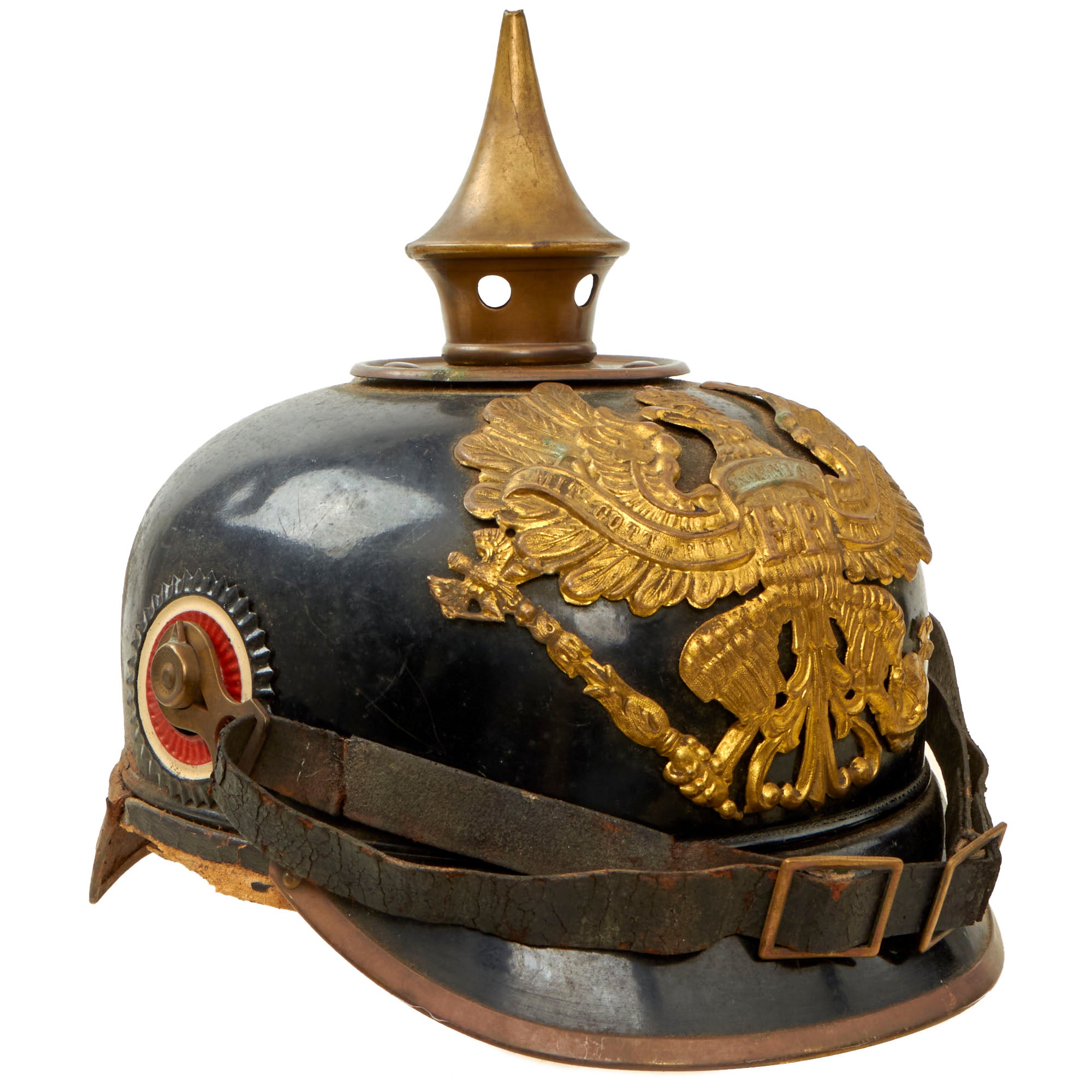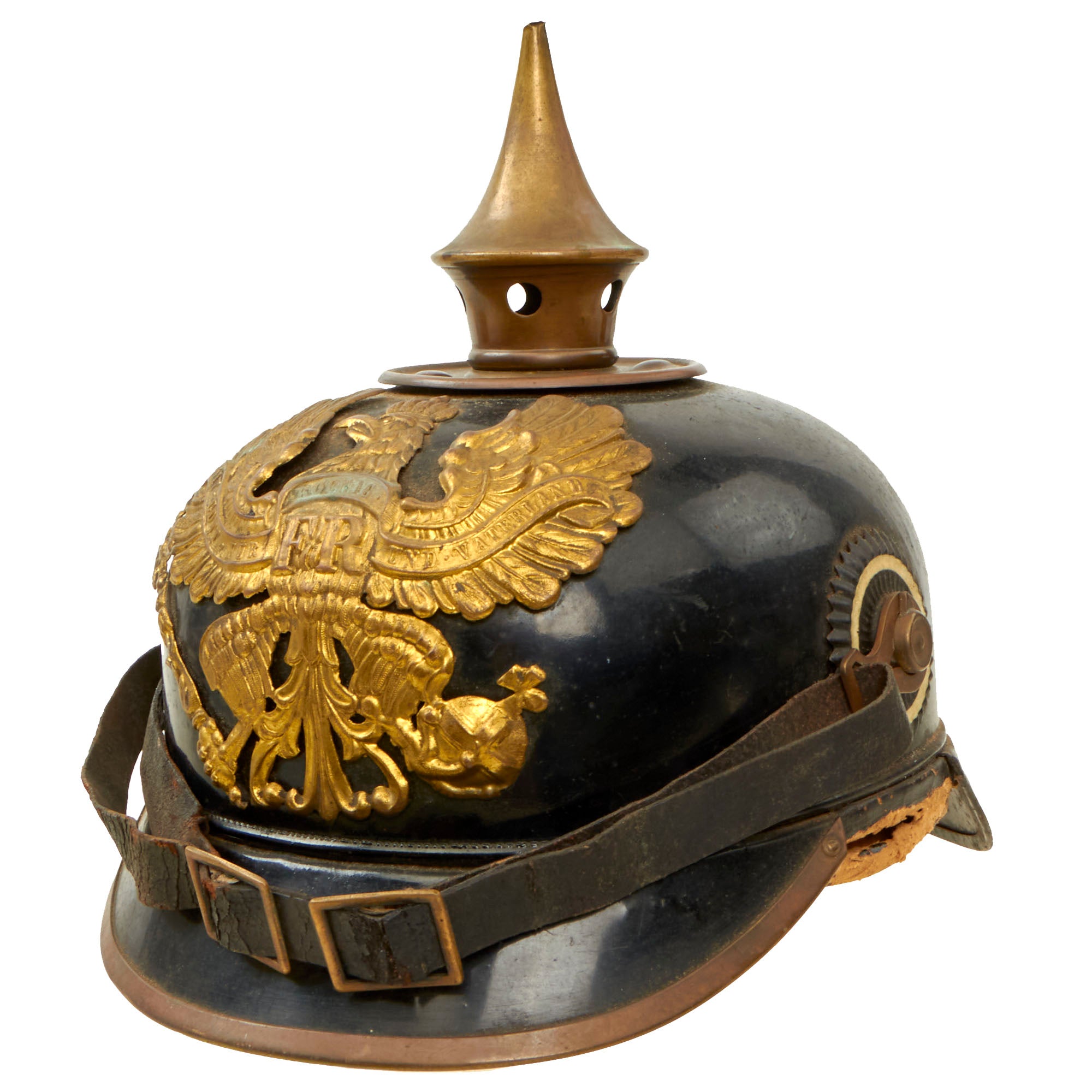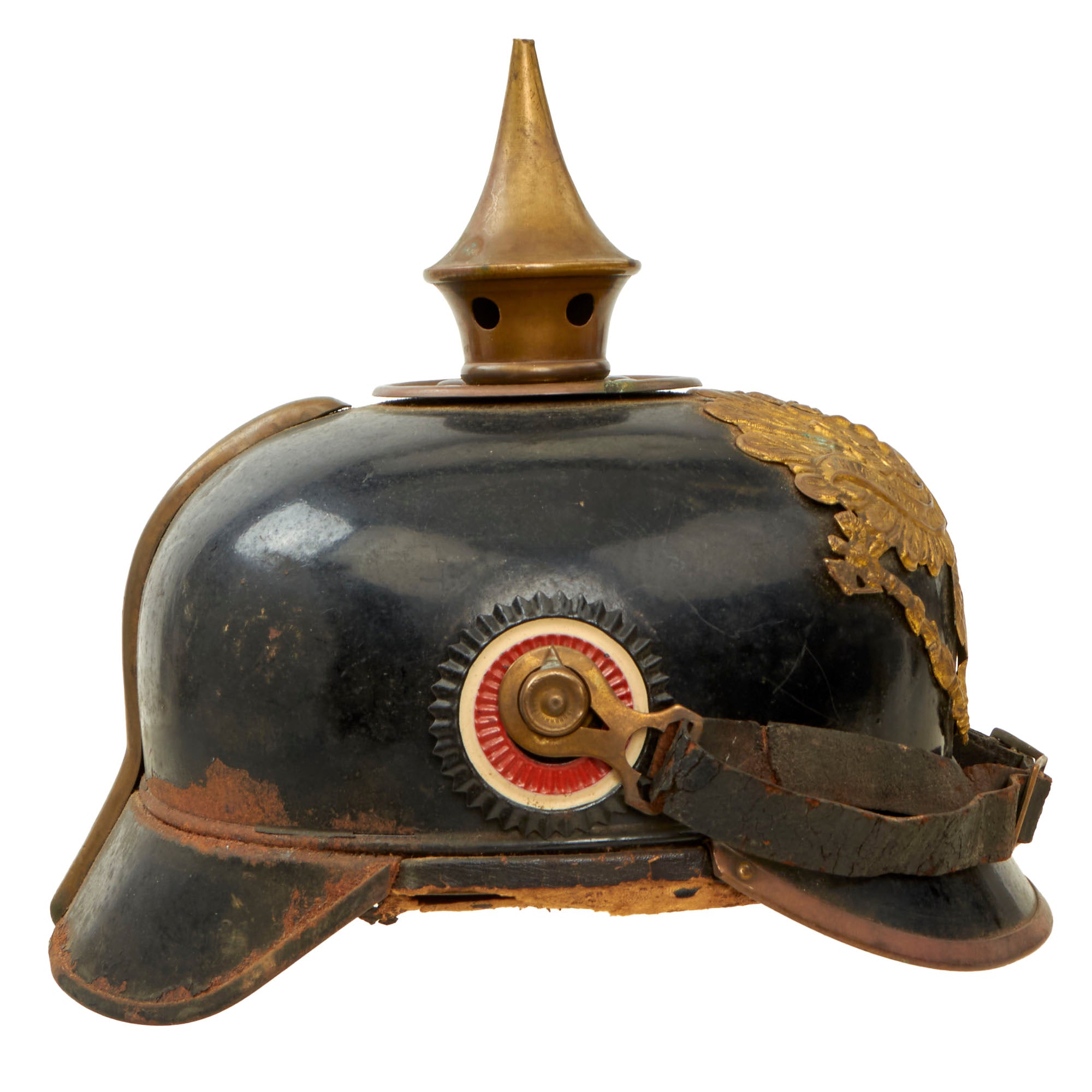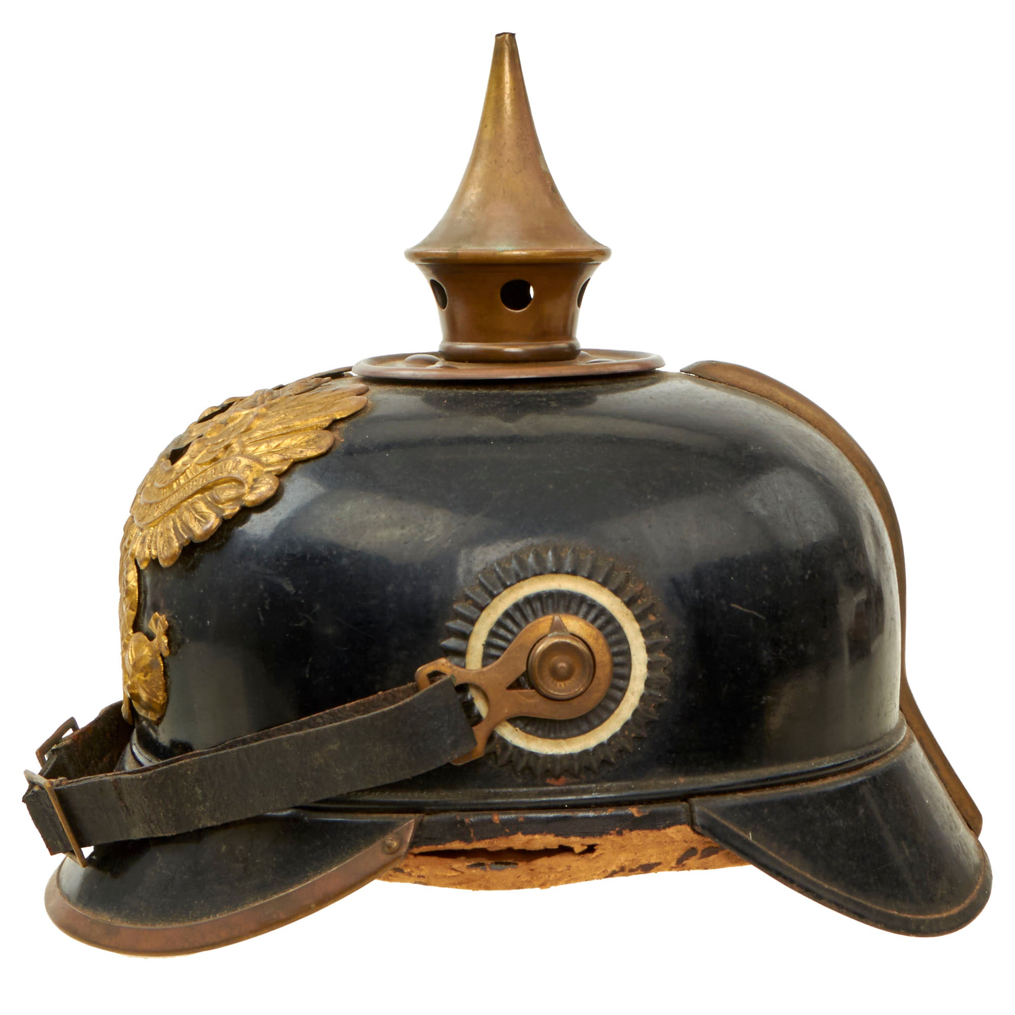 The specific model is actually quite rare and is known as a Eisenblech (tin plate) Ersatz-Helme (Substitute helmet). The M1914 was the second to last step in the final evolution in a long series of spiked helmets. It was manufactured from tin, and provided with fittings made of brass. The protection it offered was limited and led to the eventual replacement by a steel helmet in 1916.