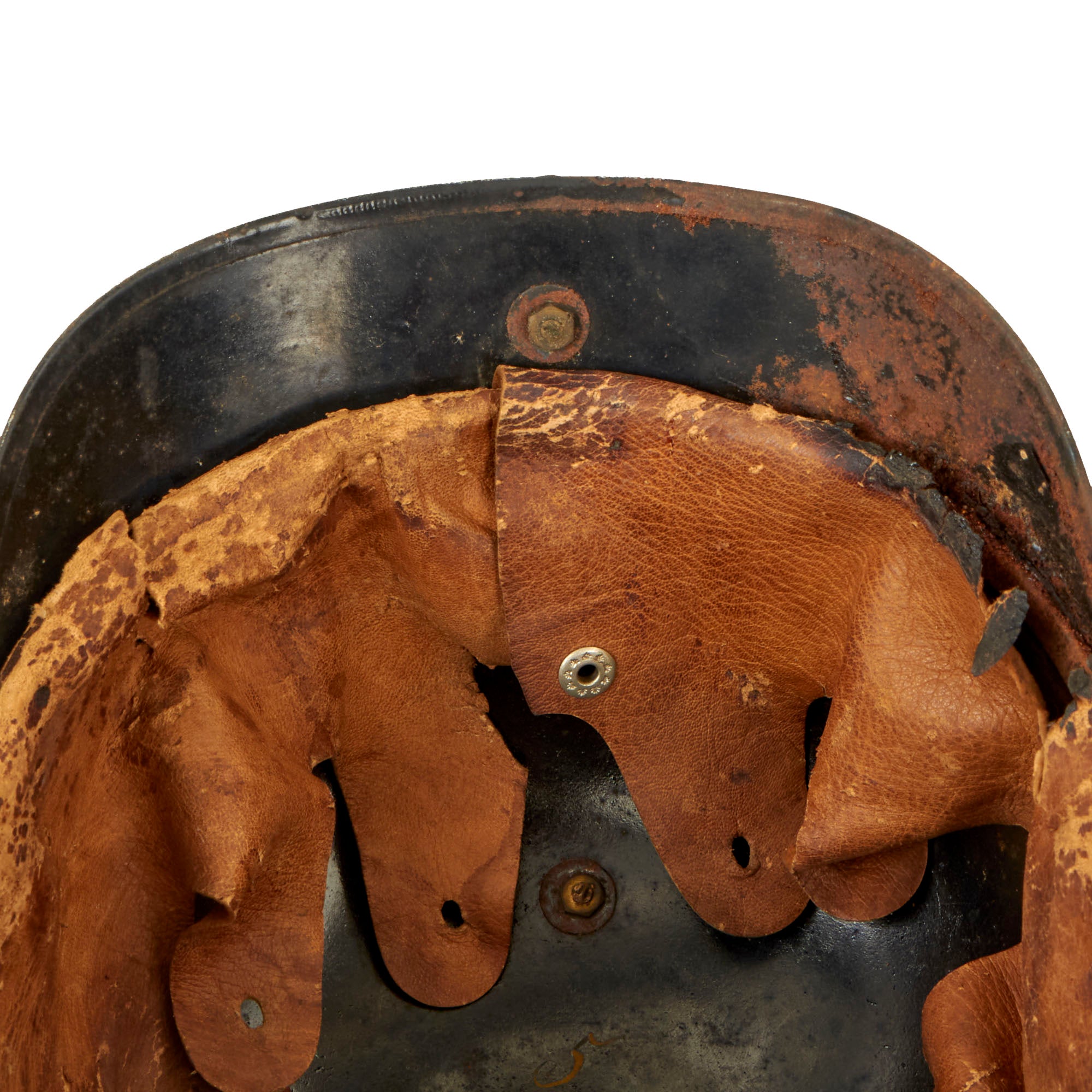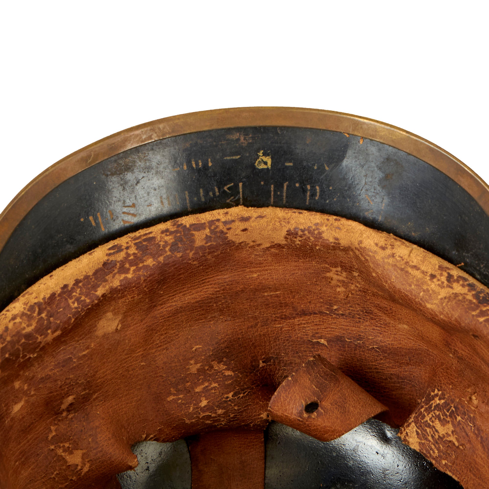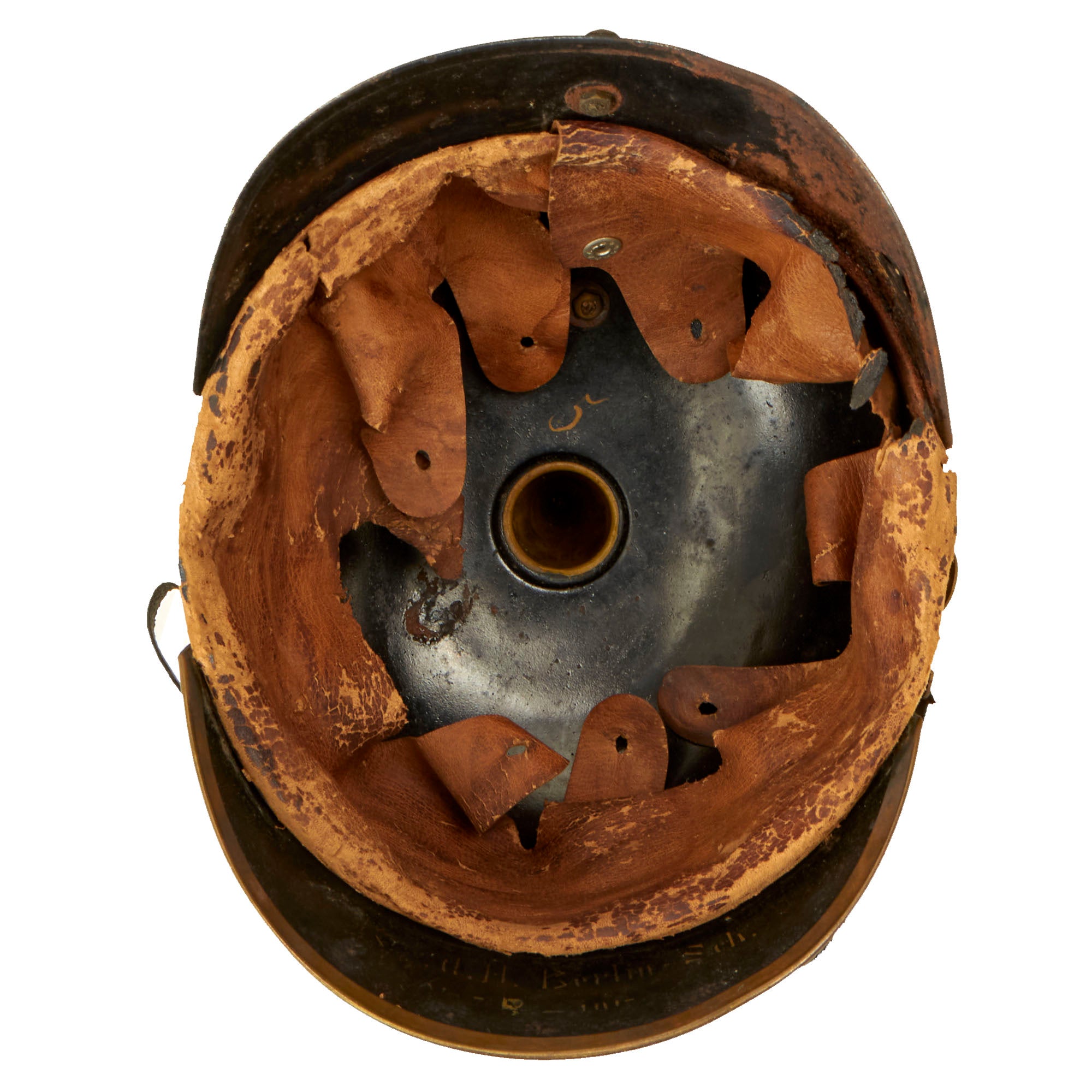 The front visor has brass trim in very good condition. Wappen, spike, and brass trim are all in good order, fitted tightly in place, and (obviously to us) never modified, removed, or played with in any way. Overall, the exterior with the original paint and finish is in great condition, showing some heavy oxidation and chipping on the back-right side. The leather liner is still present but it is very weak.