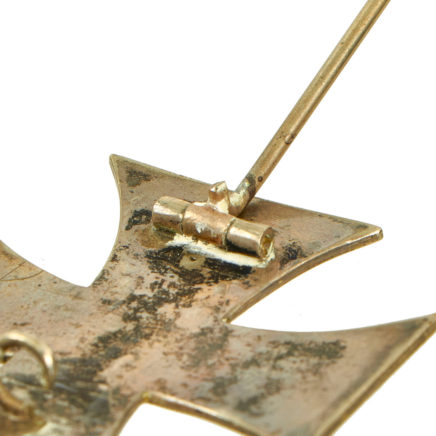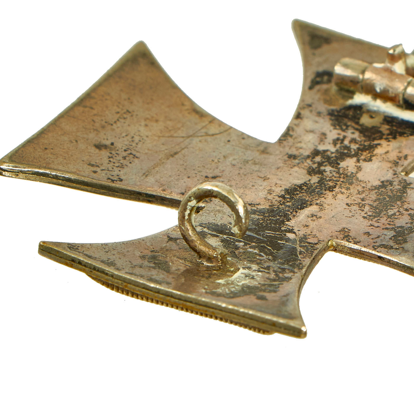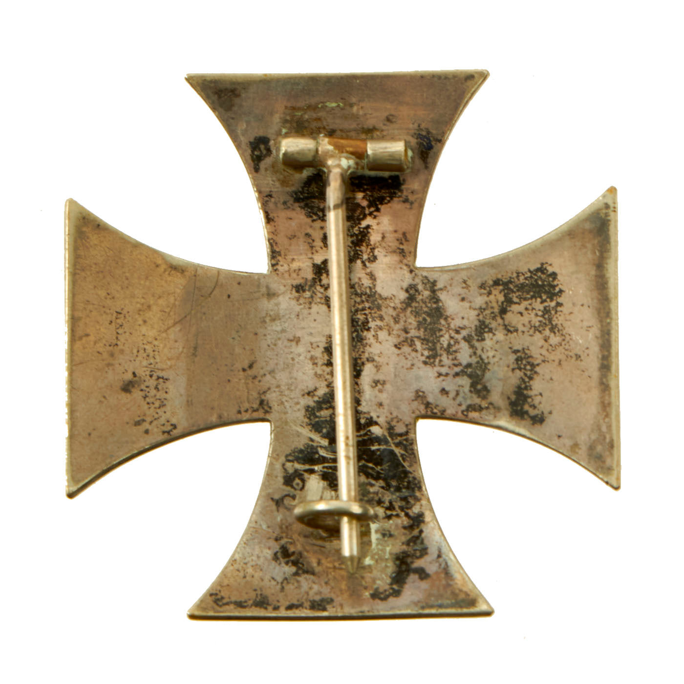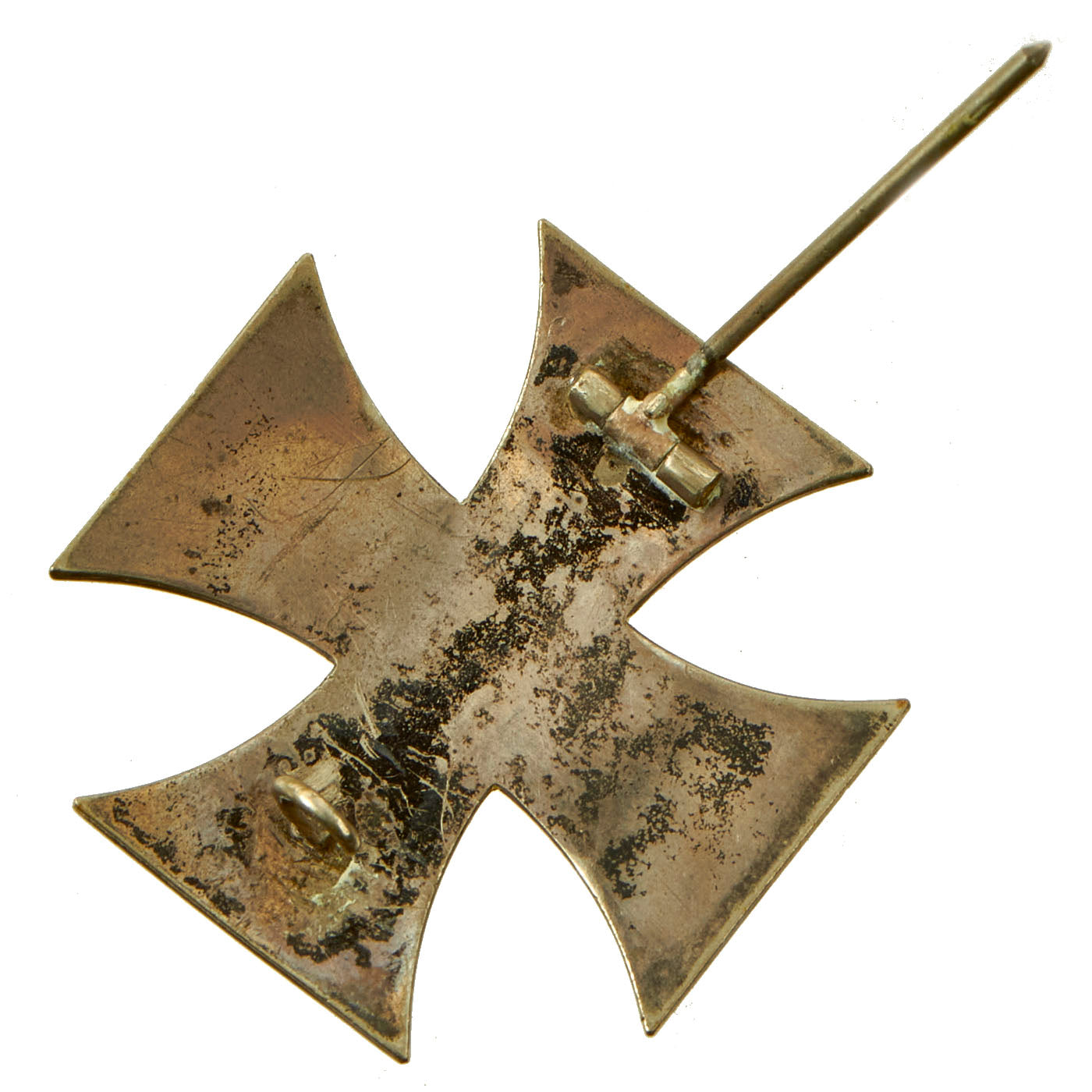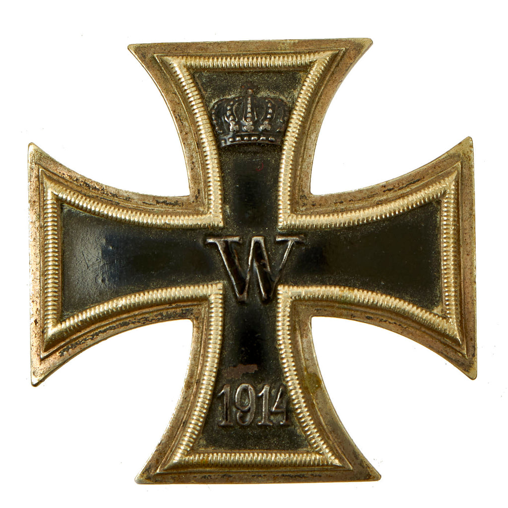The basic design of the WW1 crosses is a central Tatzenkreuz (cross pattée) struck from iron and mounted in a silver frame which has a raised crenulated decorative border. The obverse of the cross bears the date 1914 under a crowned W monogram. Second class crosses would have a ring at the top where a ring was attached, and had more markings on the back. The first class award, however, was meant to attach directly to the front of the uniform, and this example has a double barrel hinge, a soldered catch, and a securing pin. There is no maker mark on this award that we can see, but that is not uncommon.