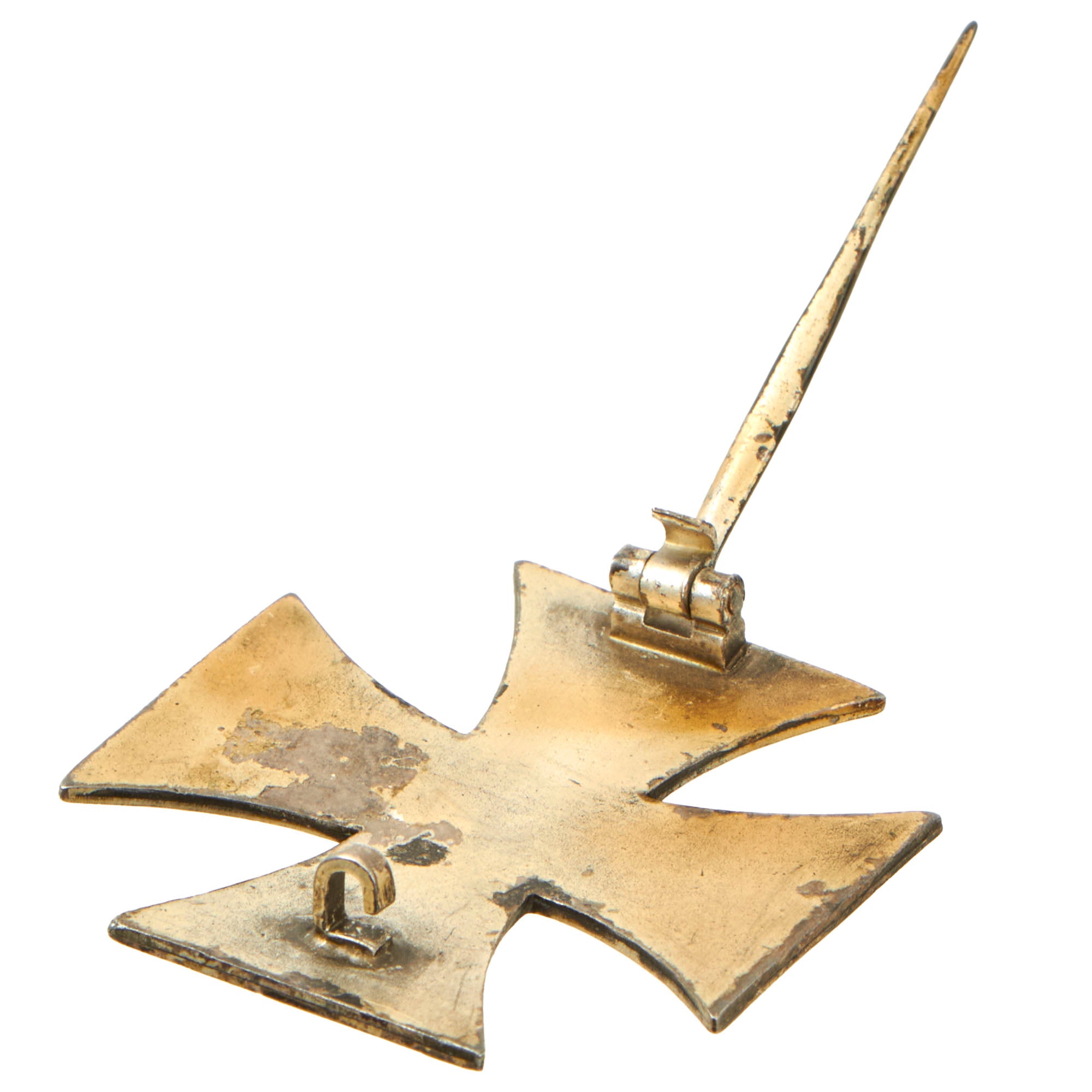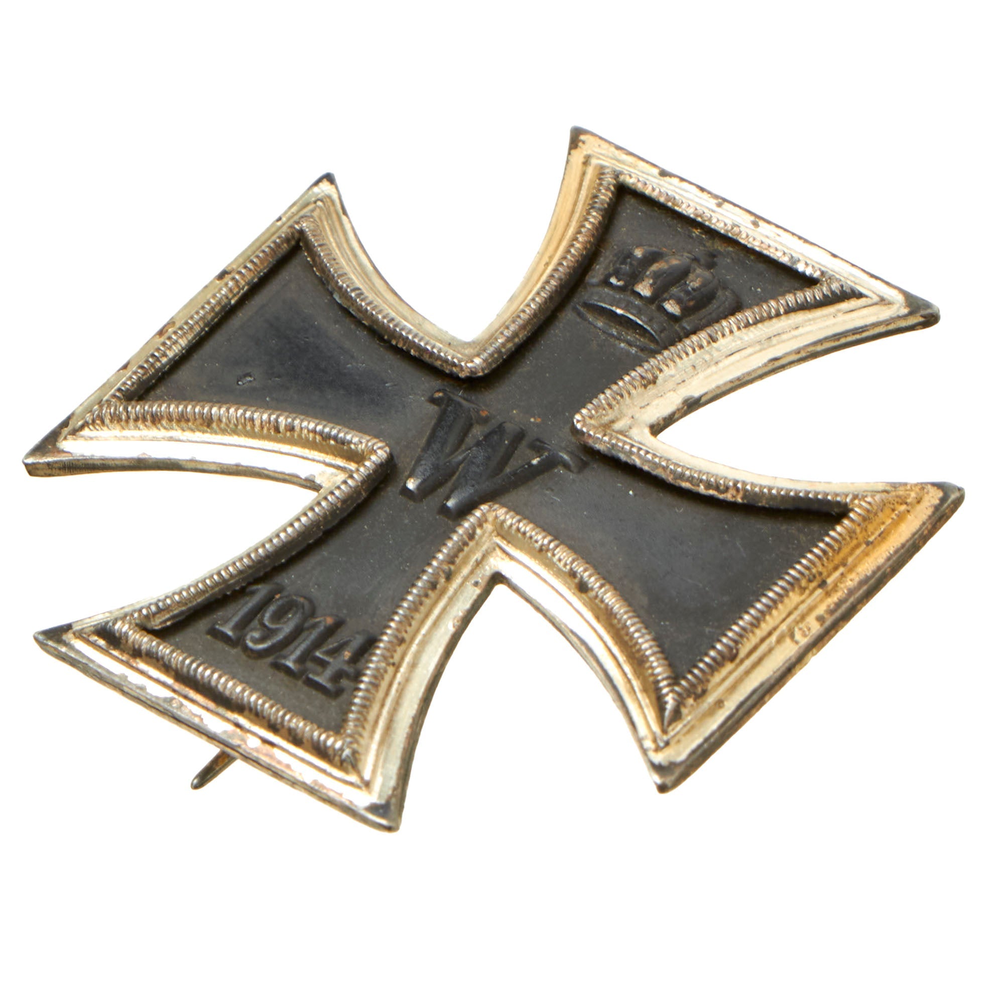 The basic design of the WW1 crosses is a central Tatzenkreuz (cross pattée) struck from iron and mounted in a silver frame which has a raised crenulated decorative border. The obverse of the cross bears the date 1914 under a crowned W monogram. Second class crosses would have a ring at the top where a ring was attached, and had more markings on the back. The first class award, however, was meant to attach directly to the front of the uniform, and this example has a barrel hinge, a soldered catch, and a securing pin. There is no maker marked on the back of the badge, but that is not uncommon at all.