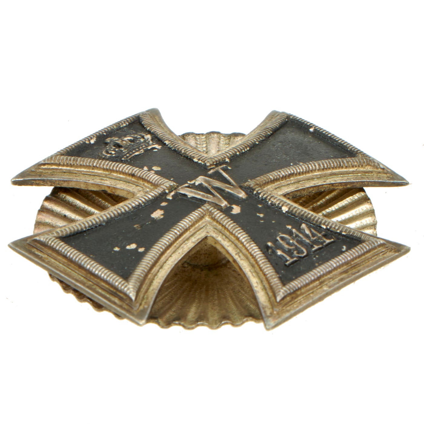The basic design of the WW1 crosses is a central cross patee struck from metal and mounted in a silver frame which has a raised crenulated decorative border. The obverse of the cross bears the date 1914 under a crowned W monogram. Second class crosses would have a ring at the top where a ring was attached, and had more markings on the back. The first class award, however, was meant to attach directly to the front of the uniform, and this example has a rare "screw back" attachment, utilizing a scalloped plated white metal back. Definitely an interesting example!