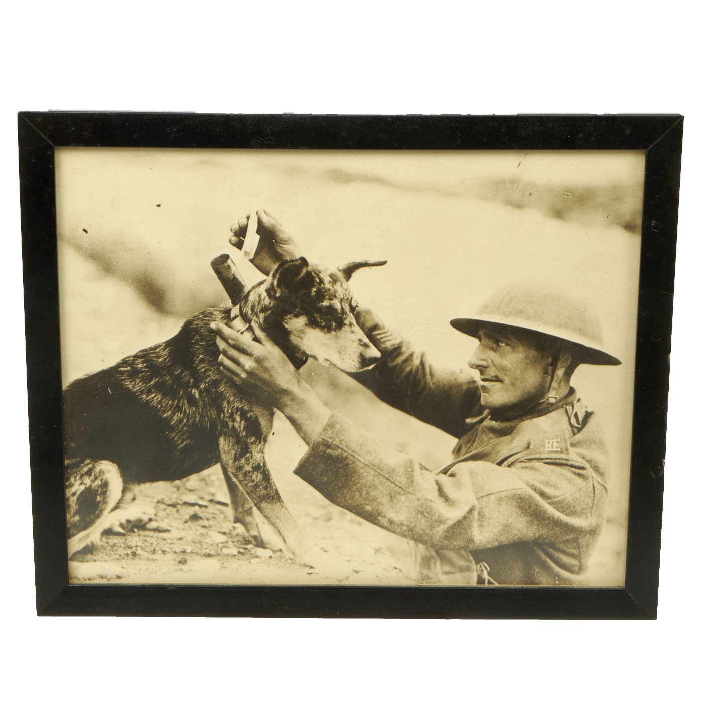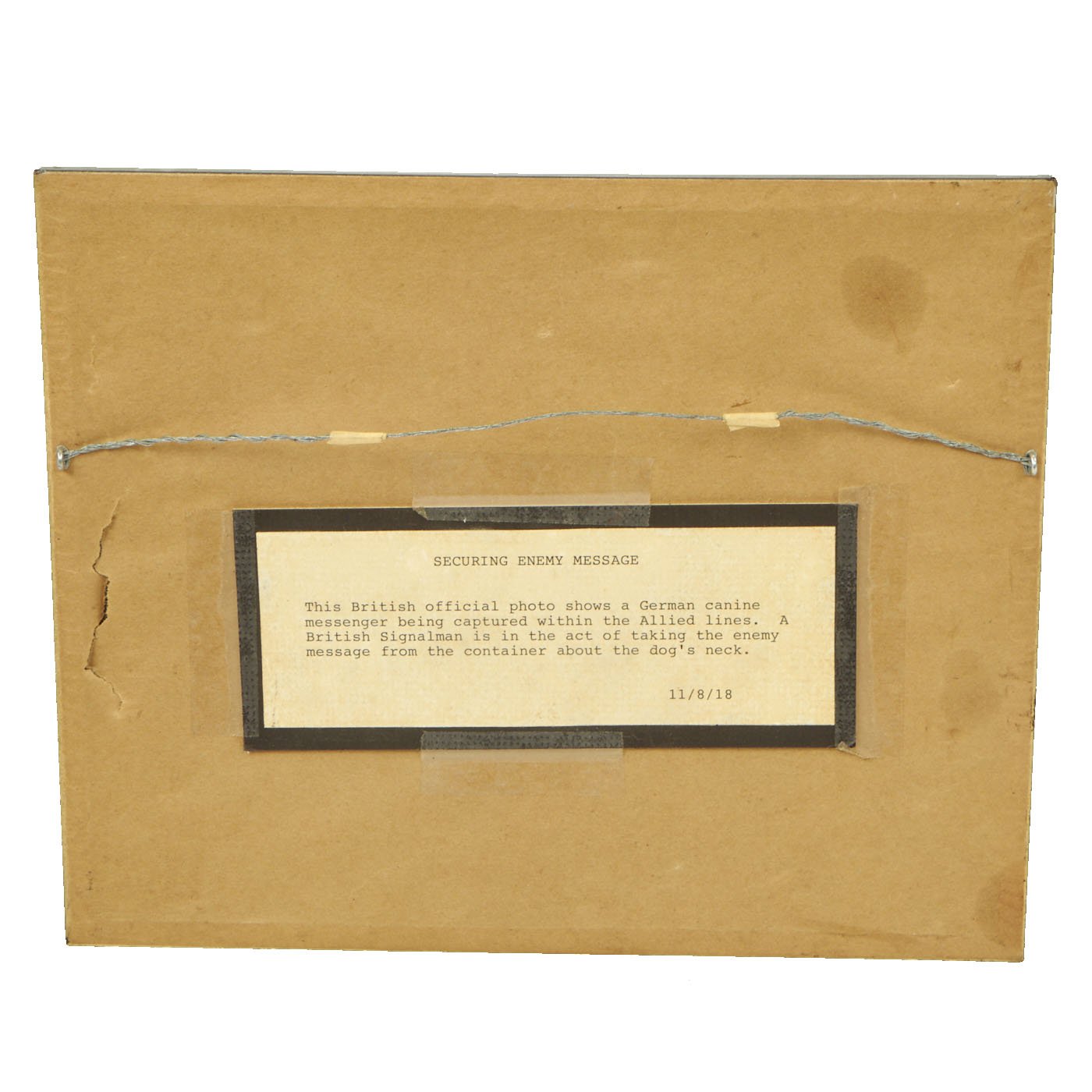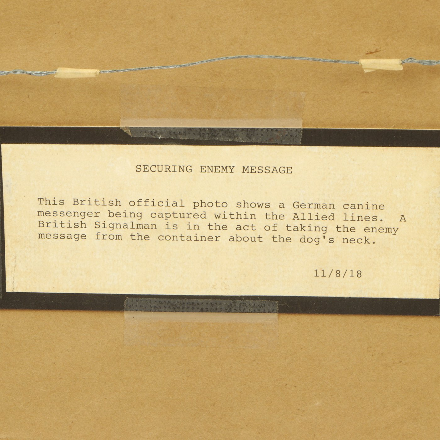 Along with this is a photograph, almost certainly a reprint, of a British Soldier removing a message from the tube on a captured German messenger dog. The rear of the framed photograph has the following text explanation:
