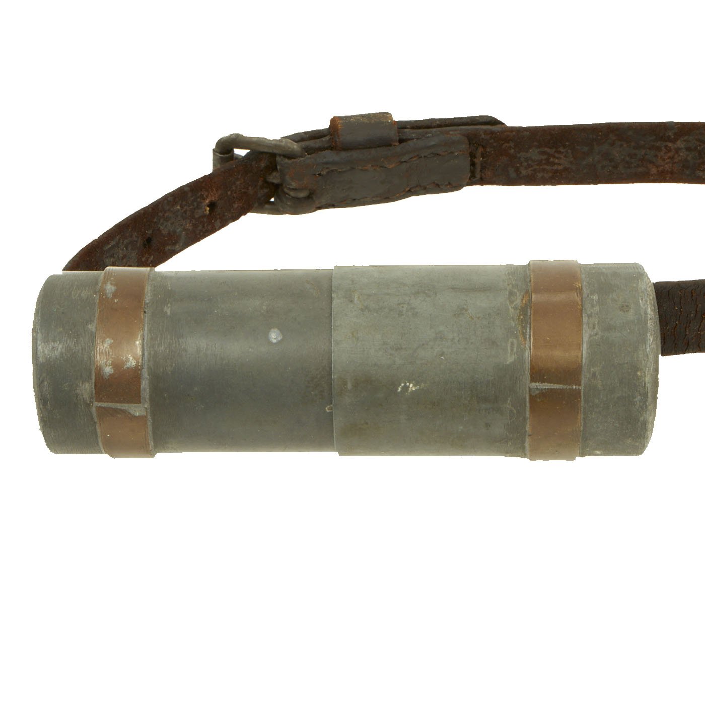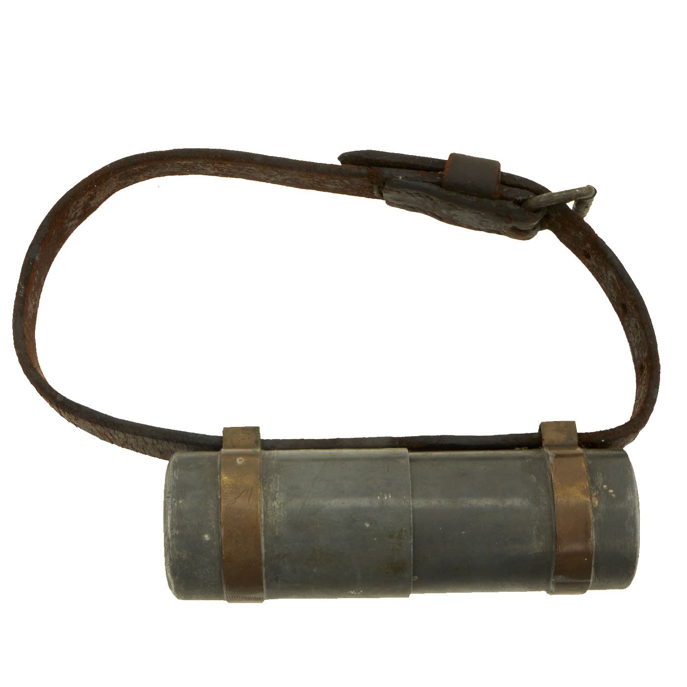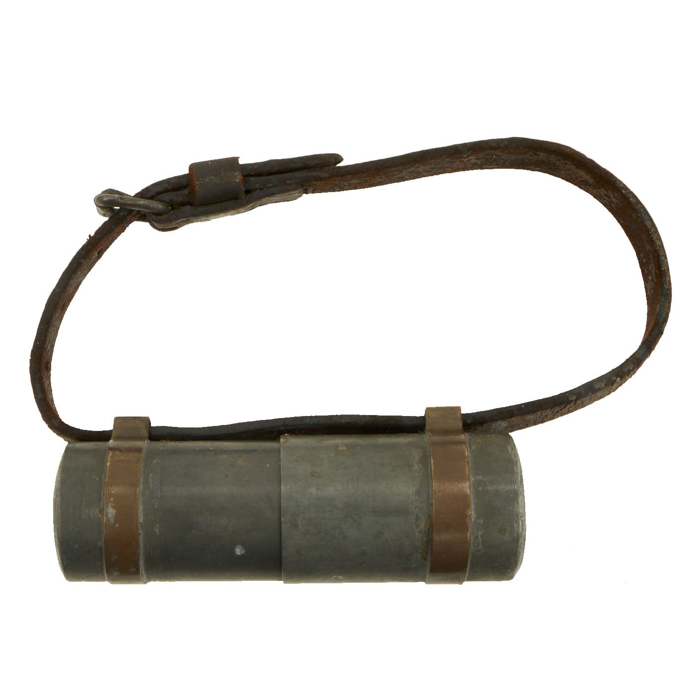 Here we have a very nice Imperial German Canine Message Tube, attached to a leather dog collar. The tube itself measures 5 1/8” long by 1 1/2 inch in diameter, made from sheet zinc with brass bands with loops. Through these is threaded a dog collar about 5 inches in diameter, with the 100 year old leather delicate and worn. This is the first example we have had of one of these extremely rare items!