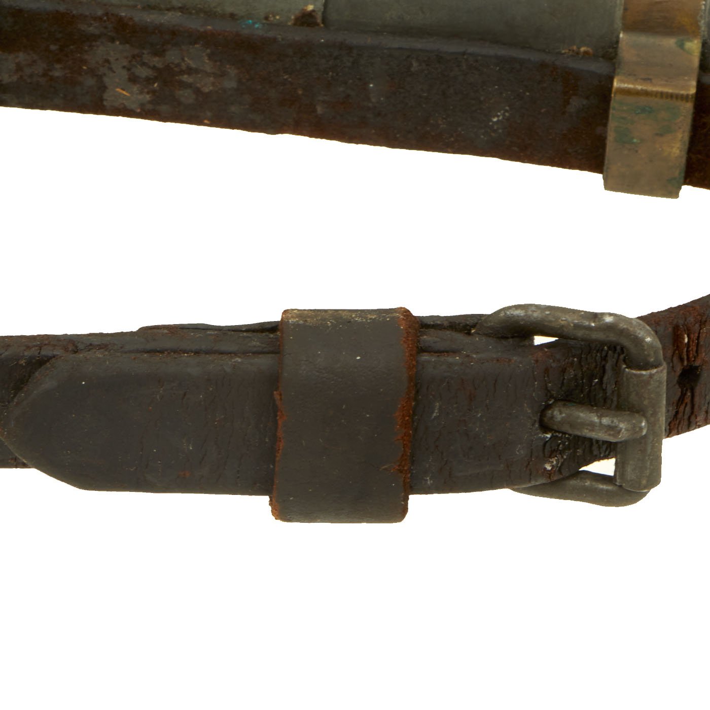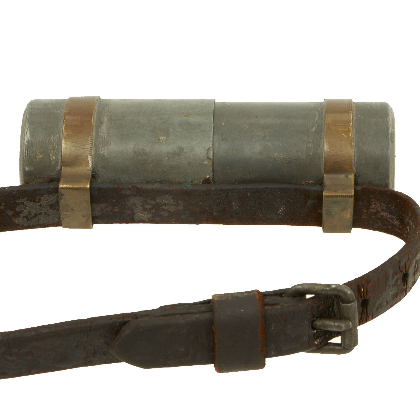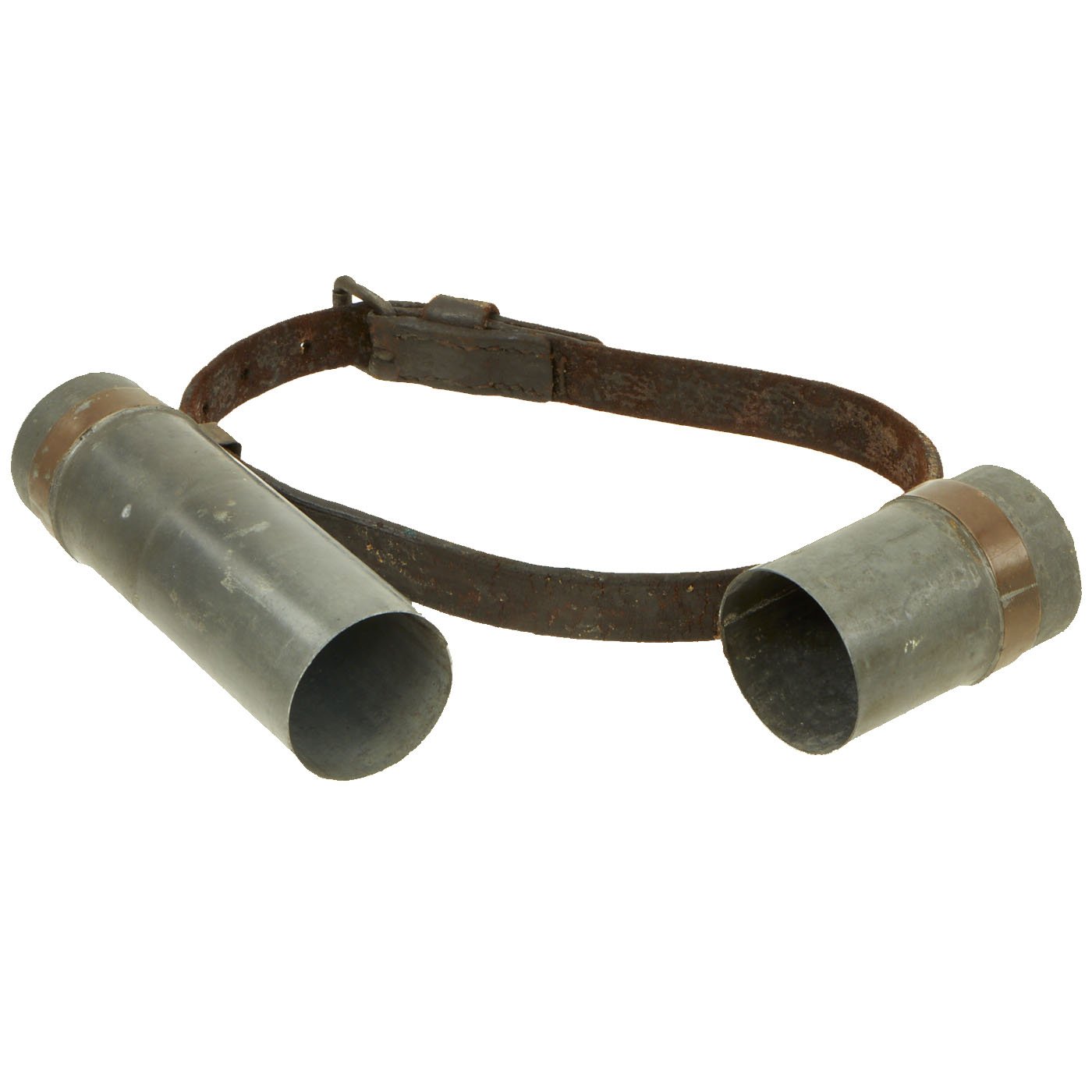 Here we have a very nice Imperial German Canine Message Tube, attached to a leather dog collar. The tube itself measures 5 1/8” long by 1 1/2 inch in diameter, made from sheet zinc with brass bands with loops. Through these is threaded a dog collar about 5 inches in diameter, with the 100 year old leather delicate and worn. This is the first example we have had of one of these extremely rare items!
