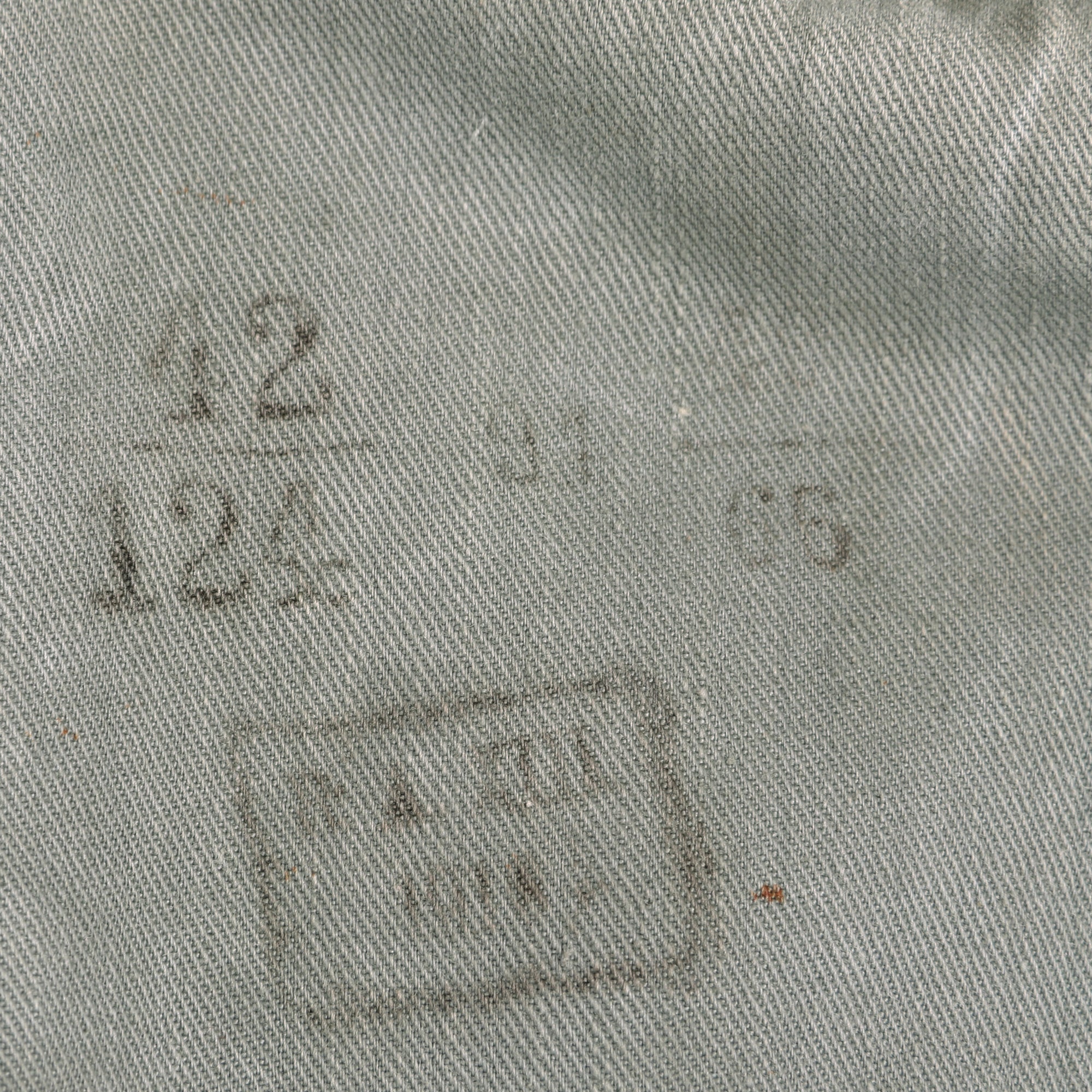 The interior lining shows wear consistent with service, however it does still bear faded size and depot markings on the left front upper interior. These are unfortunately too faded to read completely, though we are fairly certain that there is a WWI date as part of the depot marking. The rear lower liner also is named to the soldier who owned it, with a crossed out enlisted rank over an NCO rank.
