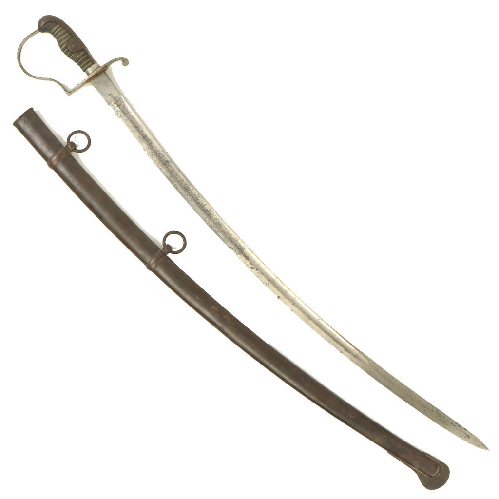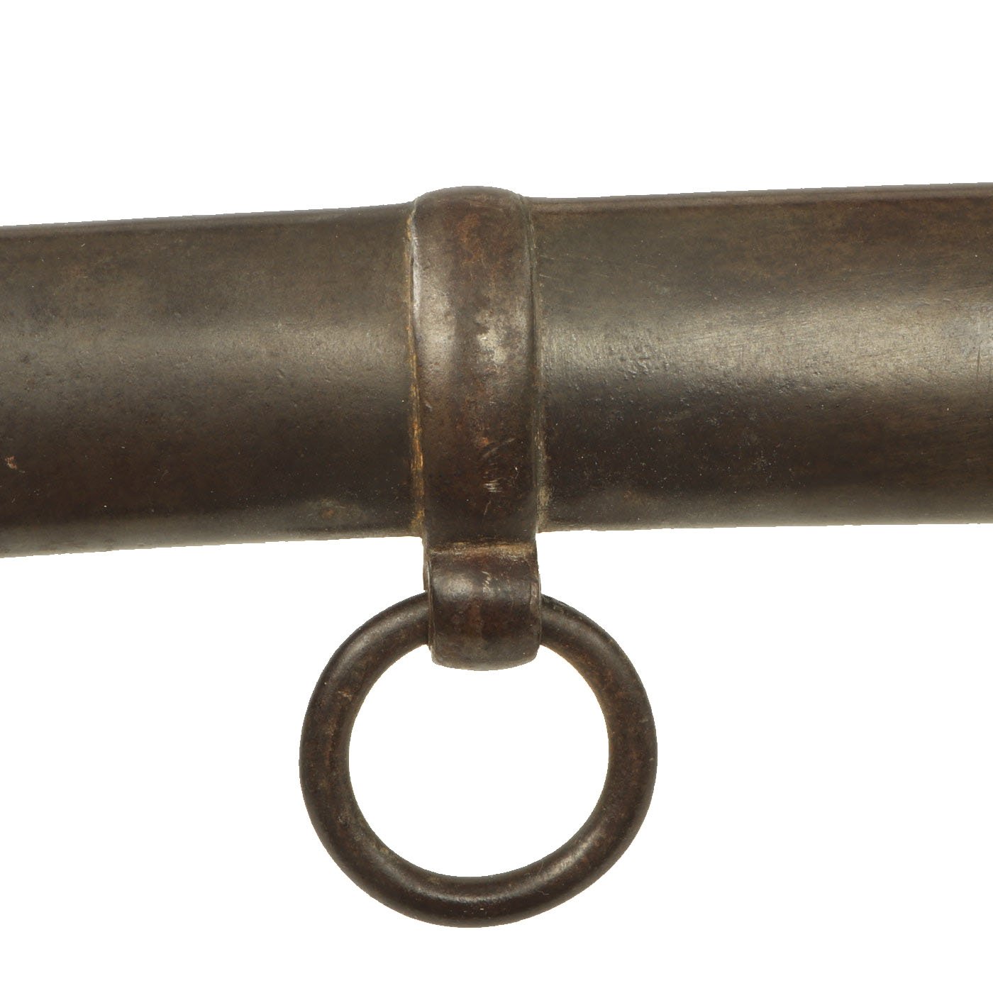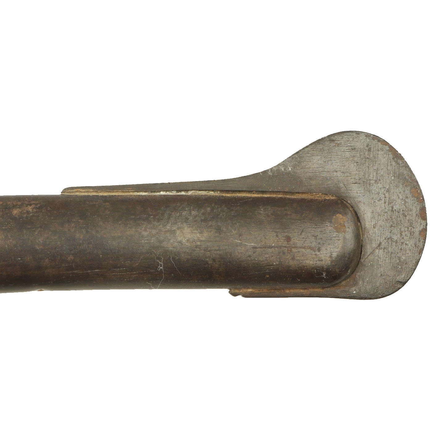 The sword also has the the characteristic single knuckle bow "P-Shaped" hand guard of the standard artillery saber. The crossguard does not have any chappe or rainguard attachments, and there are the usual back strap side tabs. The included scabbard looks to be for some other type of saber, probably a U.S. Cavalry saber or something similar. The sword fits, but as the curve is not quite correct, it can get stuck. Overall condition is very good, with wear and oxidation commensurate with age and service.