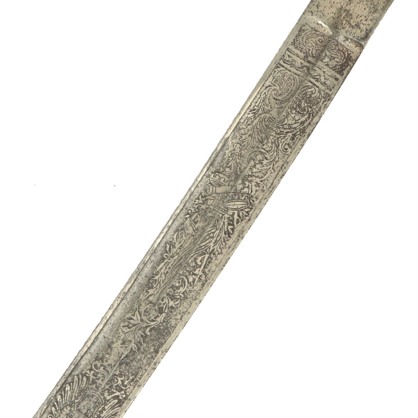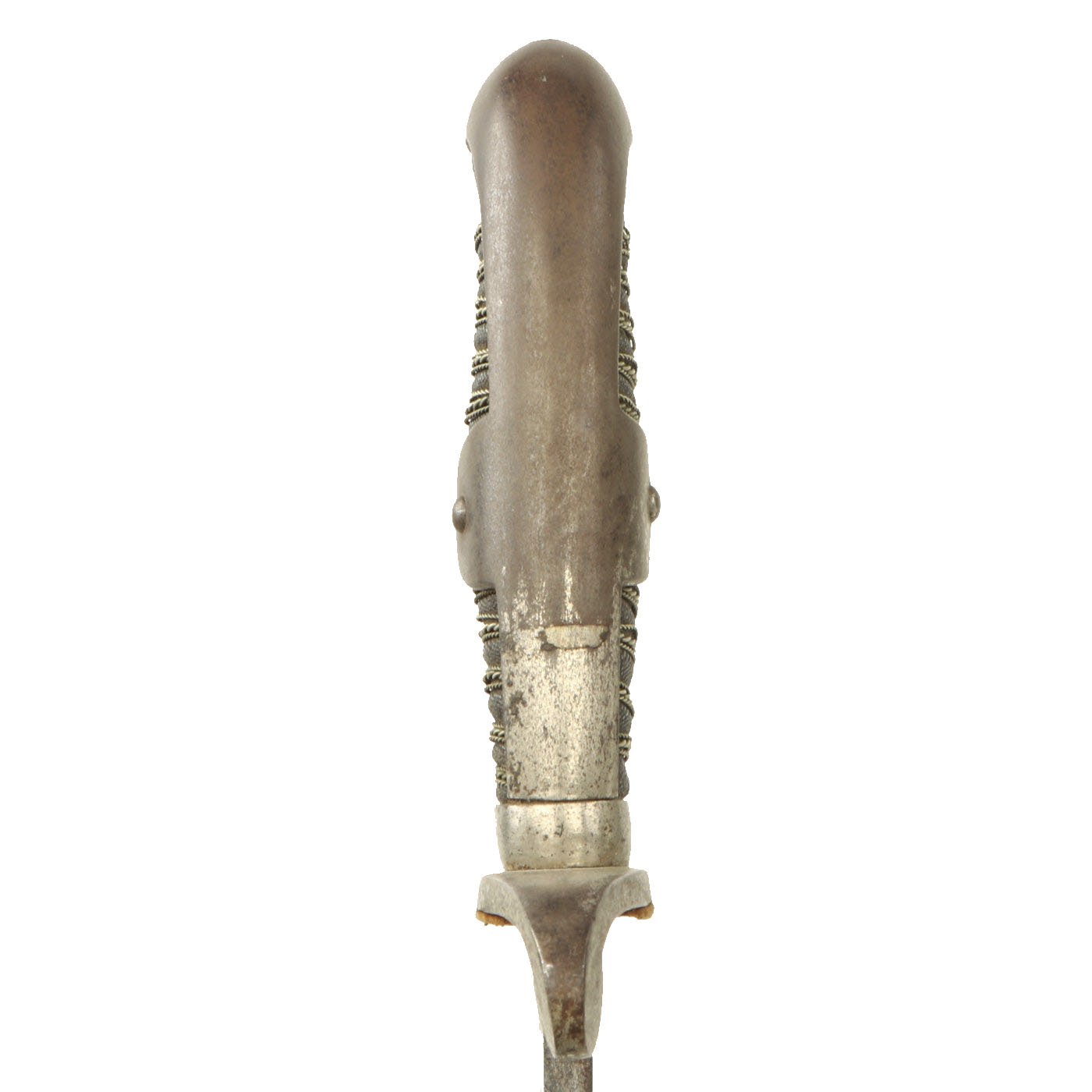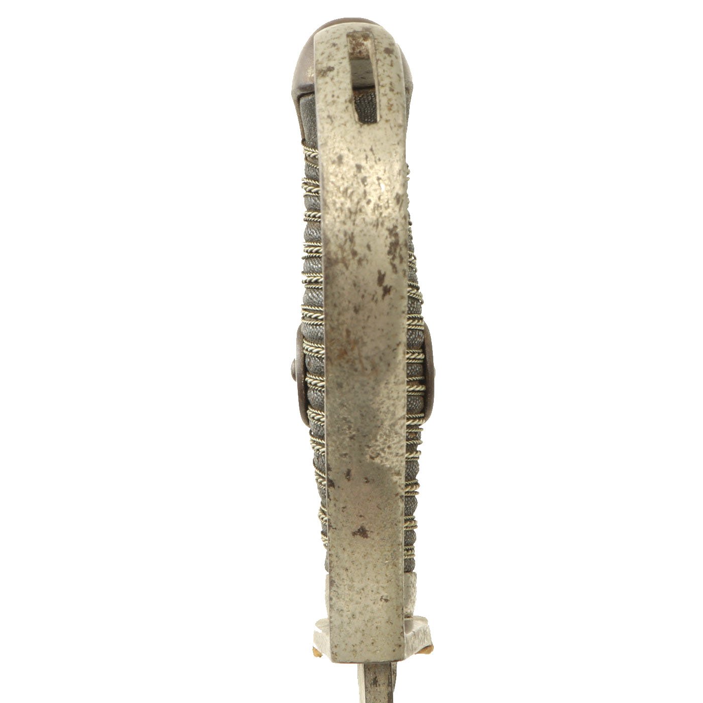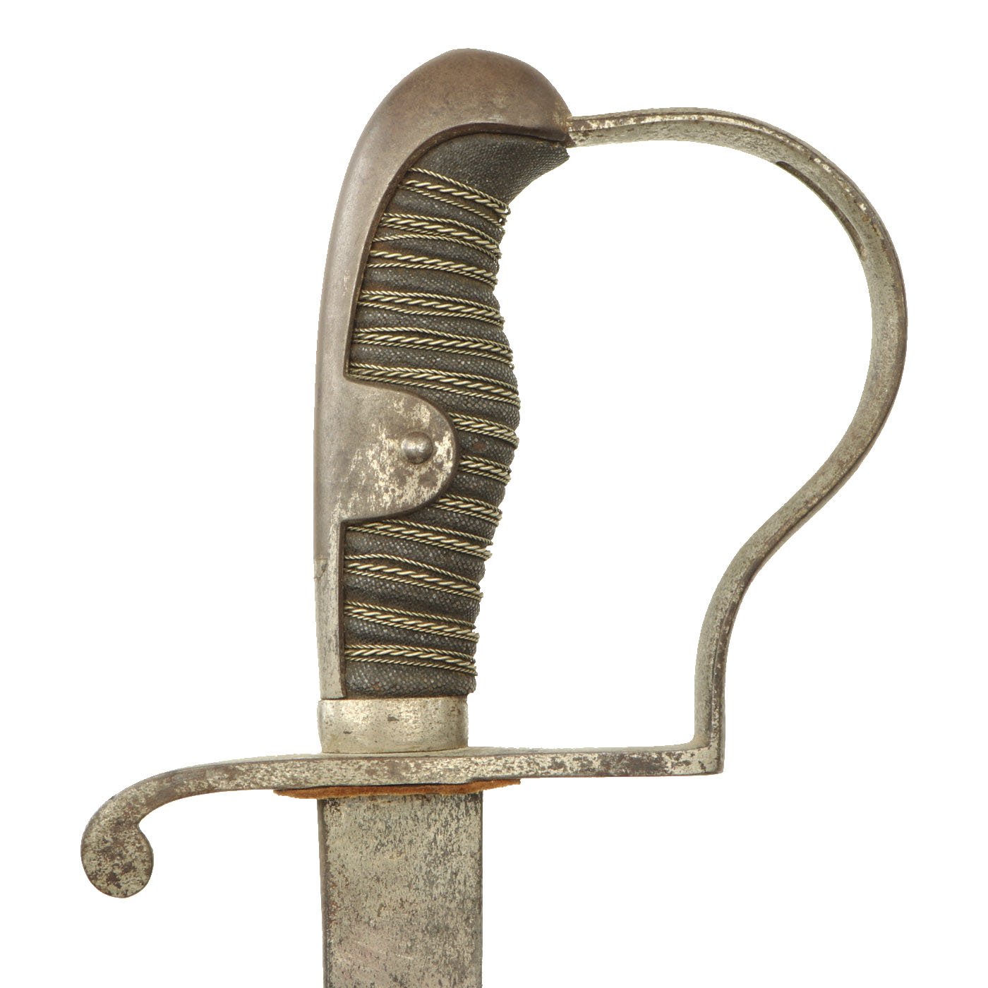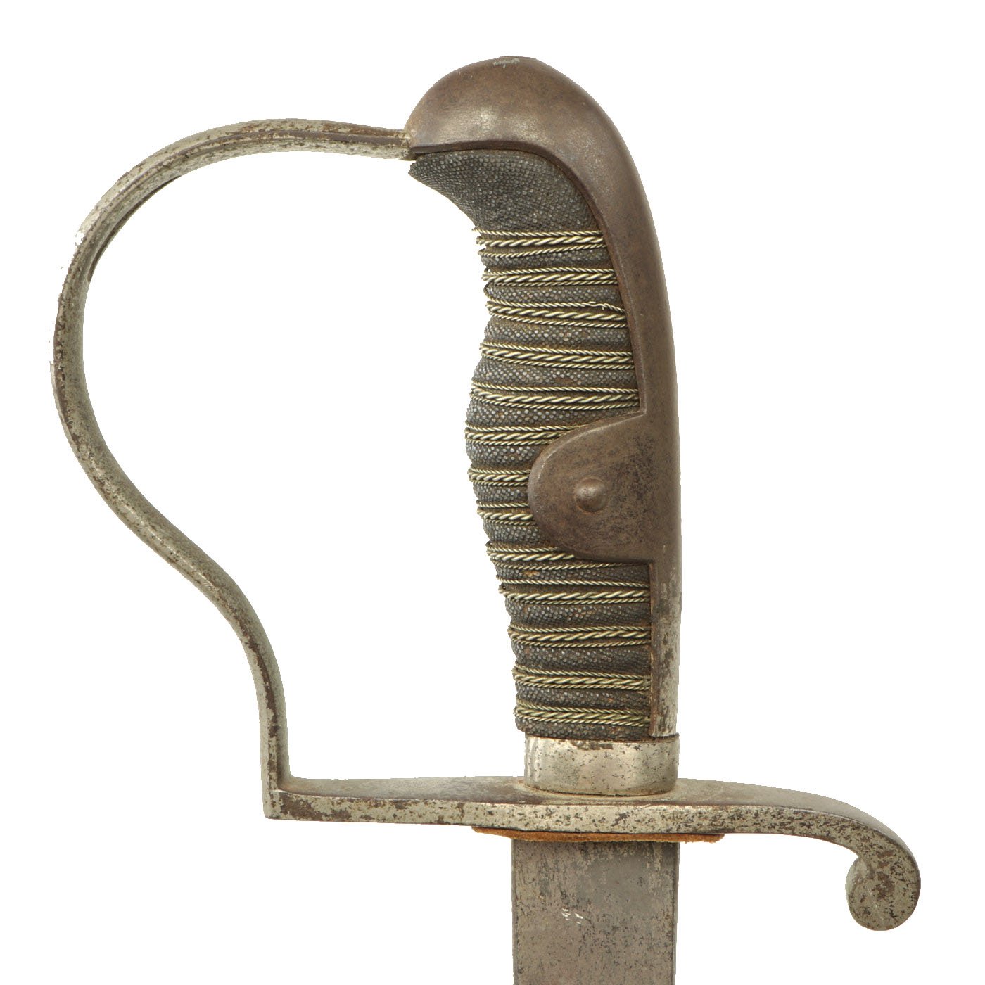 This example looks to have been "dressed up", most likely purpose made as a presentation sword, as the blade is fully blunt. It was originally fully nickel plated, and has a lovely triple etched blade. It has a sharkskin grip, wrapped with three pairs of twisted wire.