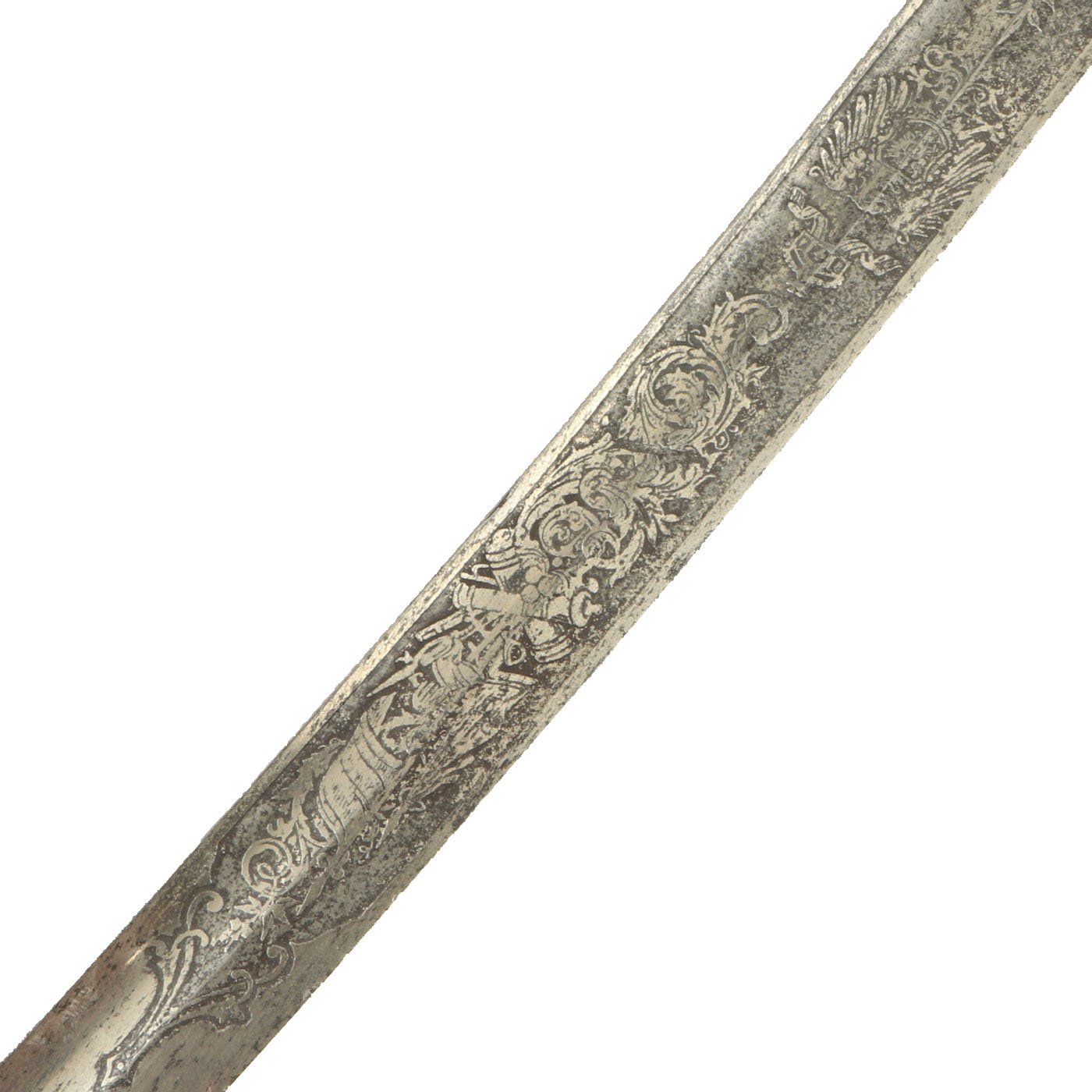 One side of the blade is etched the usual stands of arms, as well as the Prussian Imperial Eagle, and of course the "crossed cannon" for an artillery officer. The other side has the regimental designation, in Black Letter typeface: