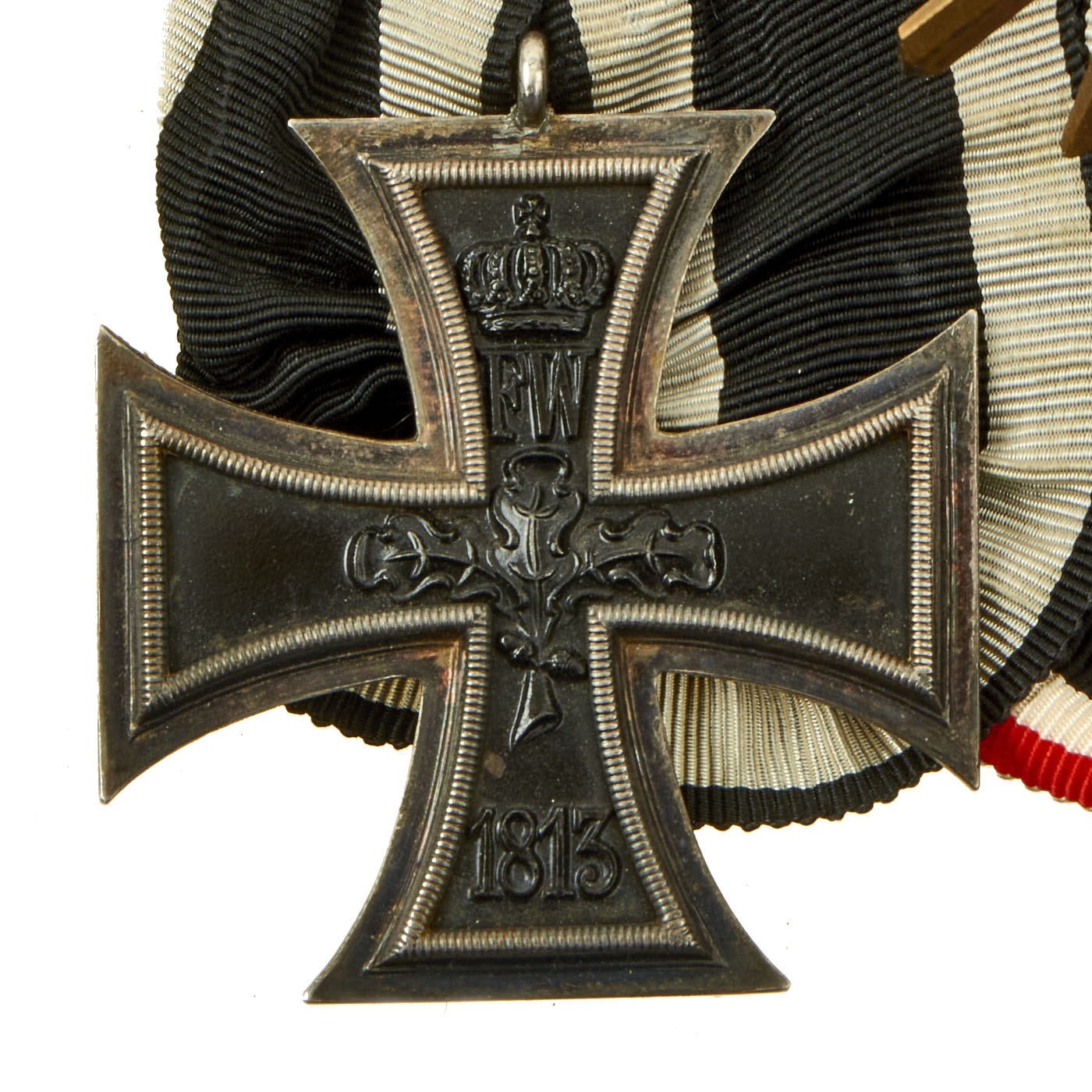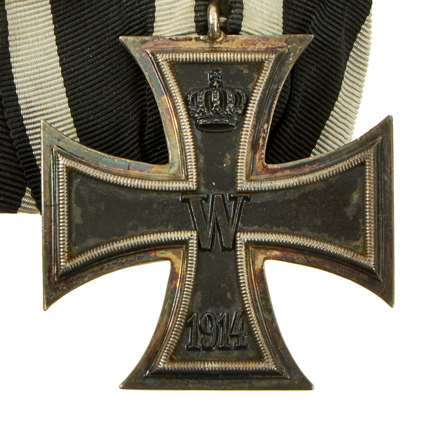 The basic design of the WW1 crosses is a central Tatzenkreuz (cross pattée) struck from iron and mounted in a silver frame which has a raised crenulated decorative border. The obverse of the cross bears the date 1914 under a crowned 'W' monogram. Reverse bears an oak leaf cluster with the date of the decoration’s institution, 1813 underneath - the crowned initials of Frederick William are in the top arm above the oak leaf cluster. Suspension for second-class types is by means of a ring, and frequently this ring bears a maker's stamp.