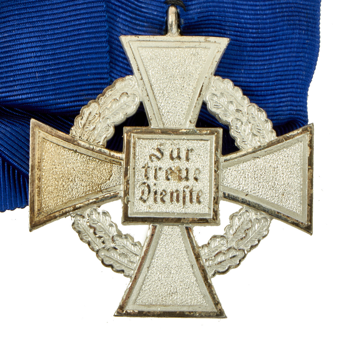 The reverse of both classes was stamped with Für treue Dienste (For faithful Services). in German black letter typeface. The ribbon for the medal is cornflower blue.