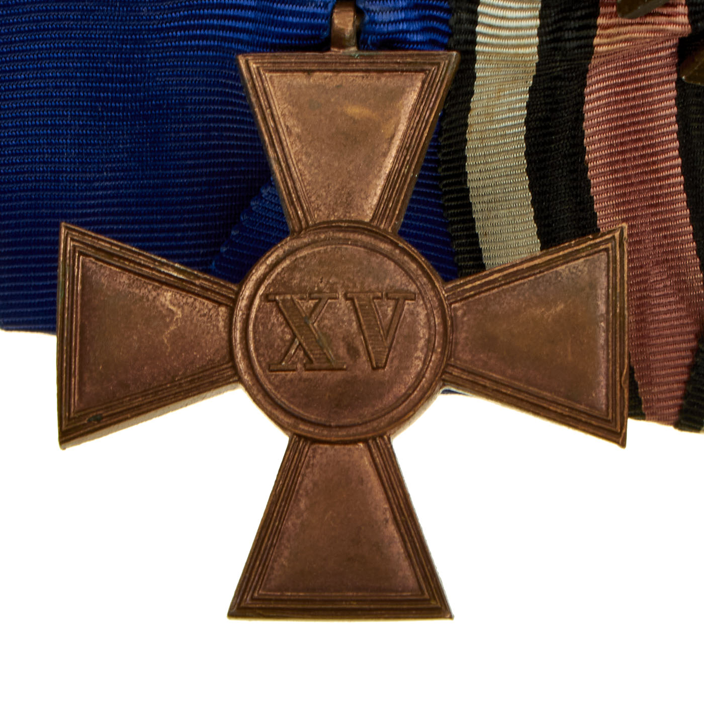 - Imperial German 1st Class Long Service Cross for 15 Years: Instituted July 4, 1913. A straight-armed cross pate constructed of gilded bronze, the obverse center bears the Prussian royal crown, the reverse bears “XV” (for 15 years of service)
