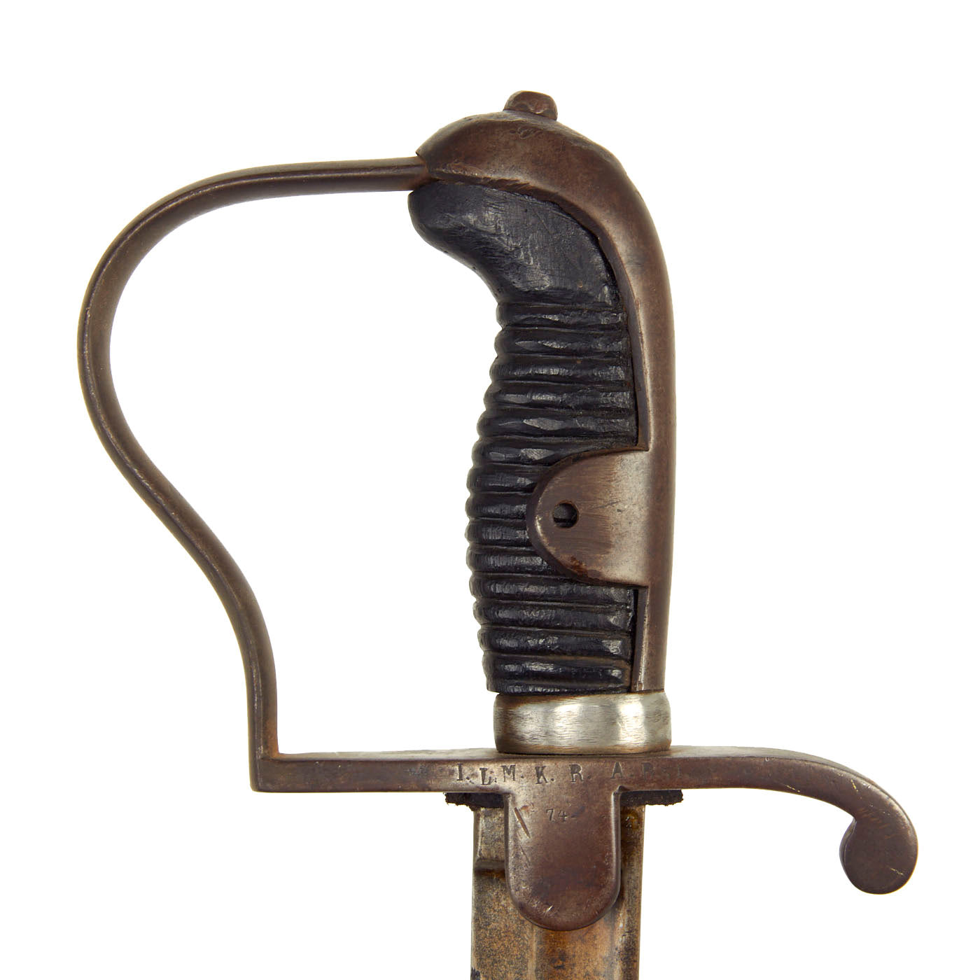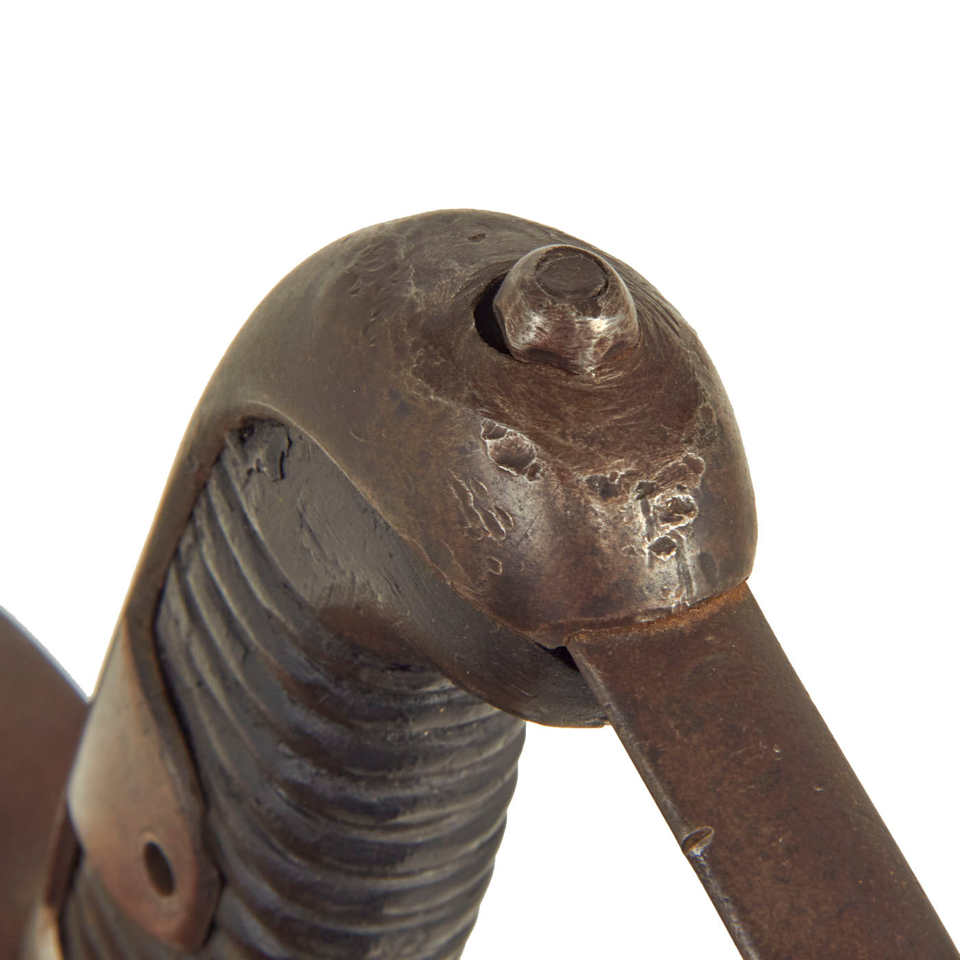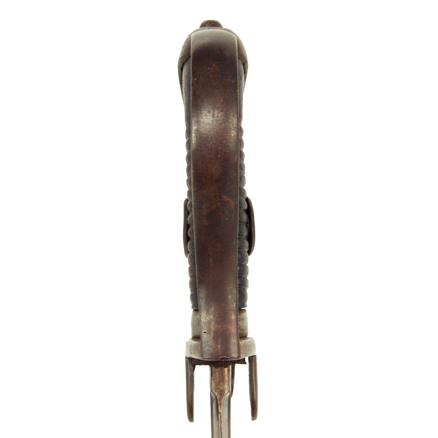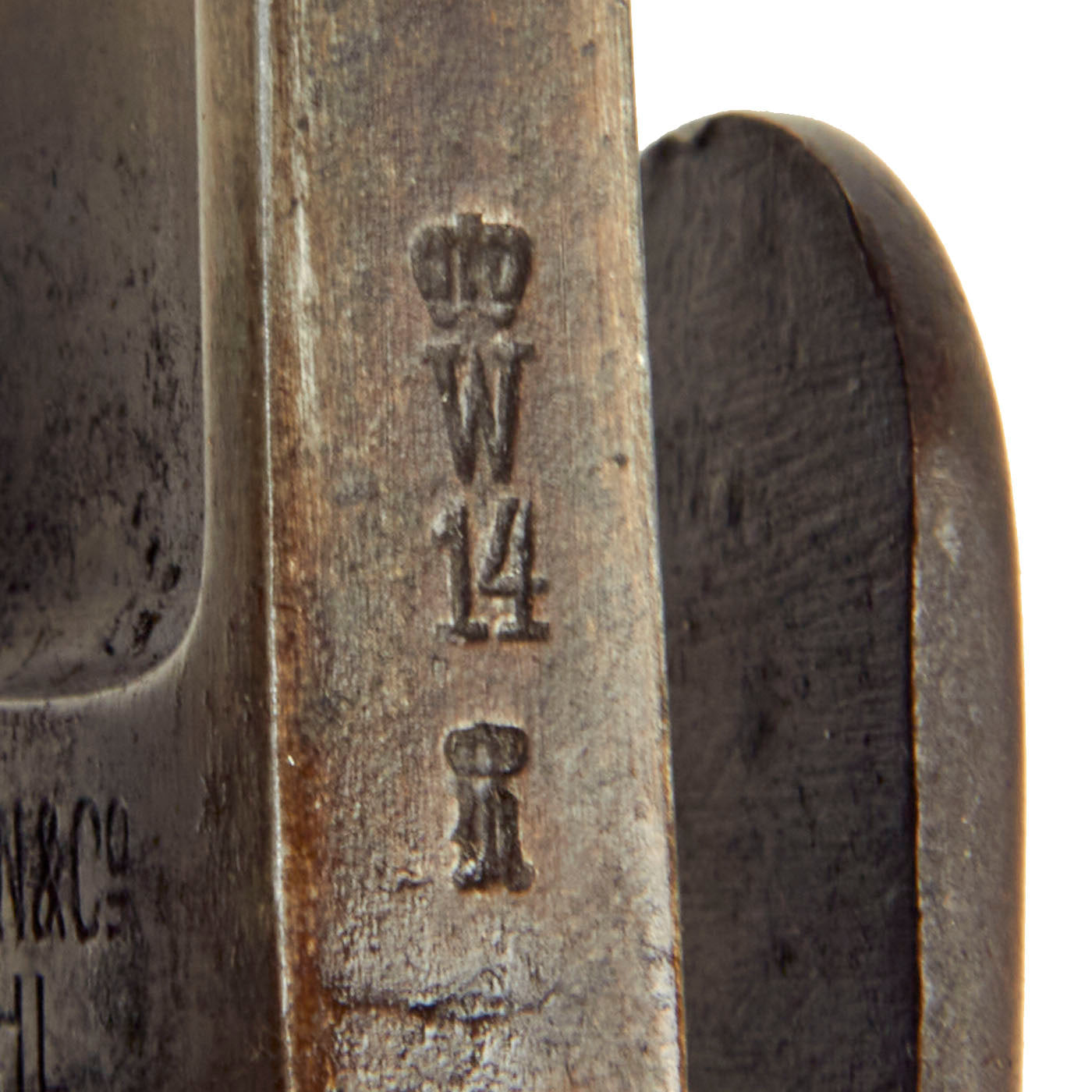 This example is in fine condition showing nice blade condition, with only a few areas of light oxidation. The blade has been sharpened, and there are a few small nicks, but it is still quite nice. It is stamped on the upper spine near the hilt is a small Crown over W over 14 for Kaiser Wilhelm 1914. The maker of the sword is SIMSON & Co. of SUHL and is stamped under the rain guard (chappe), which makes it quite hard to see, and it is partly covered by the leather blade buffer. The sword also has the standard wood wrapped leather as expected on the earlier model swords, with the characteristic single knuckle bow hand guard. Unfortunately the leather is completely missing and the wood is possibly a replacement, as the set screws are missing nor are there any holes present.
