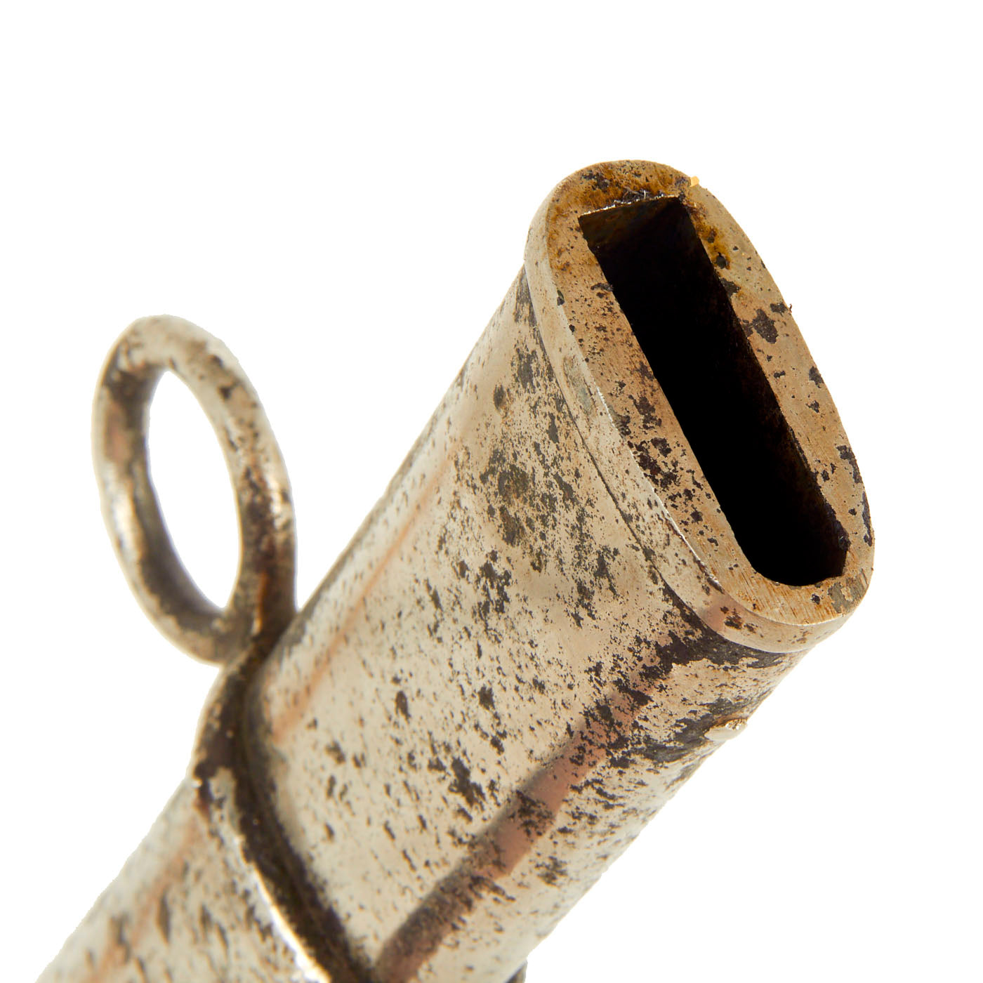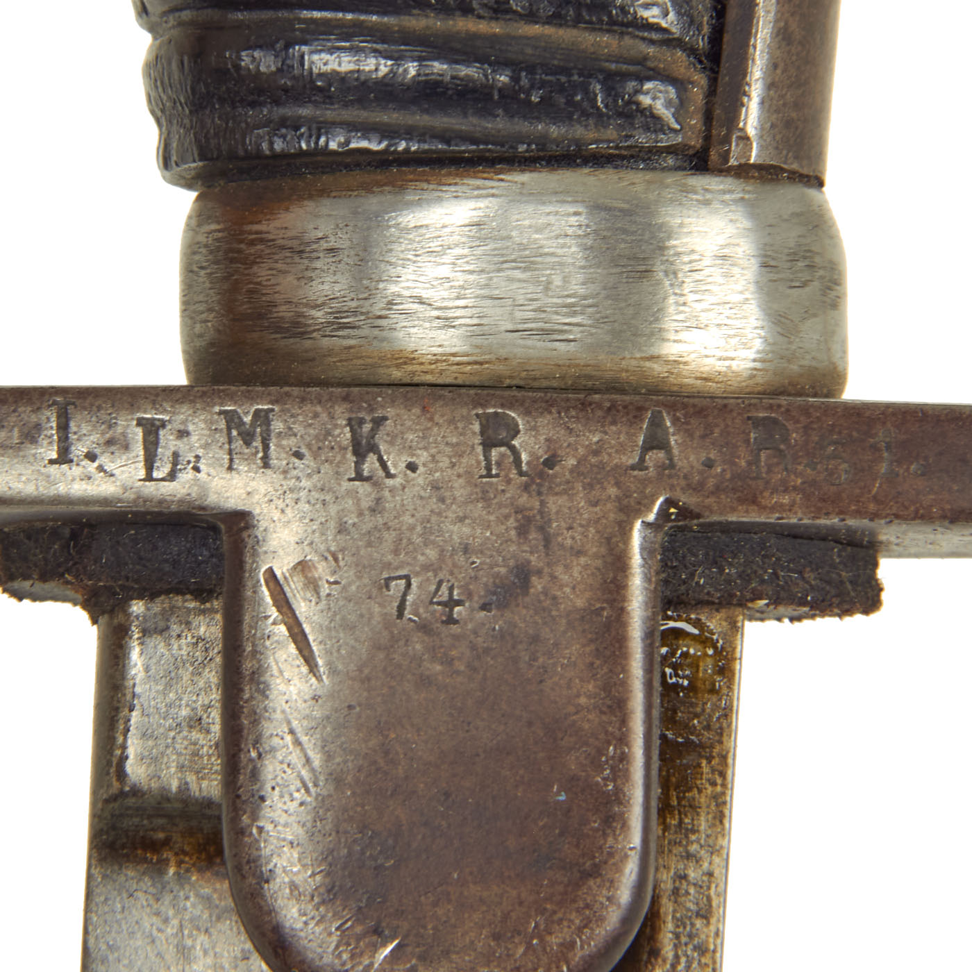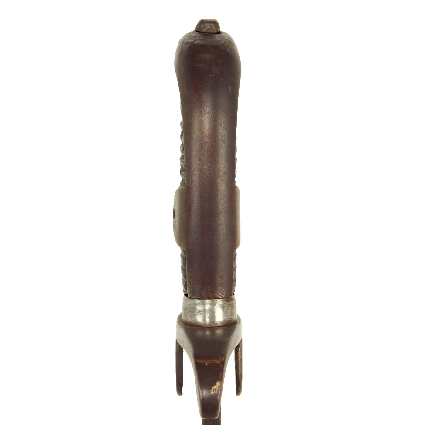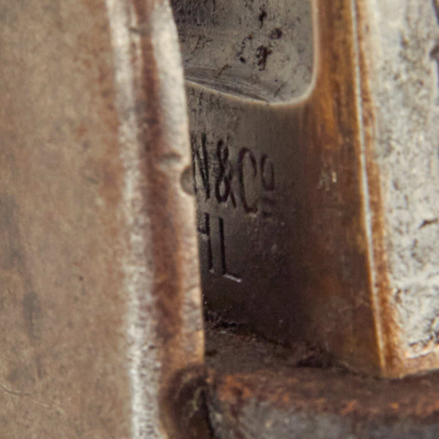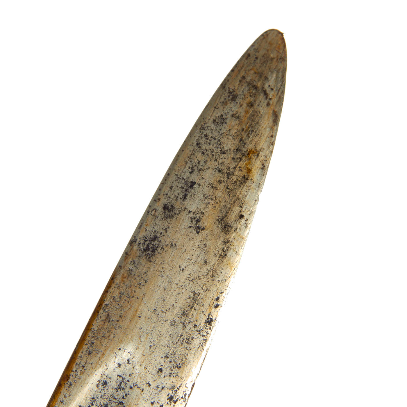 This example is in fine condition showing nice blade condition, with only a few areas of light oxidation. The blade has been sharpened, and there are a few small nicks, but it is still quite nice. It is stamped on the upper spine near the hilt is a small Crown over W over 14 for Kaiser Wilhelm 1914. The maker of the sword is SIMSON & Co. of SUHL and is stamped under the rain guard (chappe), which makes it quite hard to see, and it is partly covered by the leather blade buffer. The sword also has the standard wood wrapped leather as expected on the earlier model swords, with the characteristic single knuckle bow hand guard. Unfortunately the leather is completely missing and the wood is possibly a replacement, as the set screws are missing nor are there any holes present.