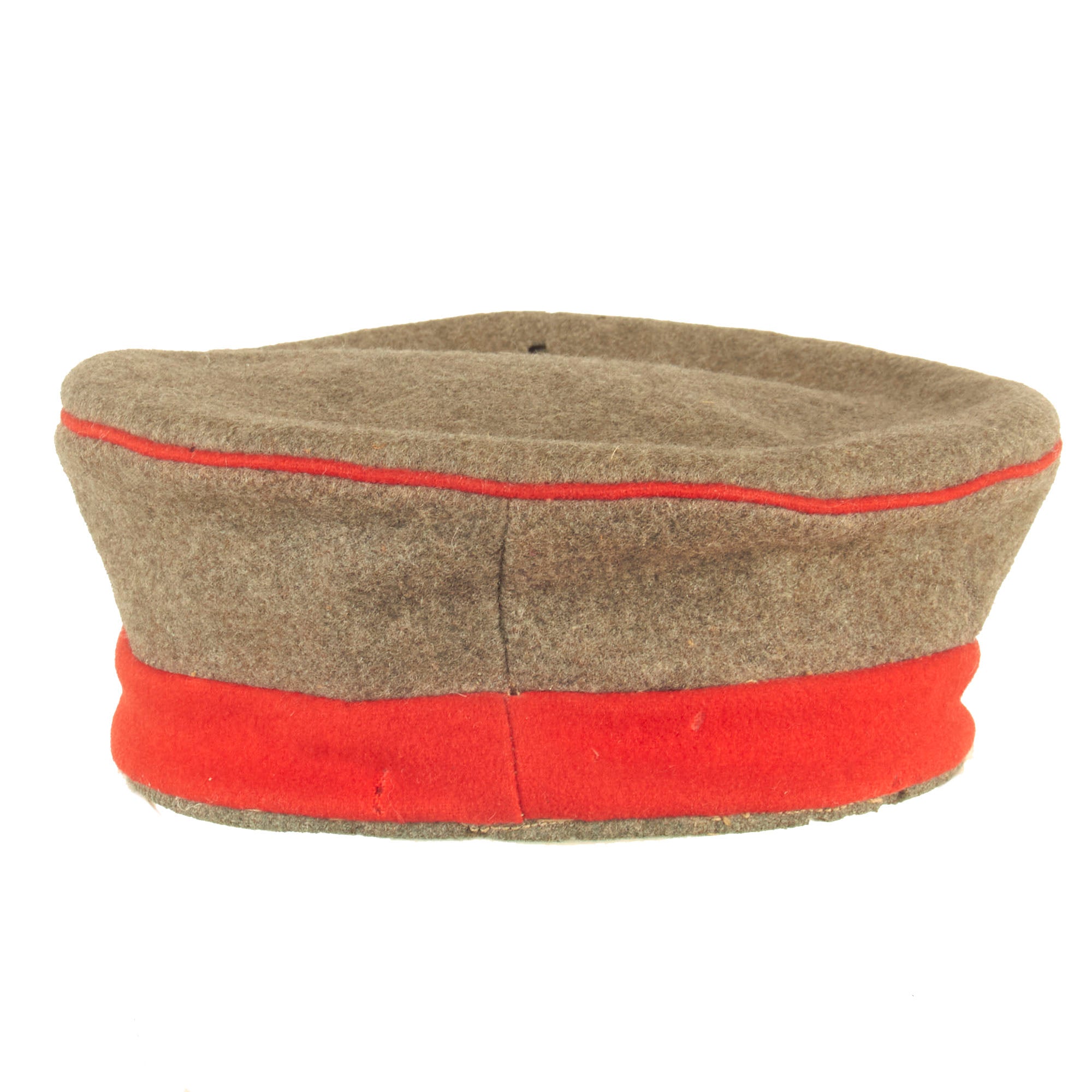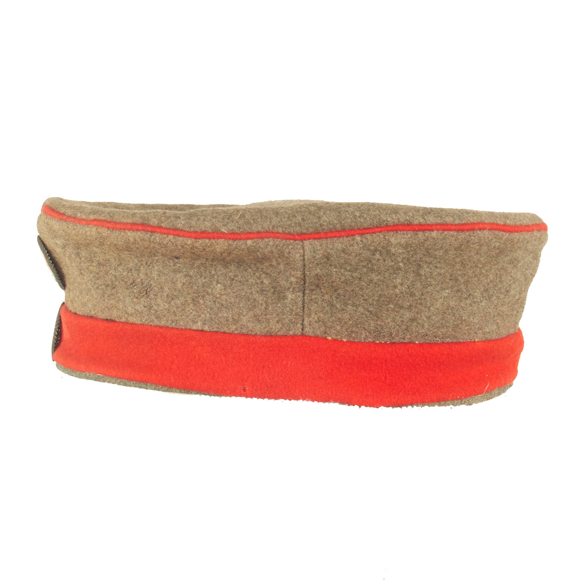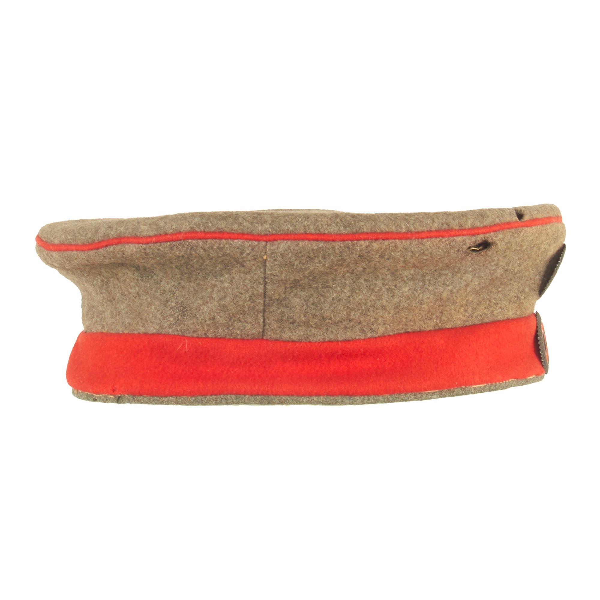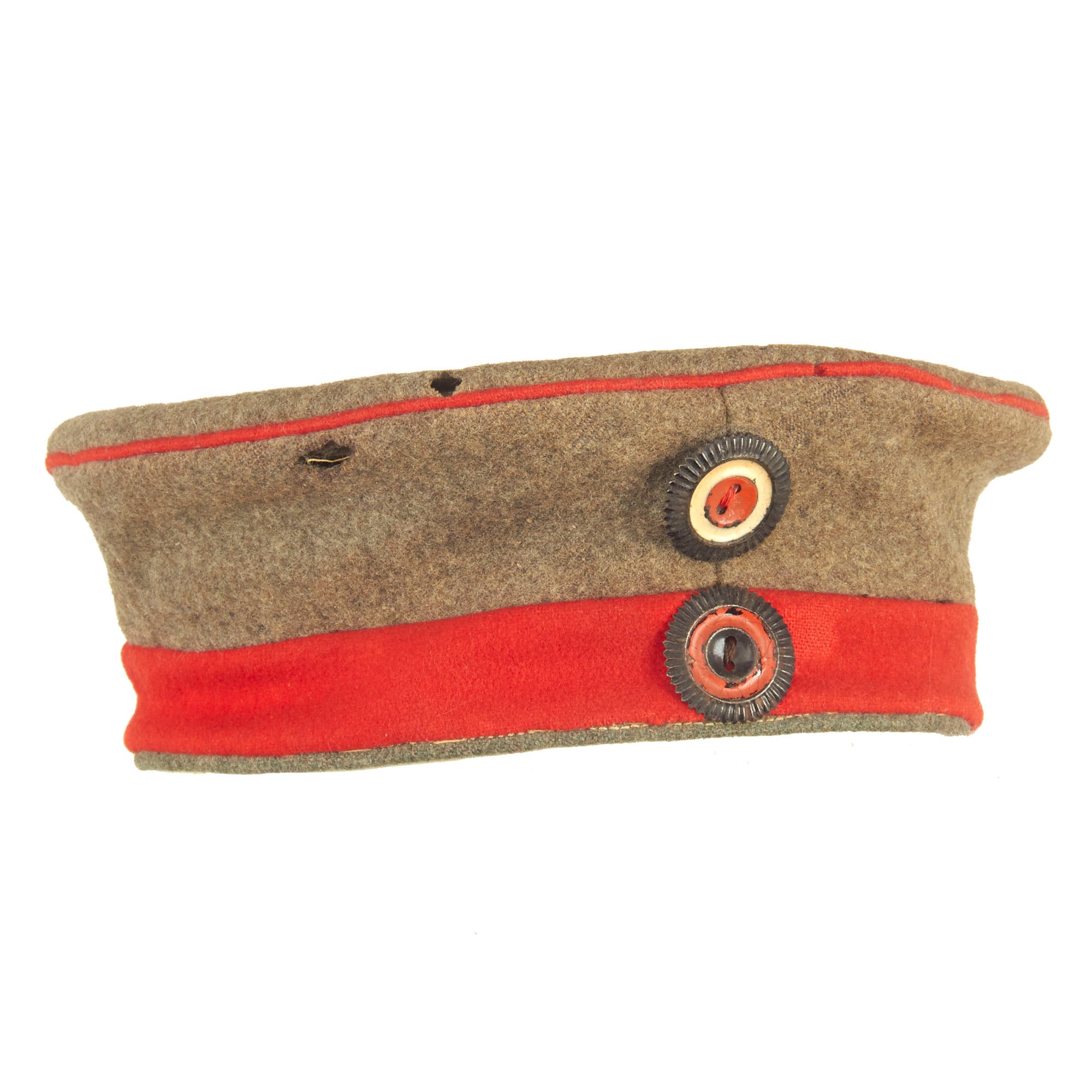 Original Item: Only one available. This is a very nice Great War Imperial German Field Cap (Feldmütze or Krätzche). It is constructed of grey/green "Felgrau" wool with red cap band and red piping along with an interior linen lining. The front of the cap bears a Black, White and Red Reichskokarde (Imperial Cockade) on the front of the crown, with a White and Black cockade for Prussia.