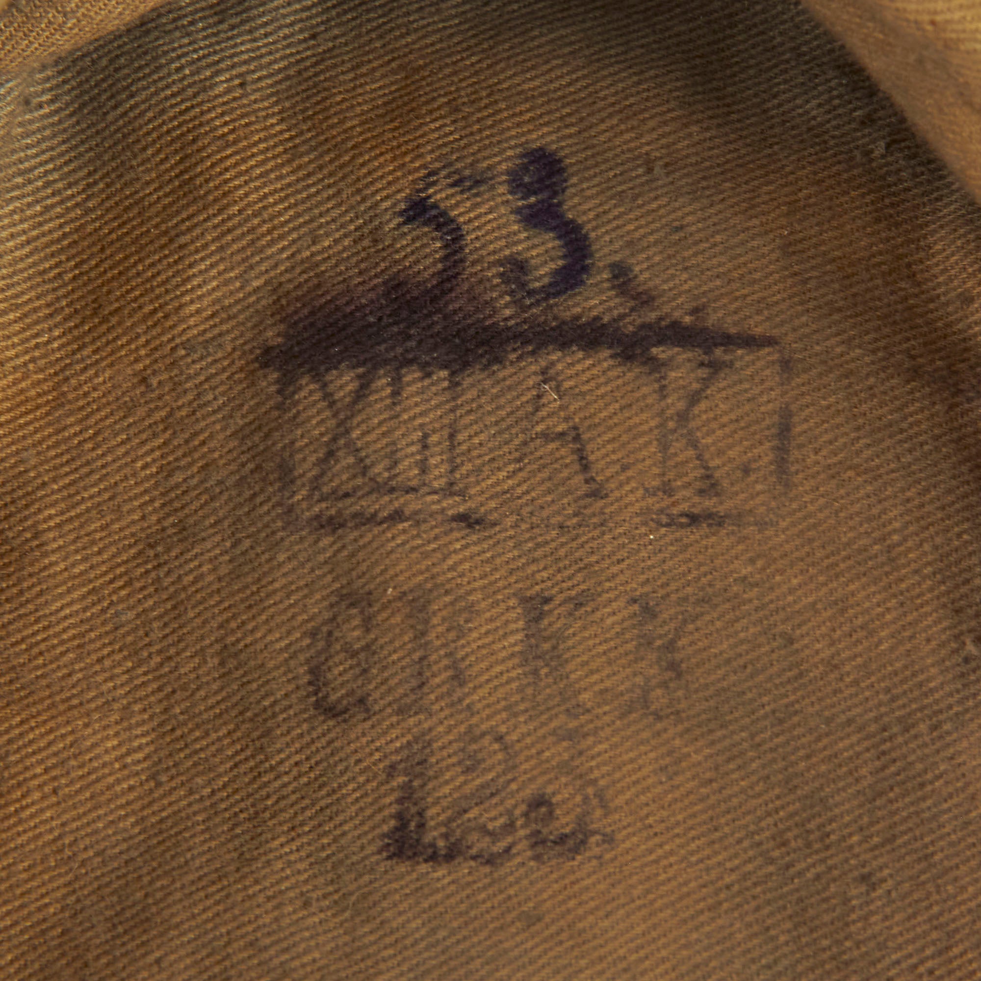 The cap is in very good used condition, with the expected wear and tear from having been through The Great War. There is some moth damage, and slight discoloration, but it still presents very well. The interior lining is in very good shape, with a faded but legible regimental marking: