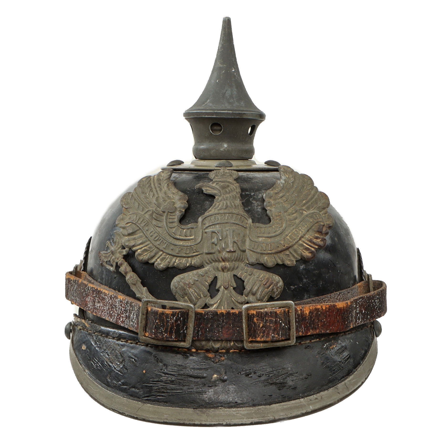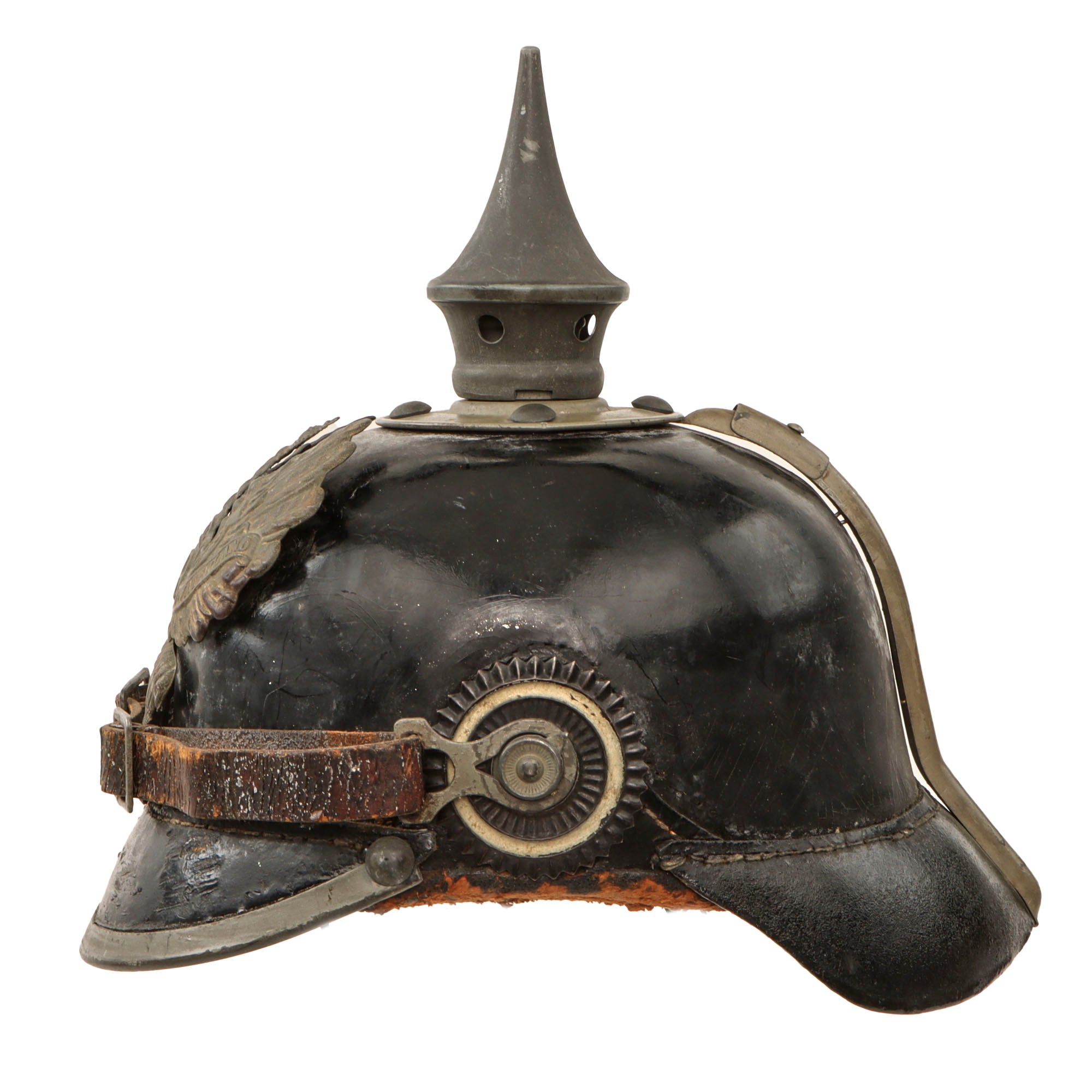 Original Item: Only One Available. This is an interesting example of an M-1895 Imperial Prussian Line Infantry enlisted man's Mannschaften (other ranks or EM / NCO) pickelhaube which appears to have been converted to an M1915 helmet. The M1895 was the final pre-1914 evolution in a long series of spiked helmets. It has a good condition oxide-plated steel Prussian spread eagle helmet plate and comes complete with supple original leather liner. The spike on top denotes infantry issue and the helmet retains both cockades and the original chinstrap.