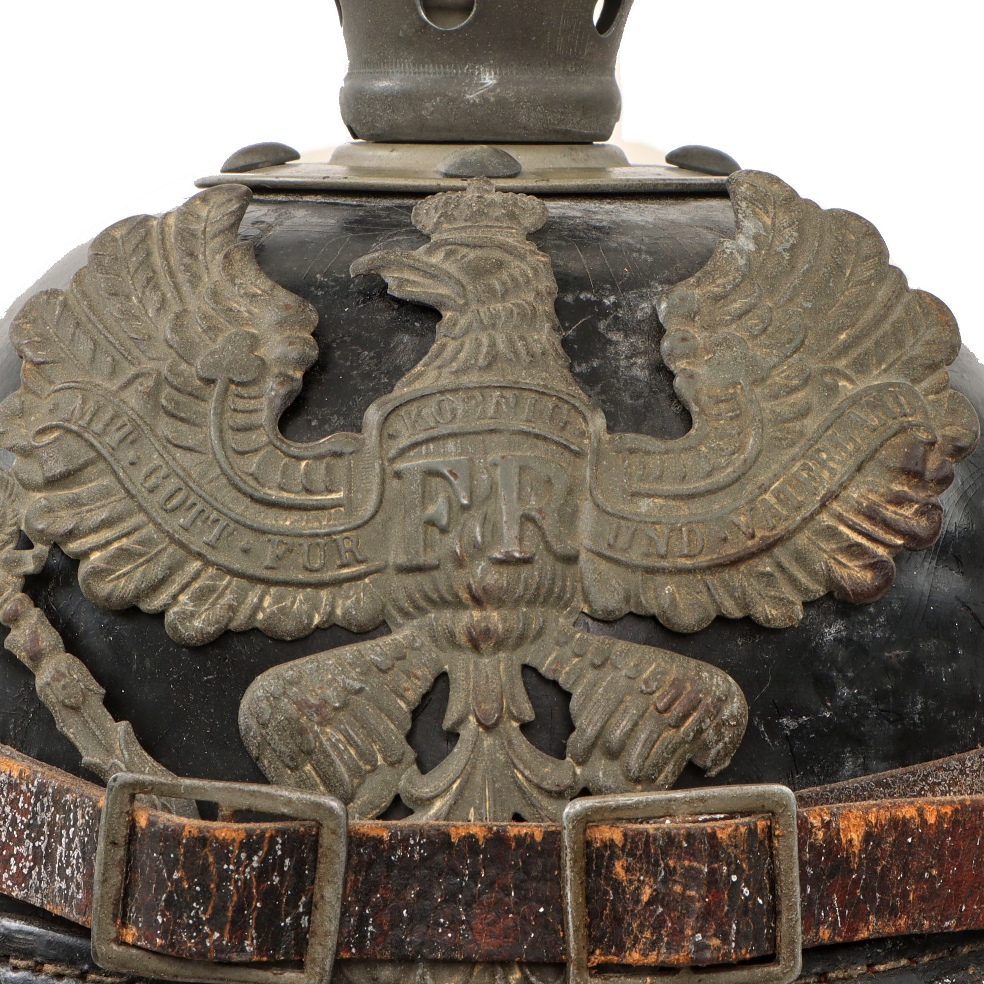 This helmet features an oxide plated steel frontplate (wappen), and the crown of this leather helmet displays a vented enlisted removable spike mounted on a steel baseplate, which is seized and no longer able to be removed. There is also a small adjustable vent on the spine that supports the rear skirt, only seen on the enlisted helmets, which is able to be moved still with some force. The front wappen features a crowned Prussian state eagle clutching a scepter, though the the right side foot and orb are broken off. The banner across the chest bears the King's motto, MIT GOTT FÜR KOENIG UND VATERLAND (With God for King and Country, i.e. Prussia). The wappen is missing both of the leather wedges and is loose, but thankfully it is partially kept in place by the chinstrap. It is also missing one of the two metal loops.