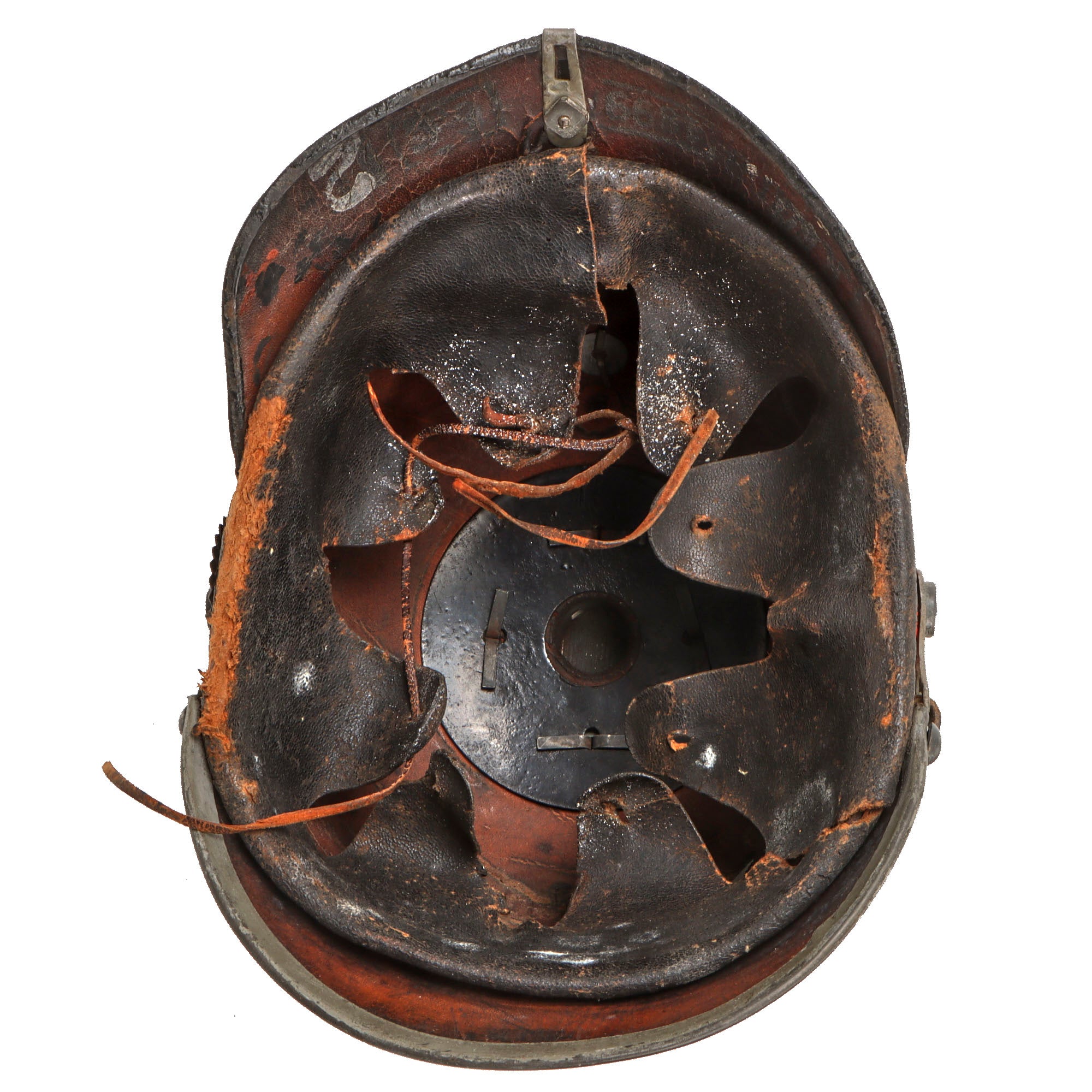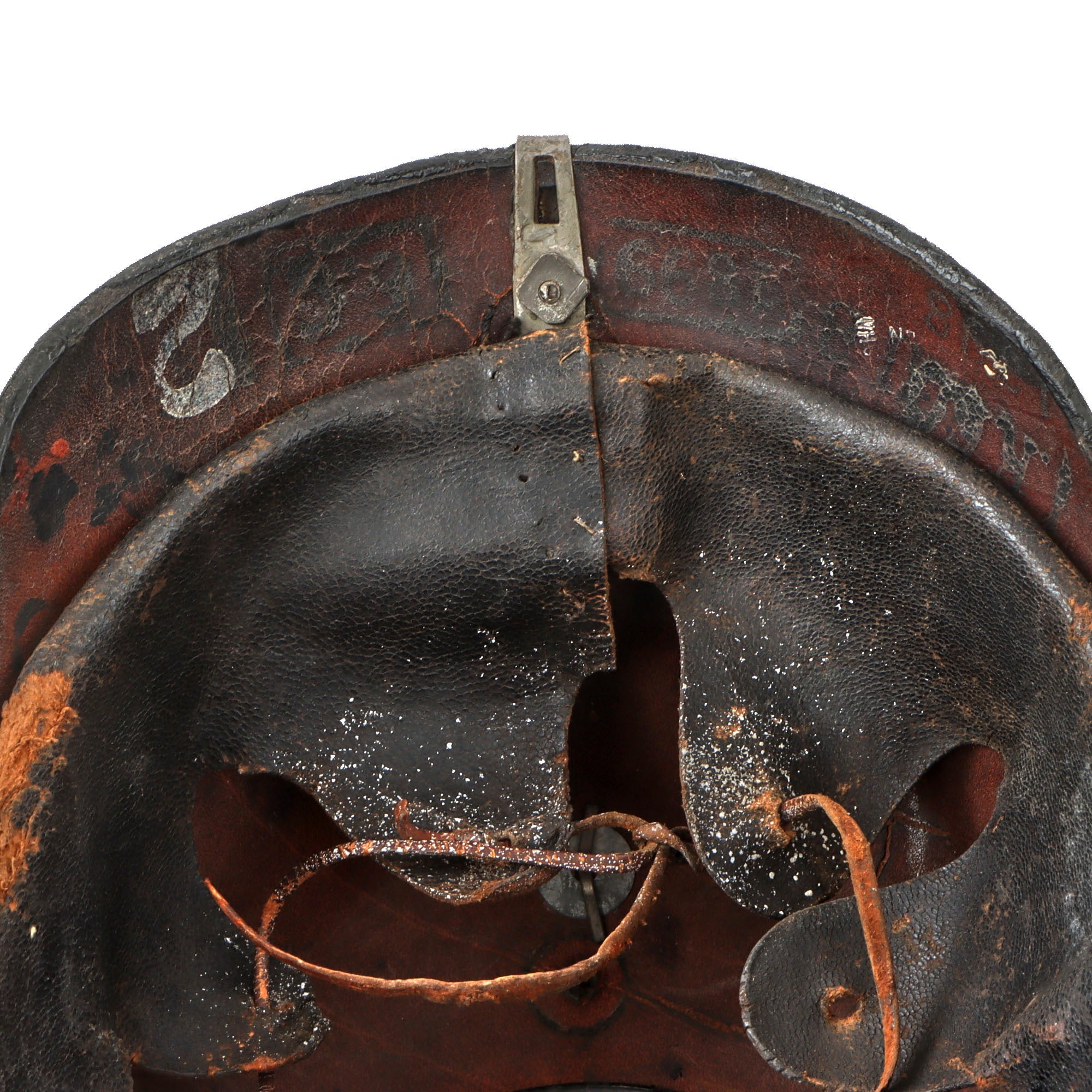 The original leather liner is intact but shows heavy wear, with some tearing as shown. The rear visor has several markings including: